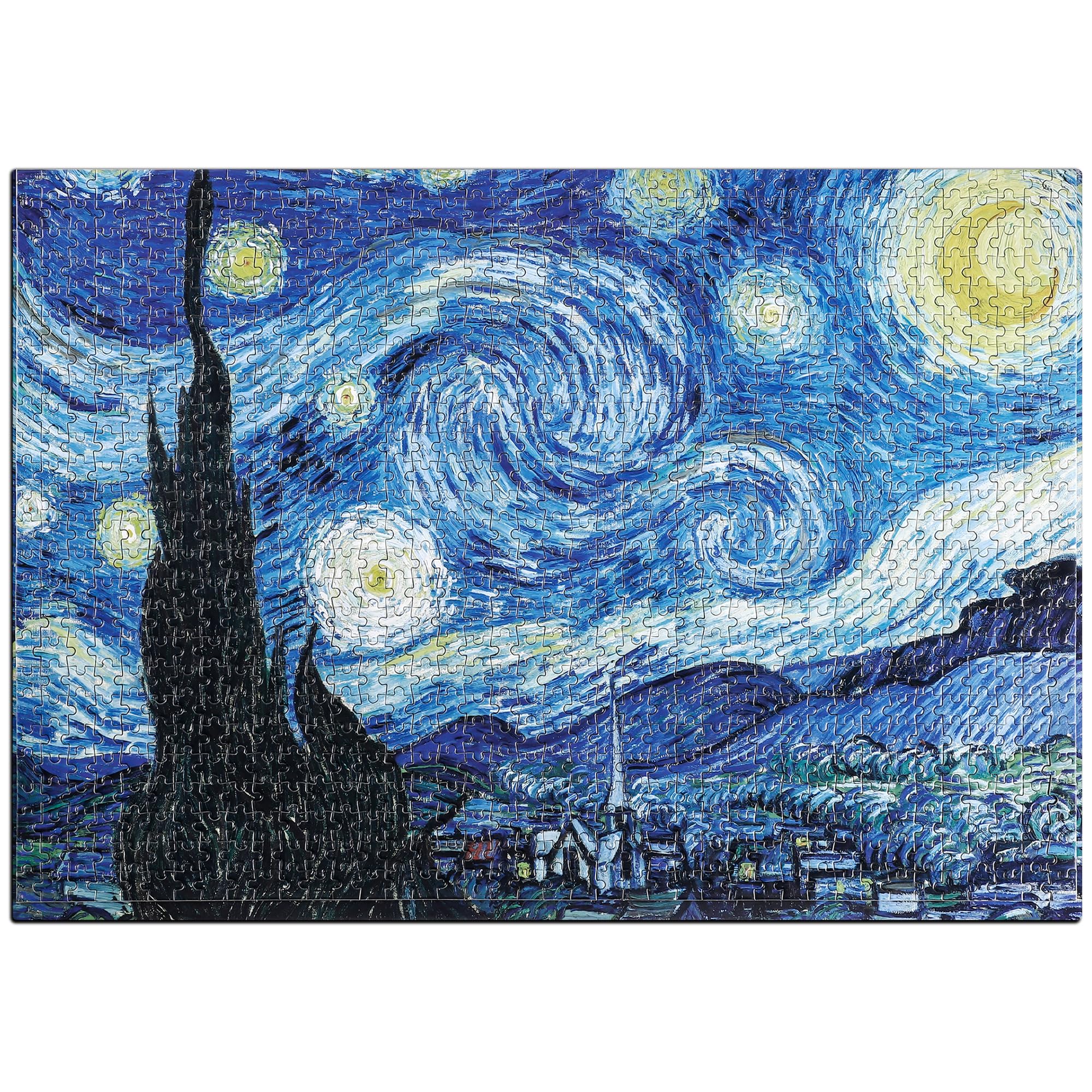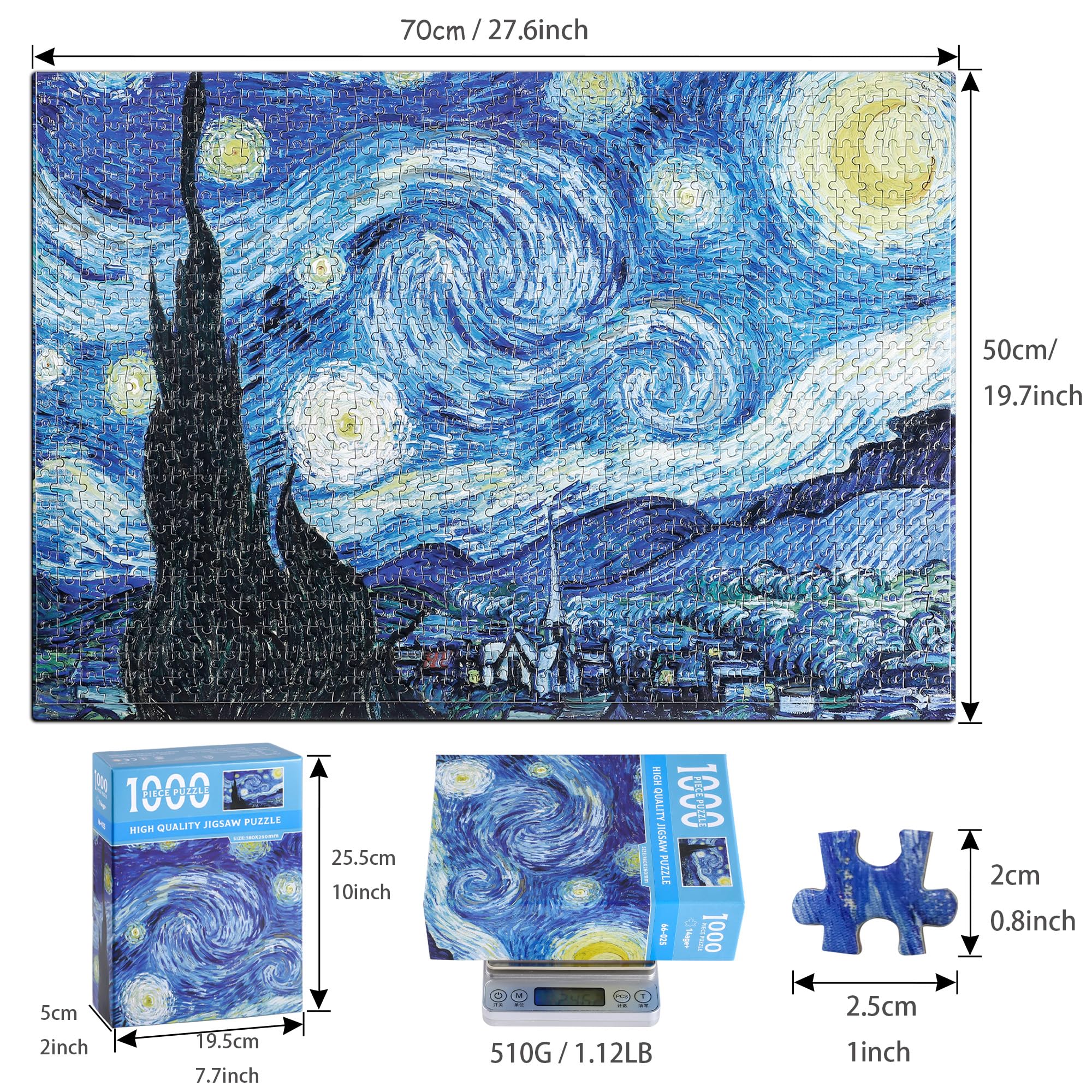 YOGEON Starry Night Puzzle 1000 Pieces Van Gogh Puzzle Puzzles for Adults. Puzzles Specification: ★ Material: paper ★ Weight: 1.61 pounds(0.73kg) ★ Size: 27.6 × 19.7 inches ★ Packing: High quality gift box ★ Recommend age: 14+ years old ★ Package Included: 1 x 1000-piece puzzle, completion pictures