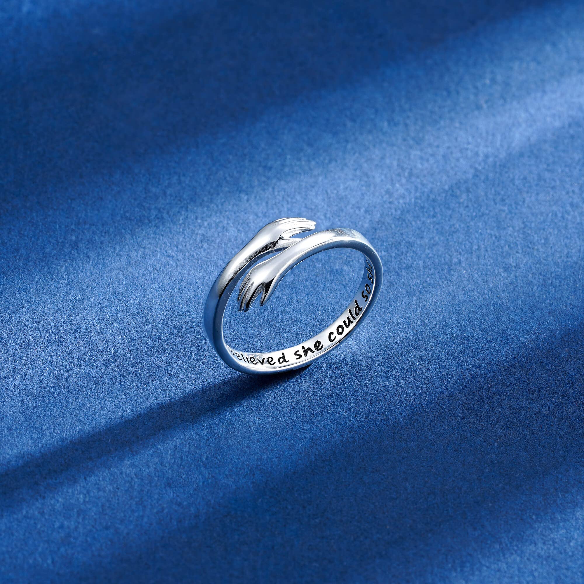 A hug is a symbol of comfort, encouragement, love, and protection. Engraved “She believed she could so she did”on arms to endow a unique meaning to this hug ring.It means wherever you are I will be always with you like this hug ring hugging you forever.