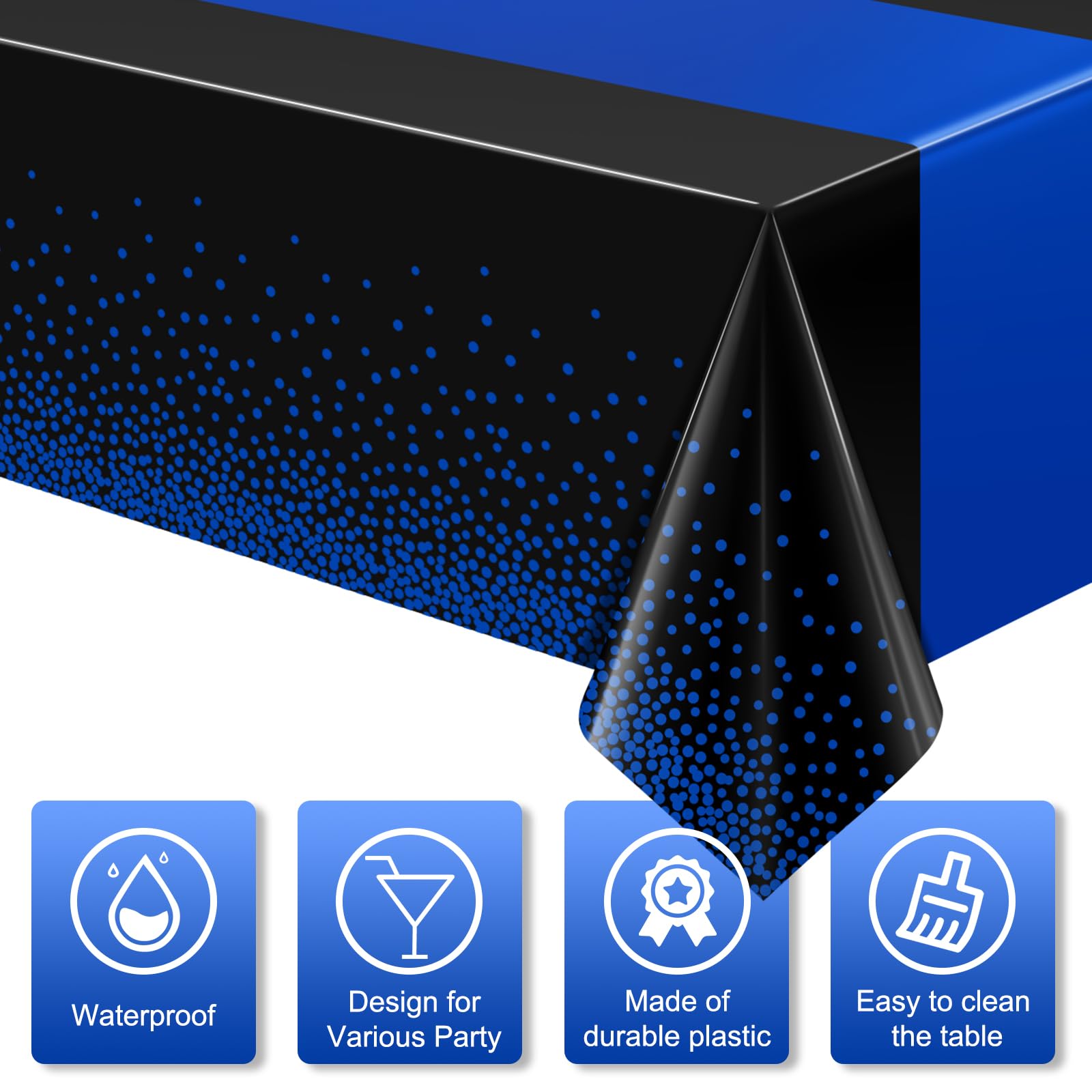 Large size:these plastic black and blue rectangle tablecloth measures approx. 137x274cm/54X108 inch, which fits for 8 feet long tables that can accommodate 8-10 people, It’s large enough for your to hold a theme party with your family and friends to share happiness