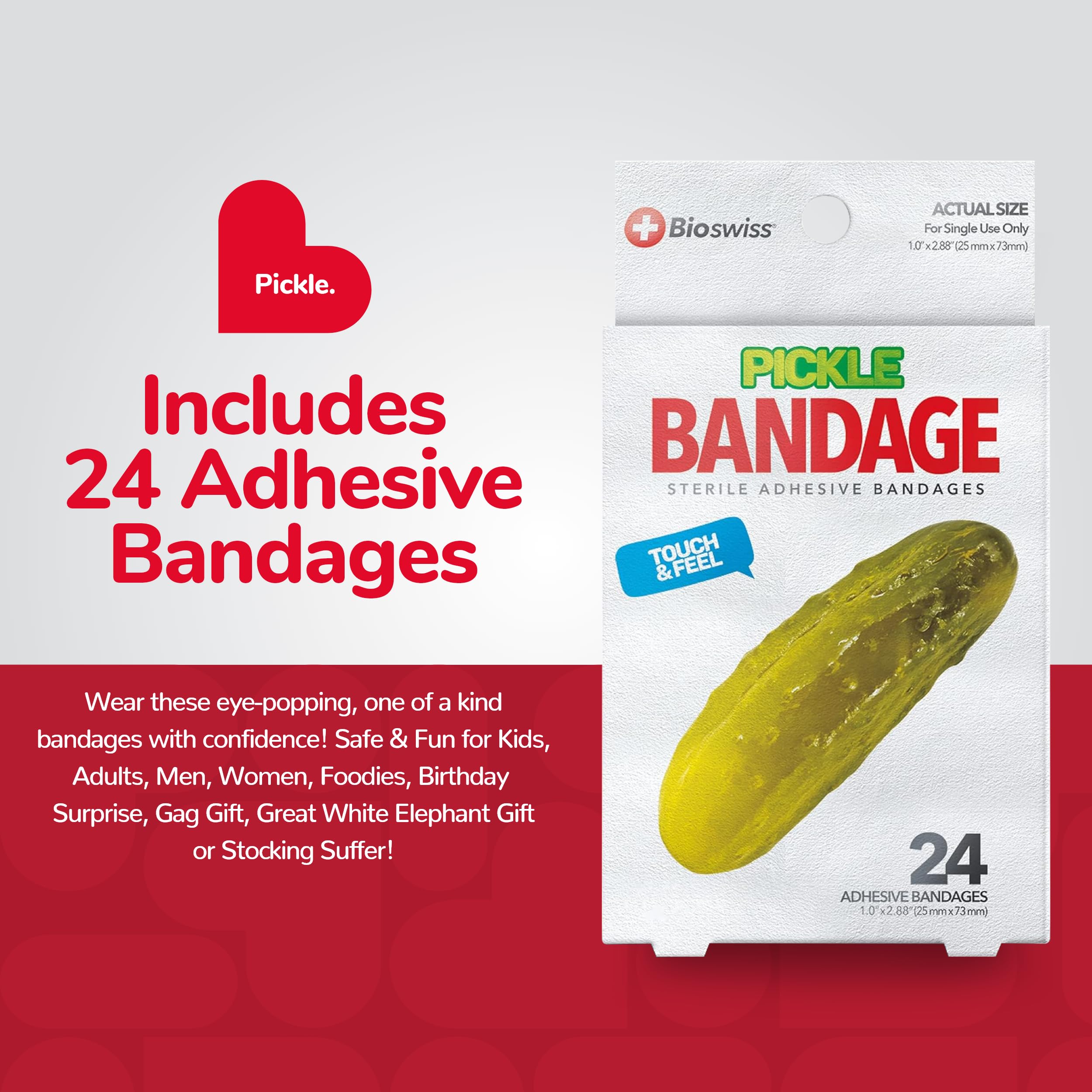24 PICKLE KIDS BANDAGES: Fun pickle-shaped adhesive bandages pack helps protect cuts, scrapes, and minor wounds while making healing less stressful for children