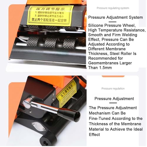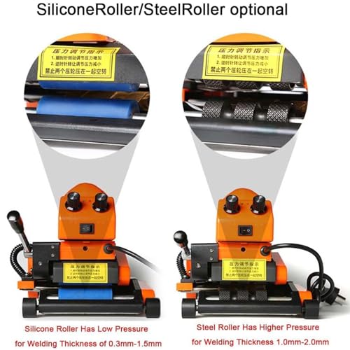 [DOUBLE PRESSURE WHEELS]The machine is equipped with two pressure wheels, which are to high temperatures and have a smooth and firm welding effect. The pressure can be adjusted according to the thickness of the film. The silicone roller is suitable for 0.2~1.5mm PE and EVA; the steel roller is suitable for 1-2mm PVC.