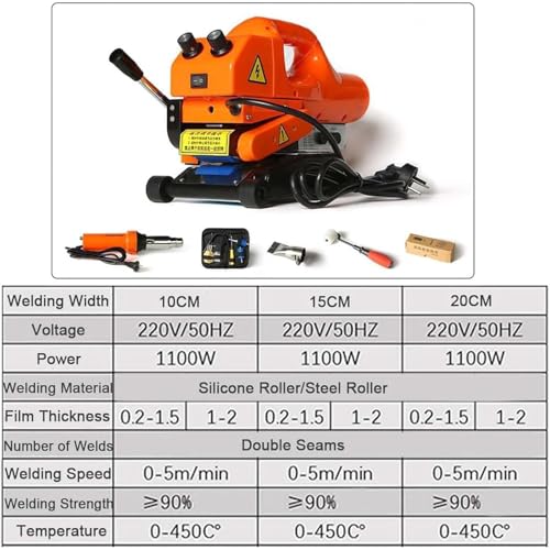 [TECHNICAL PARAMETERS]Voltage: 220V; Frequency: 50Hz; Power: 1100W; Welding speed: 0.5-5m/min; Heating temperature: 0-450 degrees; Covering width: 10cm/15cm/20cm; Welding width: 12.5mm×2/16mm×2/16mm×2; Seam strength: >95% of the base material (tensile strength in the cutting direction), machine weight: 5.3 kg; Insulation level: Level 2