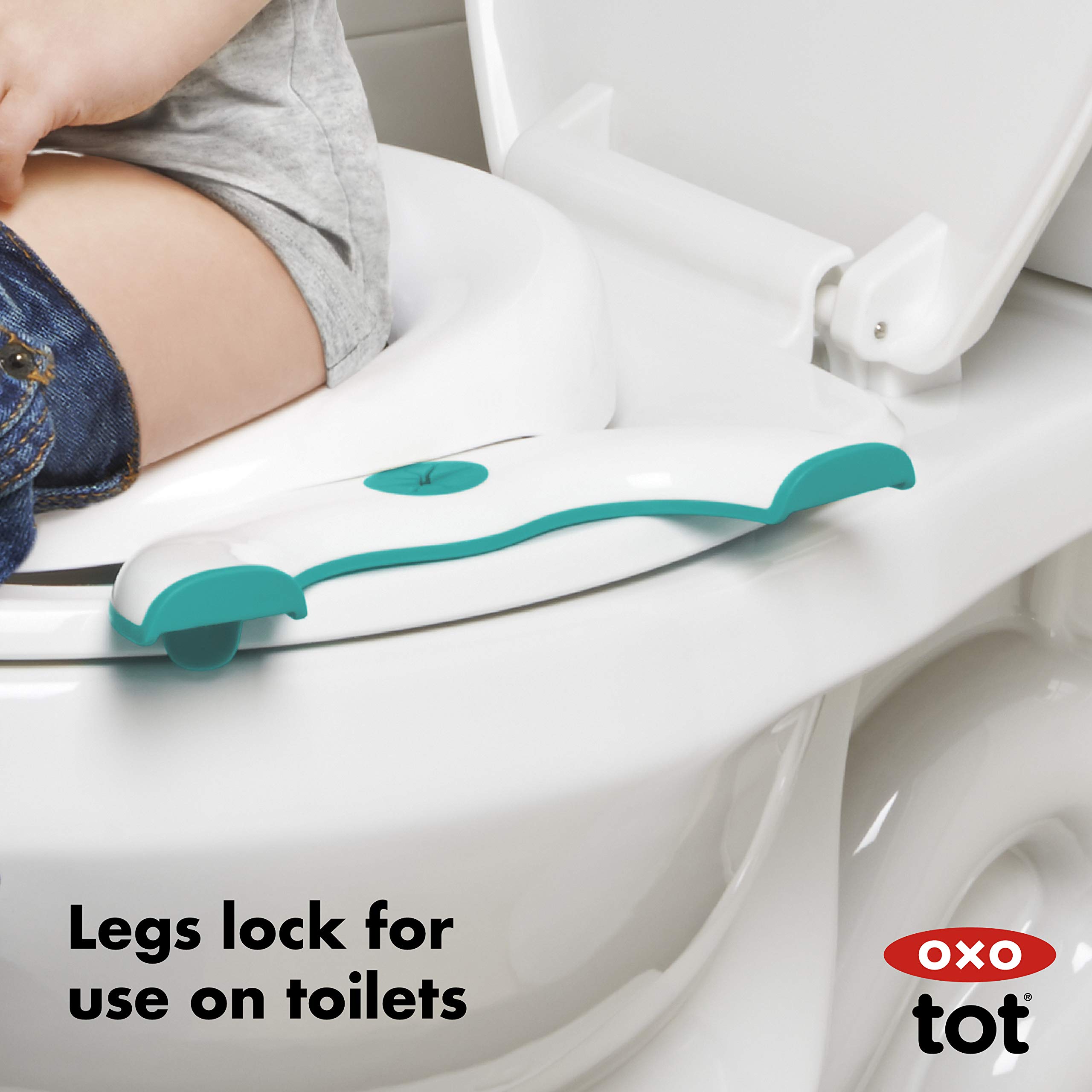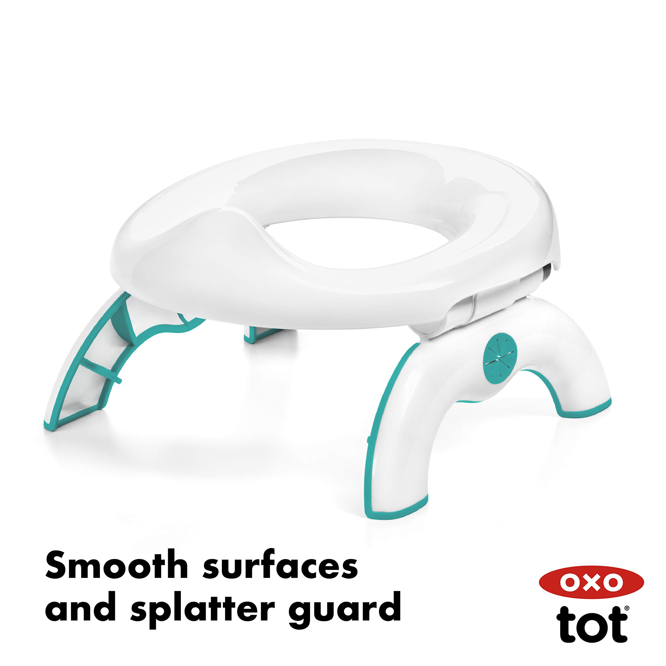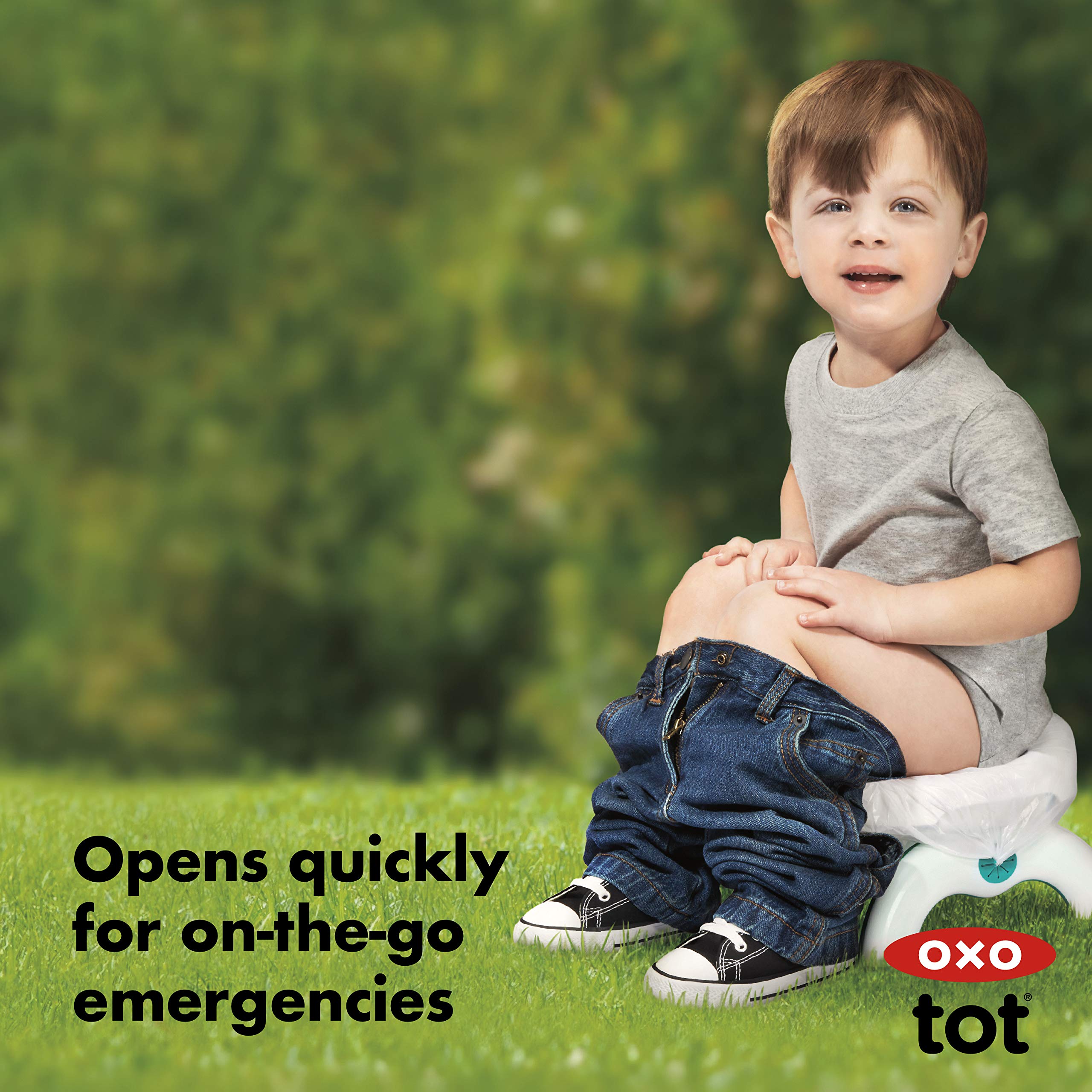 Be prepared for on-the-go potty emergencies with the OXO Tot 2-in-1 Go Potty. The Potty opens quickly and easily and works alone (with disposable bags), or as a seat that rests on top of toilets. The legs lock at the ideal height for growing tots, and soft, flexible flaps hold disposable bags securely in place. Three disposable bags with absorbent pads are included, and refills are available, plus the Potty can accommodate standard plastic bags in a pinch. The legs fold all the way out and non-slip grips keep the Potty stable on round or elongated public toilets. The small seat is sized for little bottoms and the generous shield prevents splatter. The smooth surfaces are easy to clean and the legs fold in, allowing the Potty to fit into the included travel bag for storage in cars, strollers or diaper bags.