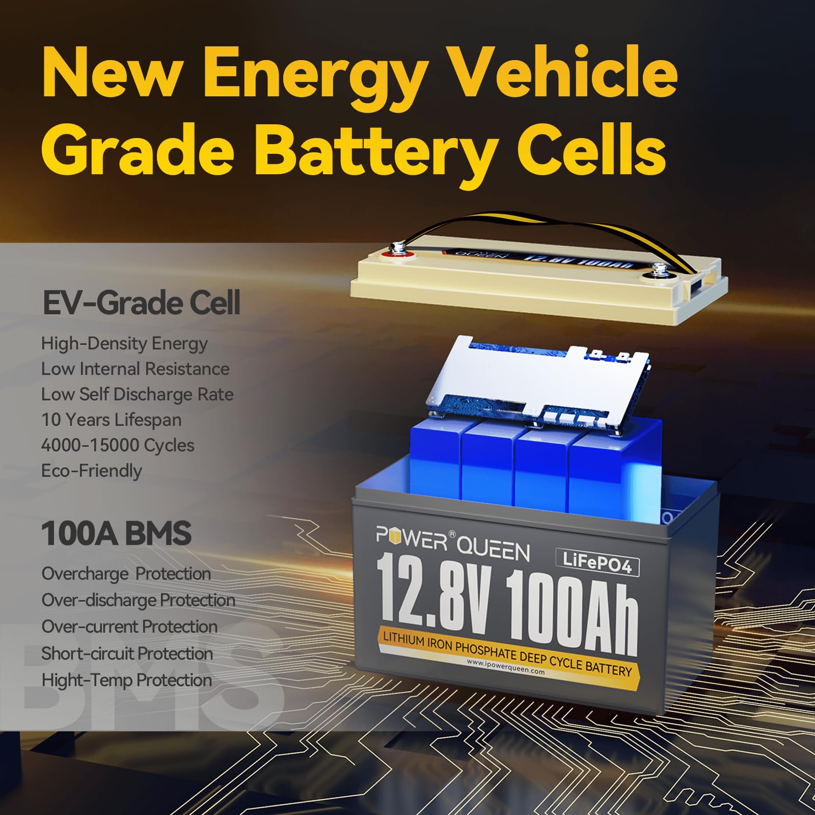 【Extendible Storage For Various Scenarios】Power Queen 12.8V 100Ah LiFePO4 batteries support up to 4 in series or 4 in parallel (Max 4S or 4P) to get more capacity (100Ah , 200Ah, 300Ah, Max.400Ah) and higher voltage (12.8V, 25.6V, 38.4V, Max.51.2V). Our customer usually connected it in parallel/series and used on camper RV, solar home system, trolling motor.