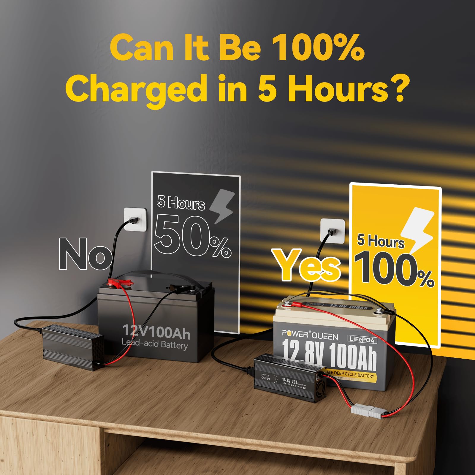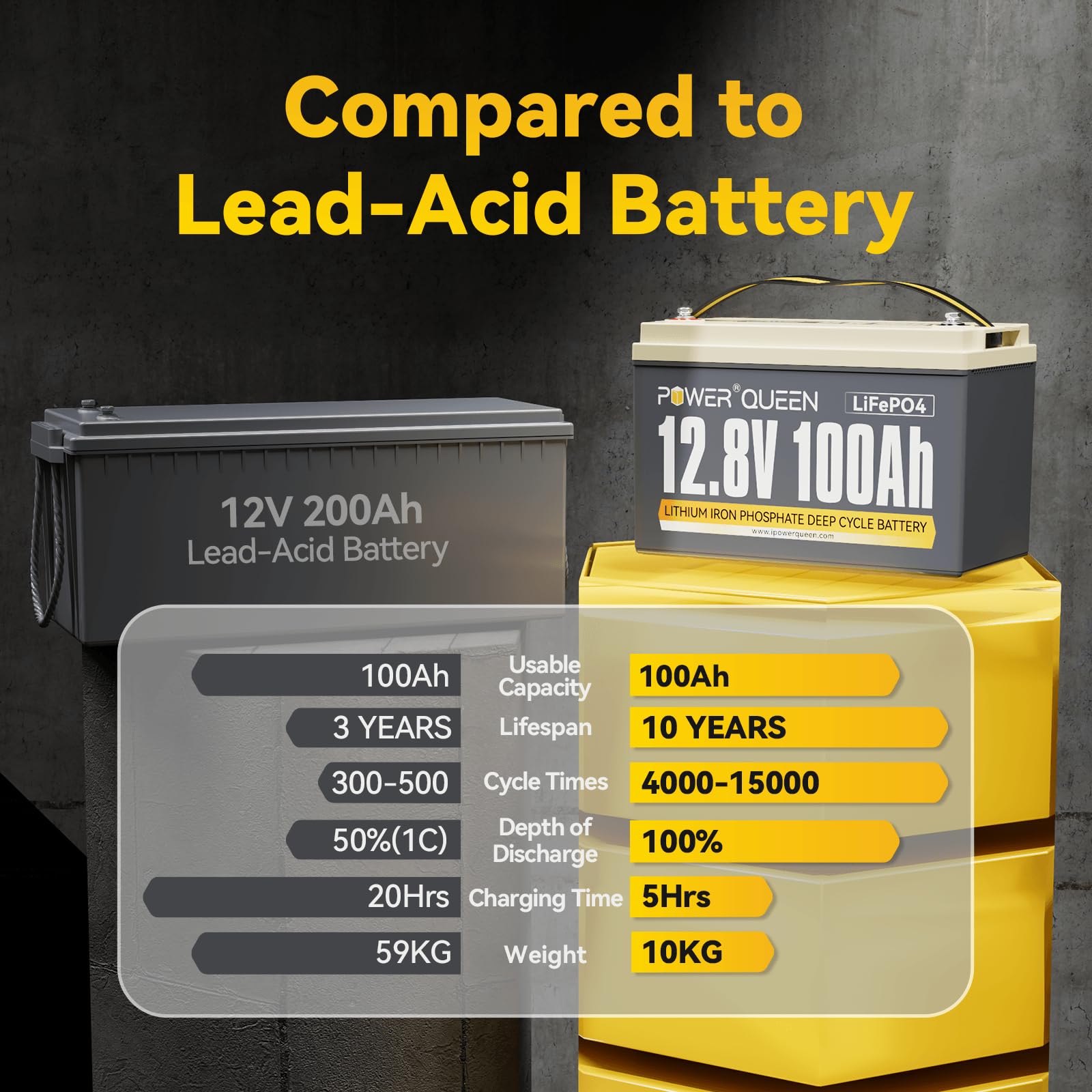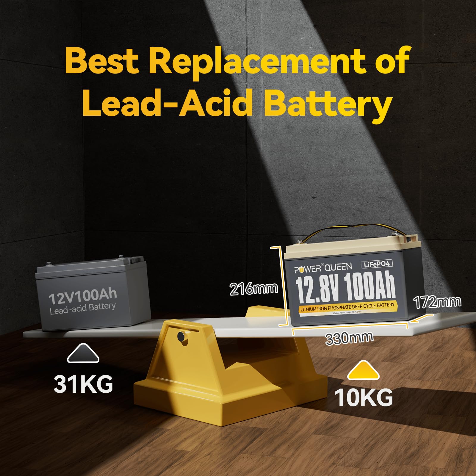 【Half Lightweight And Twice Capacity】Power Queen 12.8V 100Ah LiFePO4 battery weighs only 24.25 lbs, only half weight and providing twice capacity in the same size as lead-acid batteries, you can easy to move and install. And our LiFePO4 battery is 100% usable capacity compared with lead-acid battery only provide 60%~70% capacity, which can be tested by a percent state of charge meter.