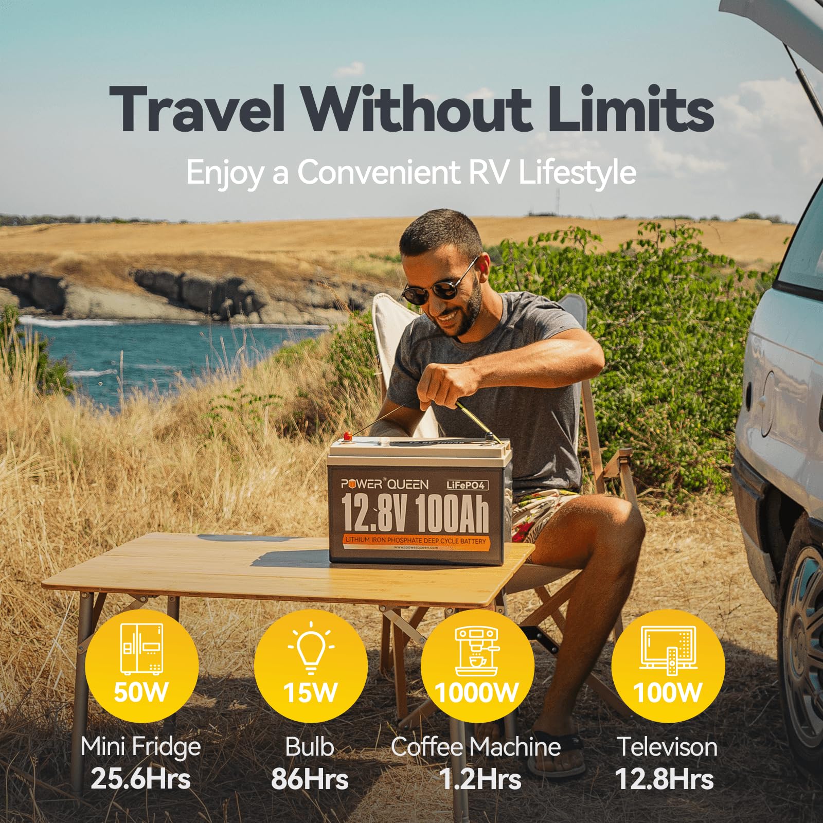 【Eco-Friendly Energy & Save 1/2 Power Fees】Power Queen 12.8V 100Ah LiFePO4 battery provides up to 15000+ cycles times and 1280Wh energy, which means our 100Ah battery produces more energy in its 10-year lifespan, which means you will save 1/2 of power fees compare with using the utility power. Our LiFePO4 batteries are widely used for solar system, RV trip and outdoors activities, you could enjoy self-reliant colorful life when using the battery in solar source.