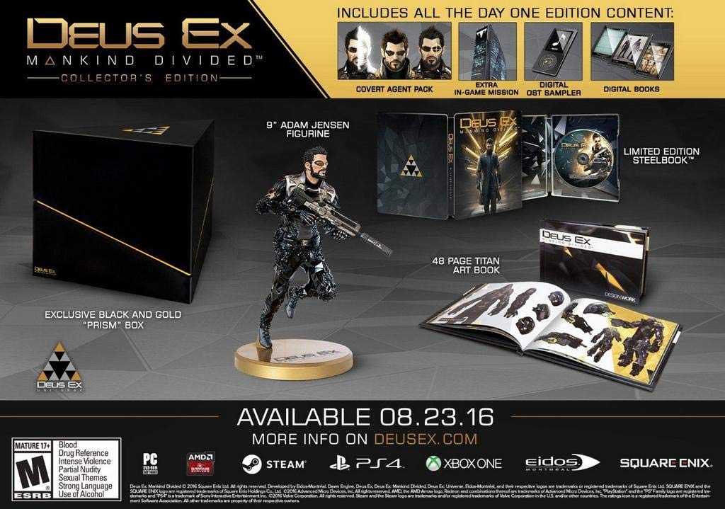 Xbox One edition. CE includes Day 1 Edition Game with: Classic, Enforcer and Intruder In-Game DLC Packs, Digital Novella, Digital Comic Book, Extra in-game mission, Digital Artbook and Digital OST Sampler plus 9" Adam Jensen Figurine, 48 pg Titan Art Book and LE Steel book