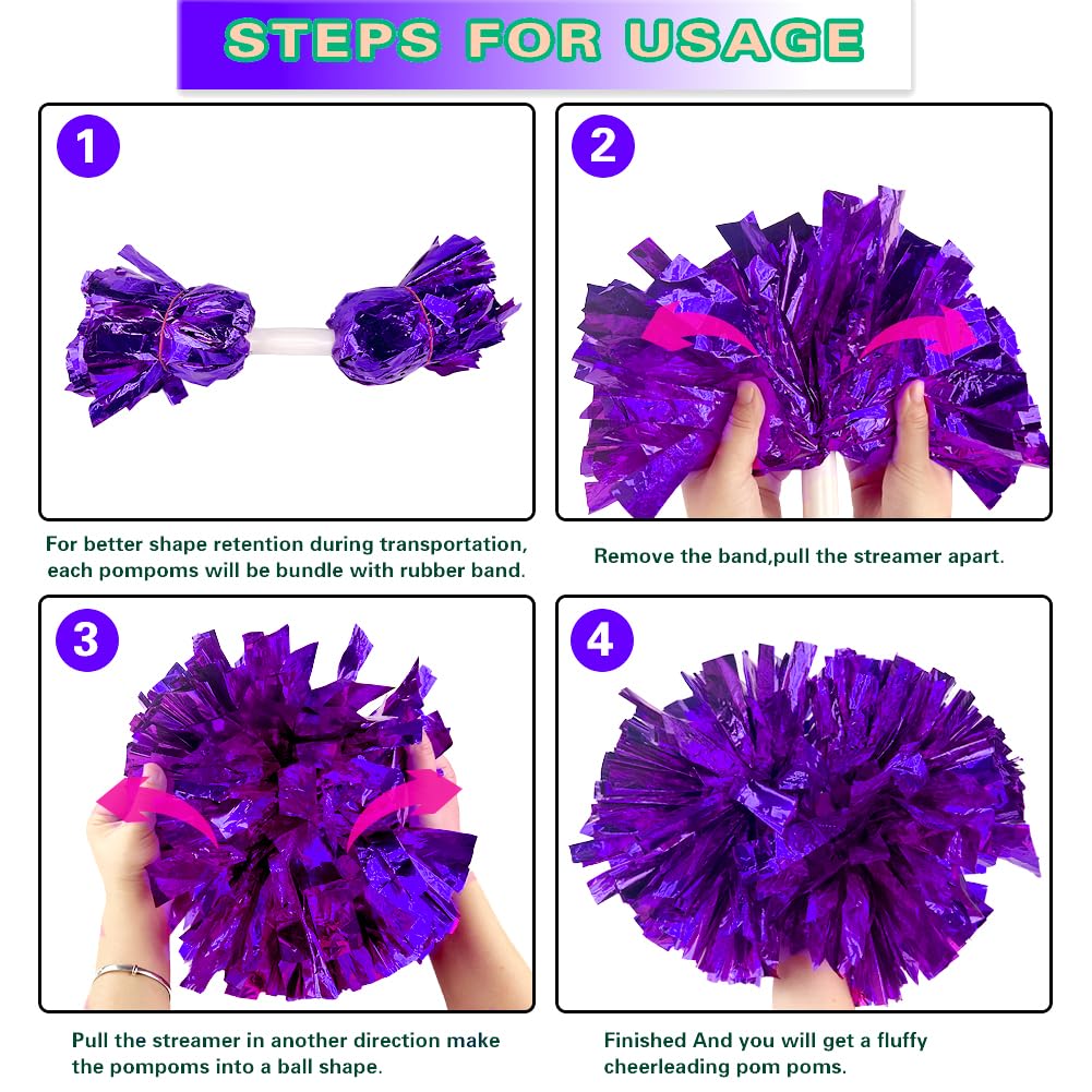 Note for Use - When you first received the cheering pom poms, They were tied up for transportation, please use your fingers to pull the streamers apart, after several time of use, the pompoms will become more fluffy, then it will achieve the effect shown in the picture