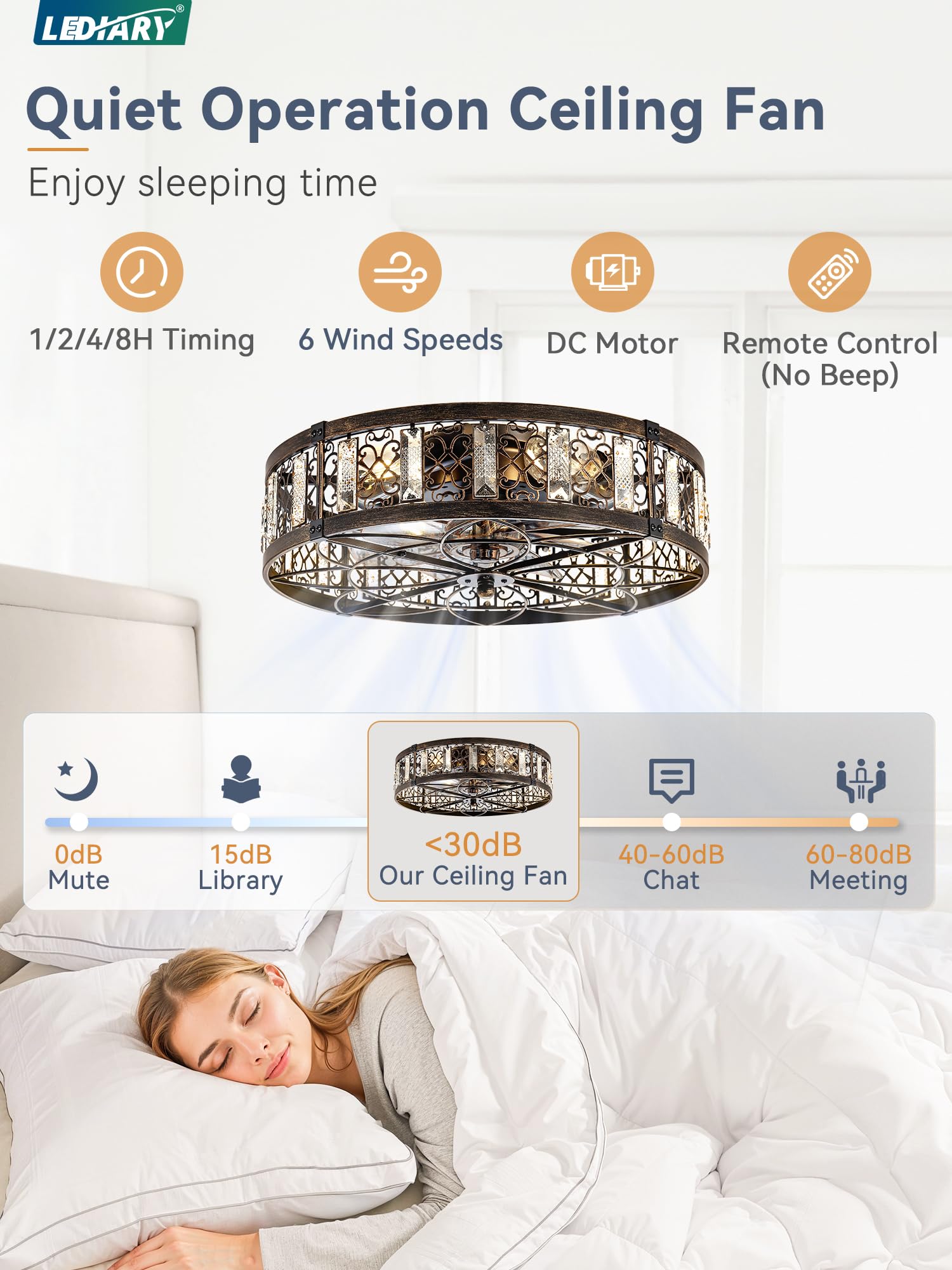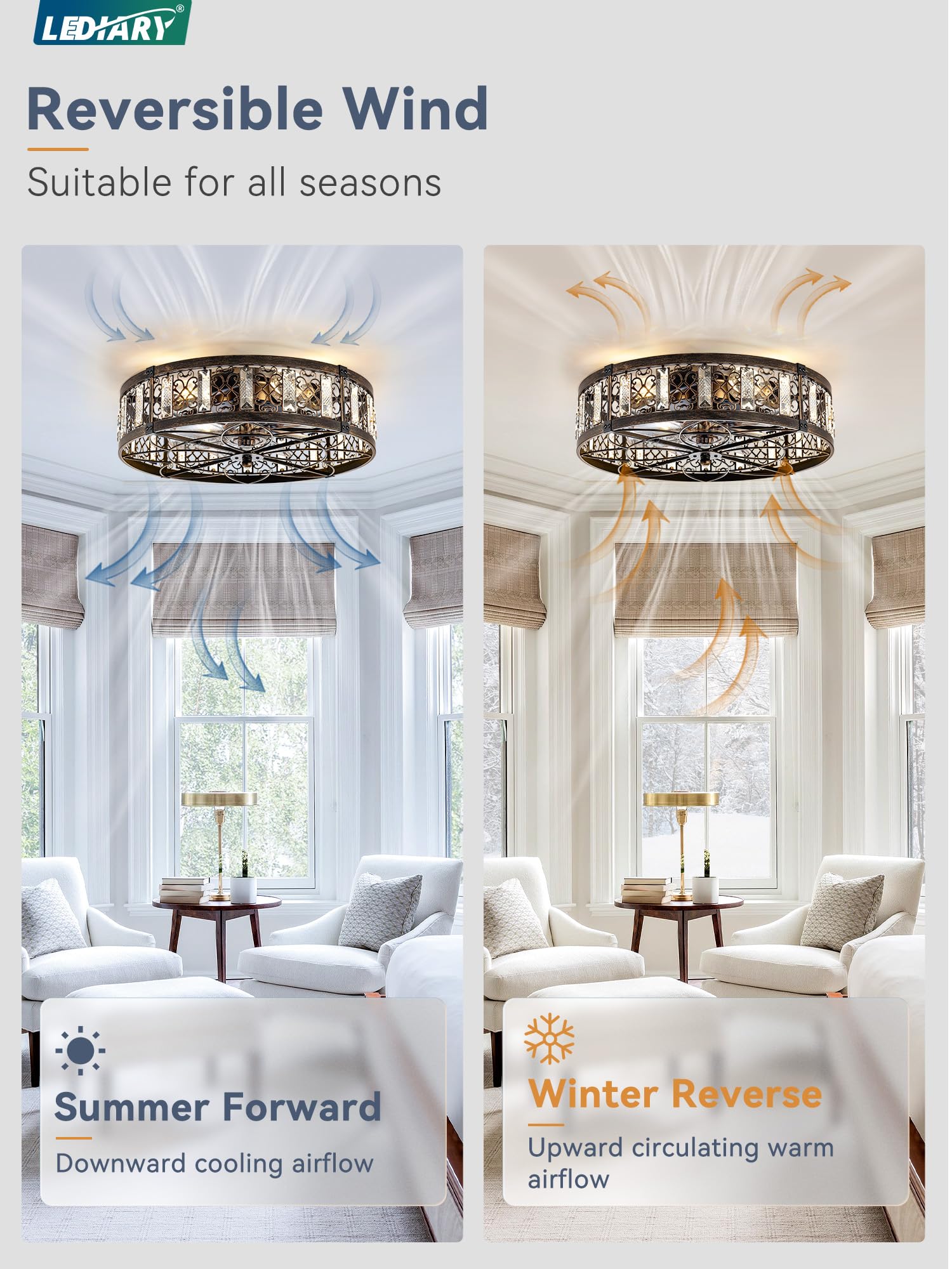 Function:This enclosed bladeless ceiling fan with lights features a reversible DC motor for year-round use. Choose from 6 speeds, set 1/2/4/8 hour timer, and control with the remote—all below 30dB with no beep.