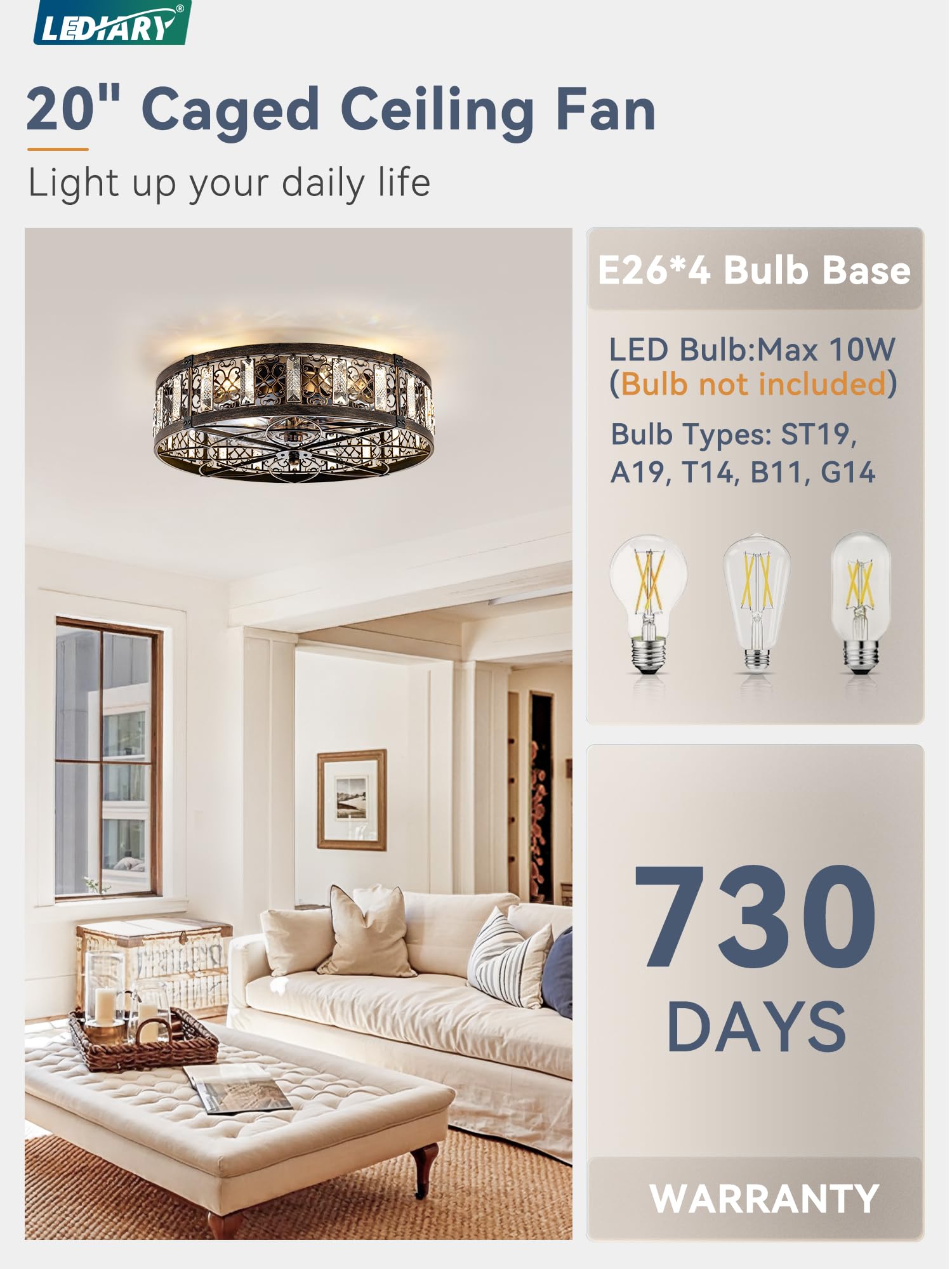 Easy Installation & Bulb Compatibility:This Low Profile Farmhouse Enclosed Ceiling Fan with Light includes all mounting hardware and quick-install instructions for hassle-free setup. Accommodates 4 E26 standard bases, max 10W per LED bulb—compatible with A19, ST19, B11, G14, and T14 bulb types.
