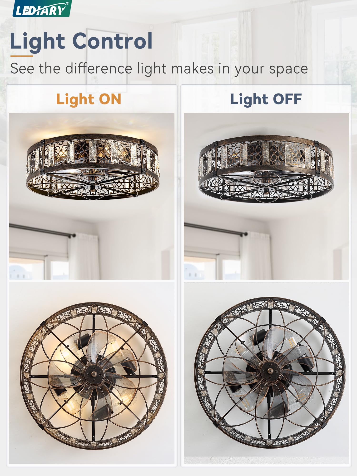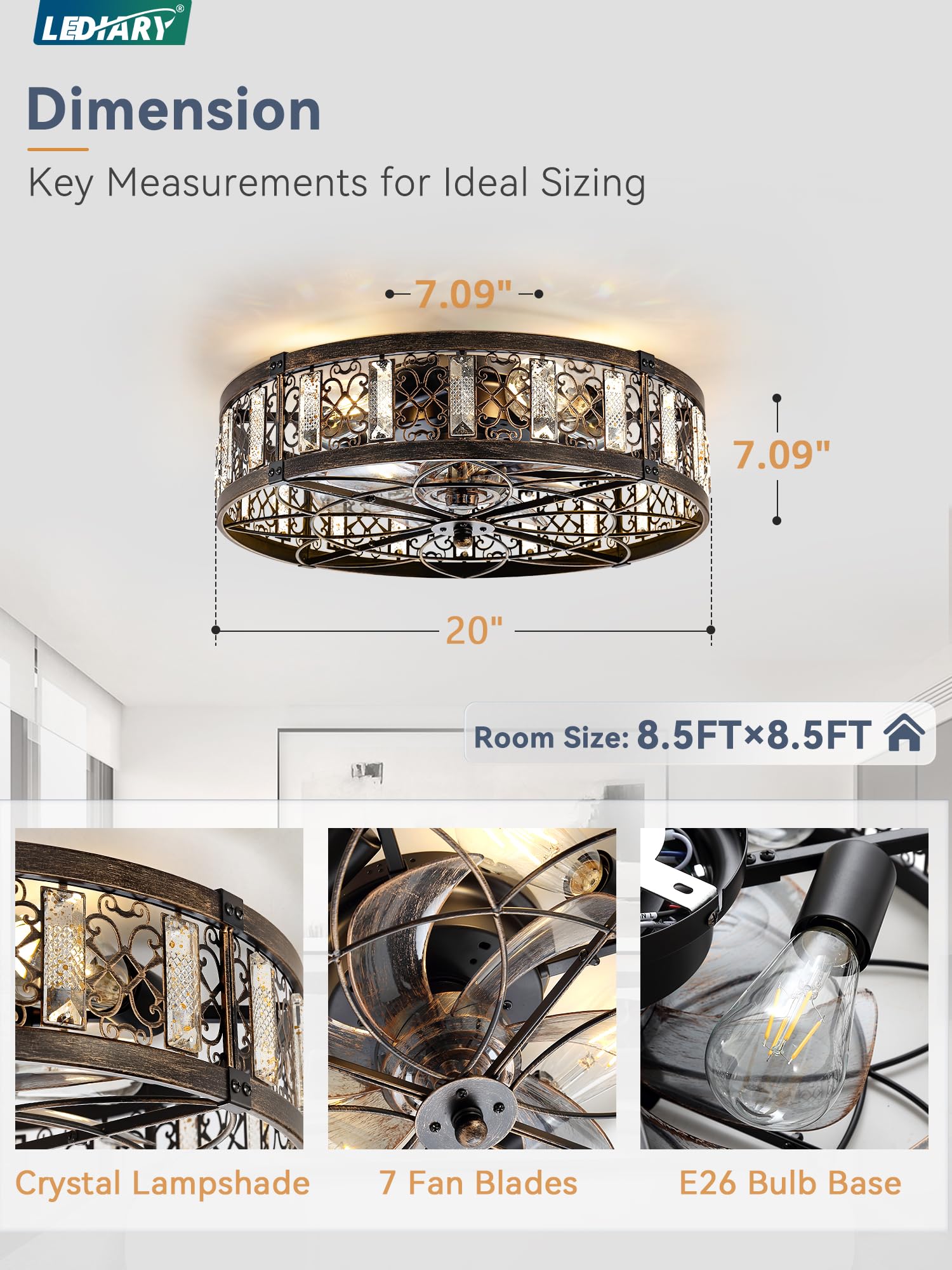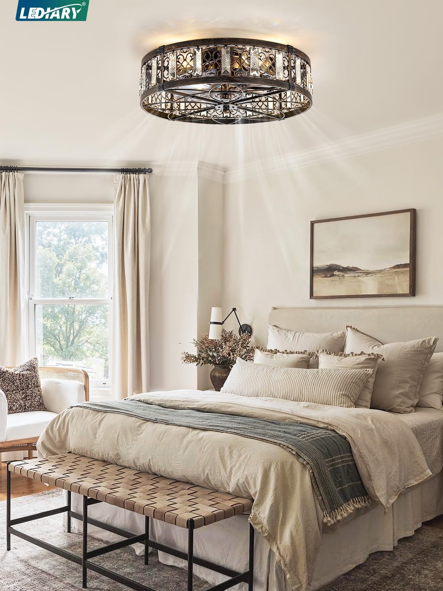 Victorian Caged Fan with Crystals:This 20-inch caged ceiling fan with lights features hand-finished black-and-gold metalwork. The cage and crystals undergo 3+ hand-antiquing processes, taking over 3 hours to craft. It blends Gothic charm with modern functionality—a refined centerpiece for classic interiors.