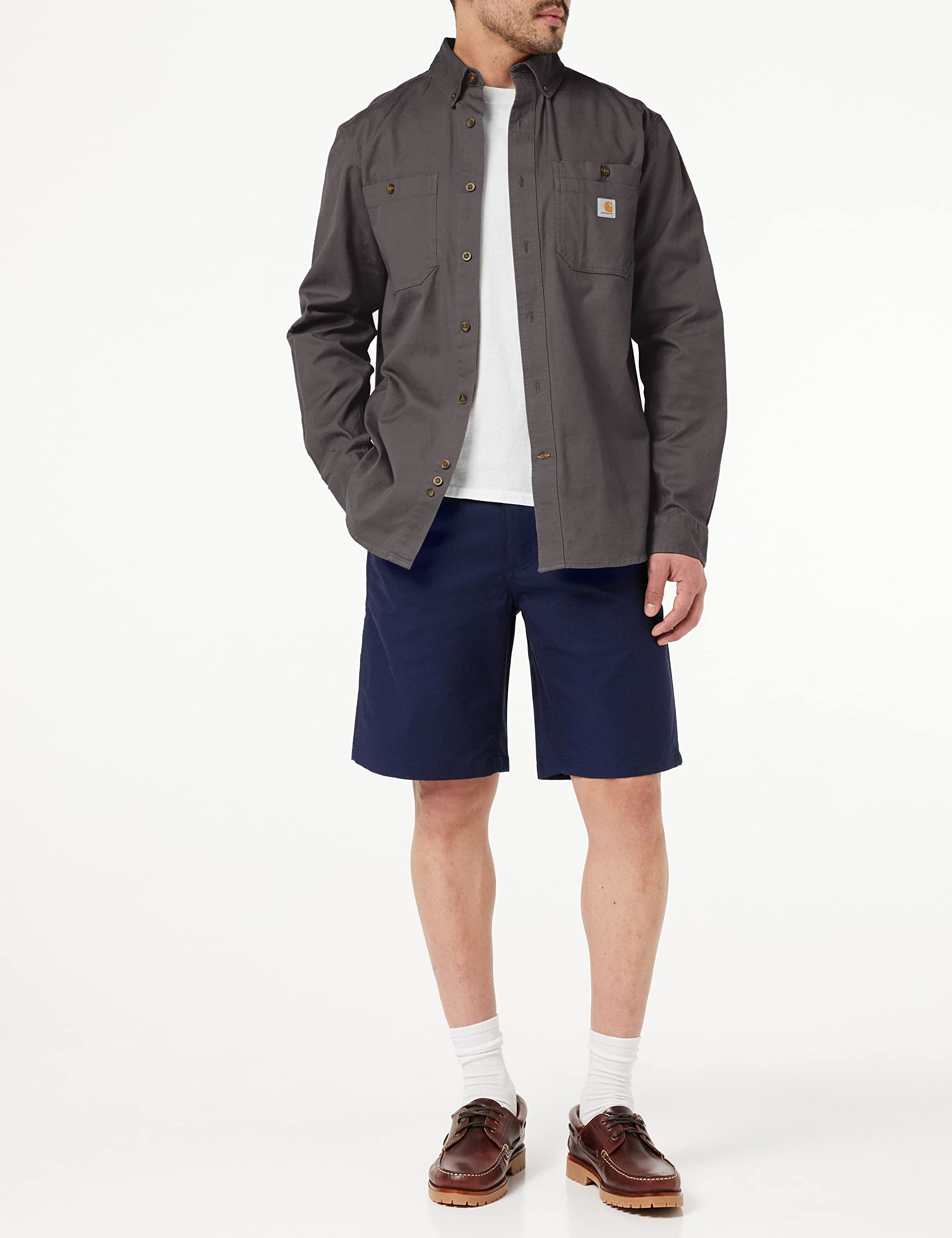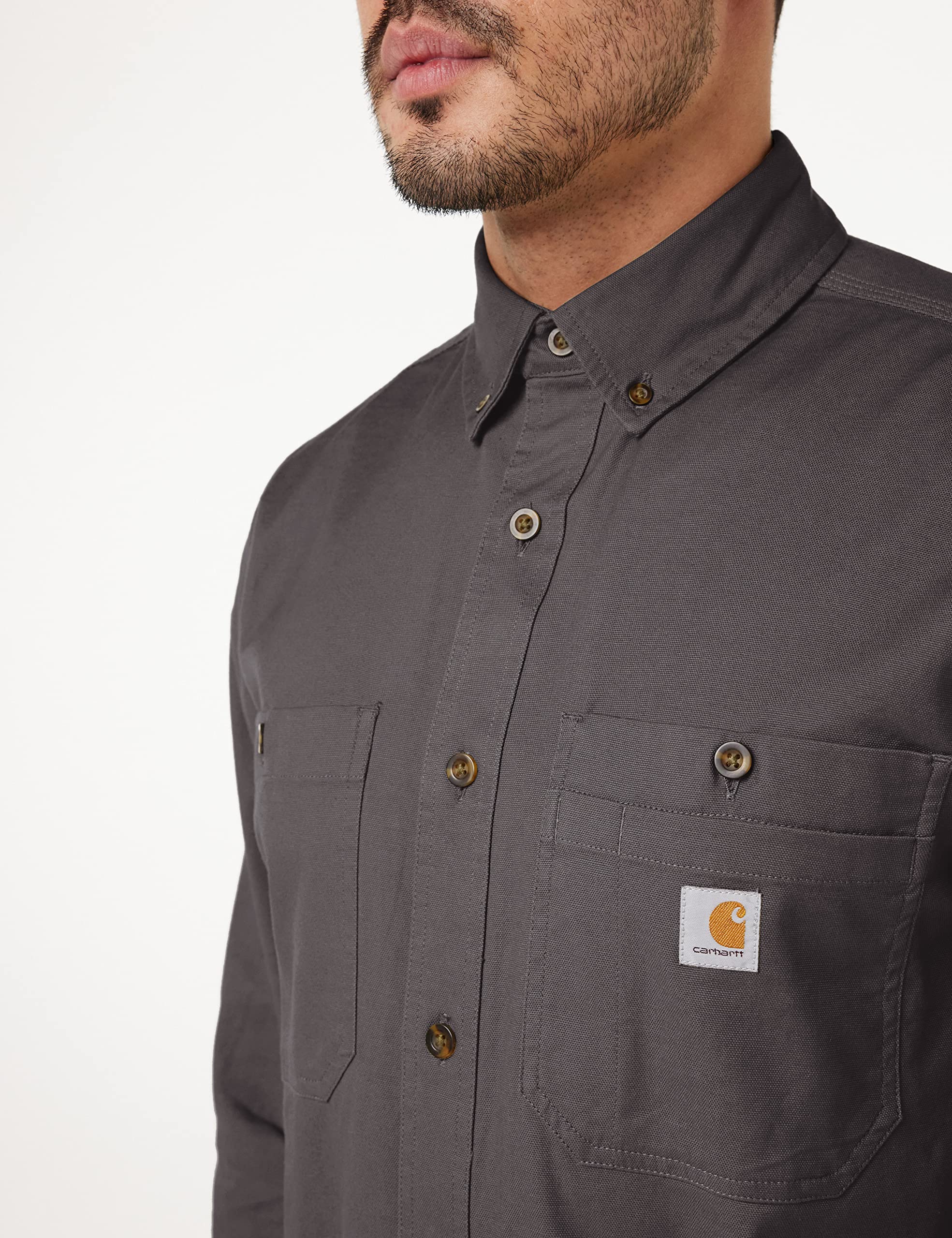 Description This durable work shirt comes standard with built-in stretch, so whatever you're doing, it's easier to do. Relaxed fit 6.5-Ounce, 98% cotton/2% Spandex rugged flex technology for ease of movement two chest pockets with additional left-chest pocket panel for added storage button-down collar two-button adjustable cuffs with extended plackets faux horn buttons drop-tail hem for additional coverage Carhartt-strong triple-stitched main seams imported