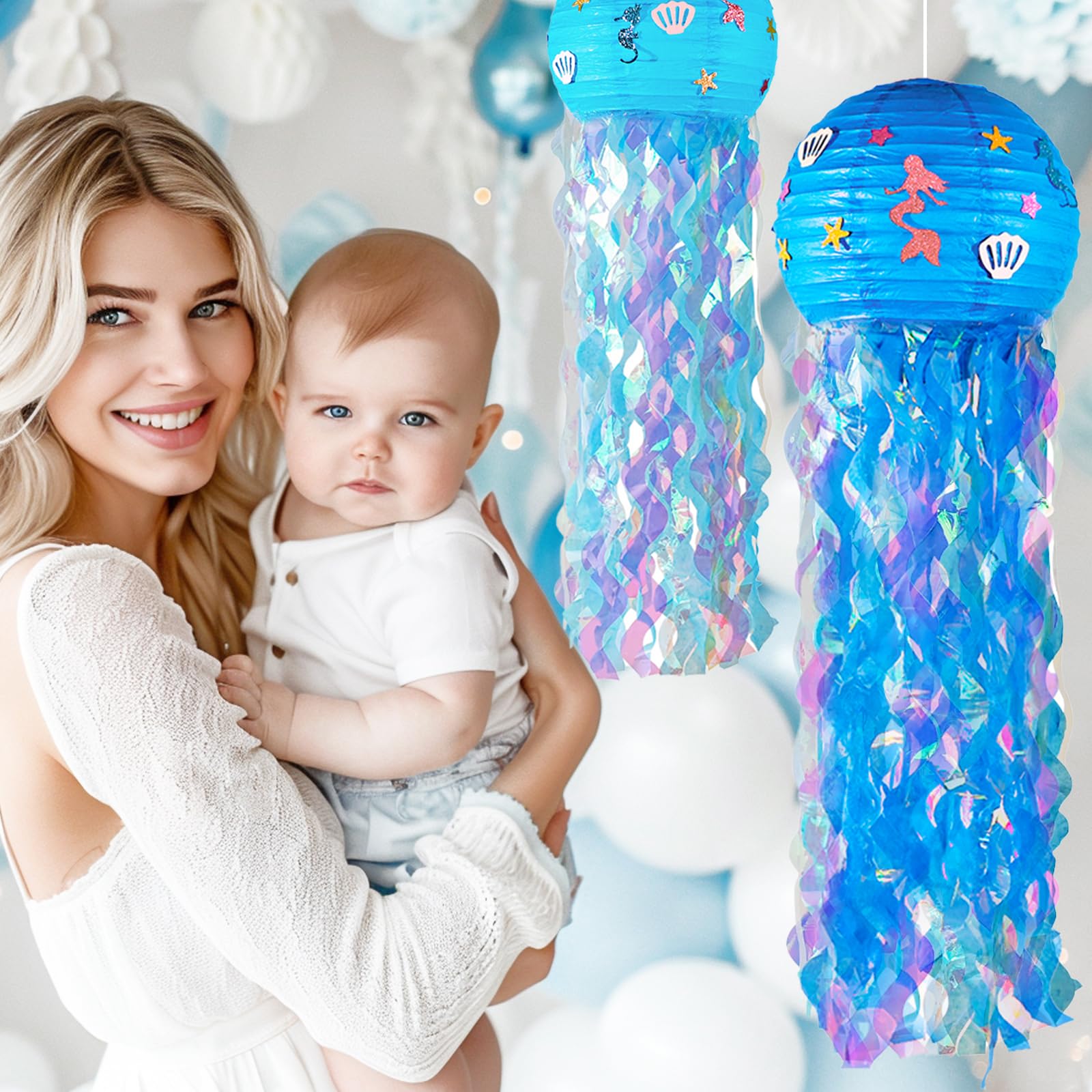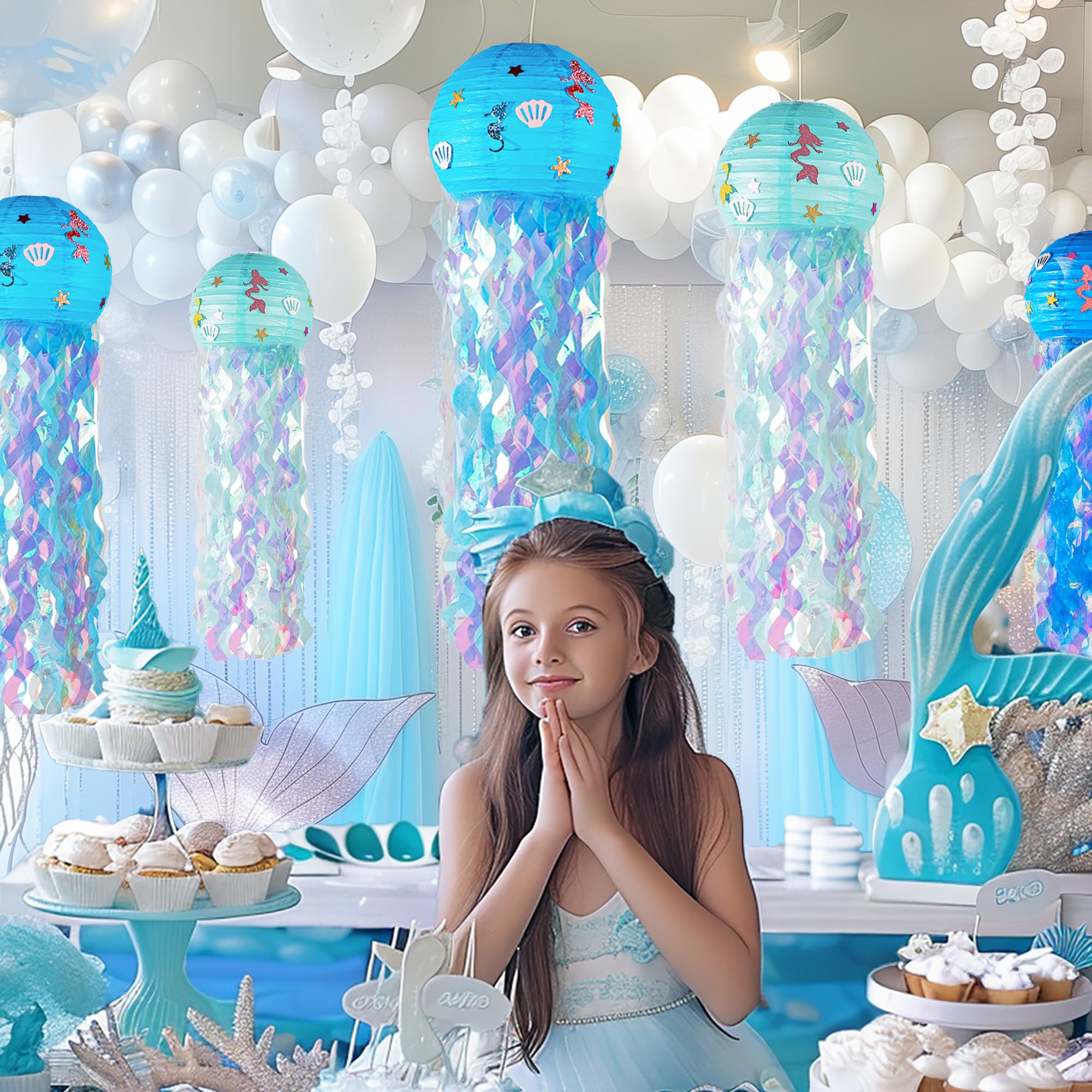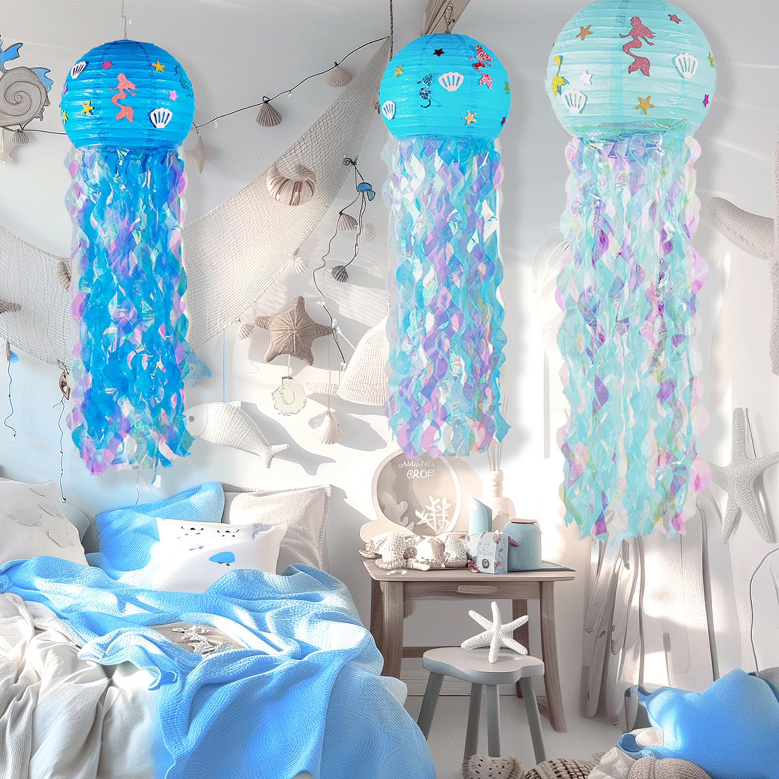 â¨ăHigh-Quality & Stunning Ocean-Themed DesignăMade from eco-friendly, high-quality paper with iridescent streamers, these lanterns shimmer beautifully under light, creating a mesmerizing underwater effect. The detailed sea creature stickers, including mermaids, seahorses, fish, and seashells, add extra charm, making them a stunning focal point for ocean-themed dĂŠcor.