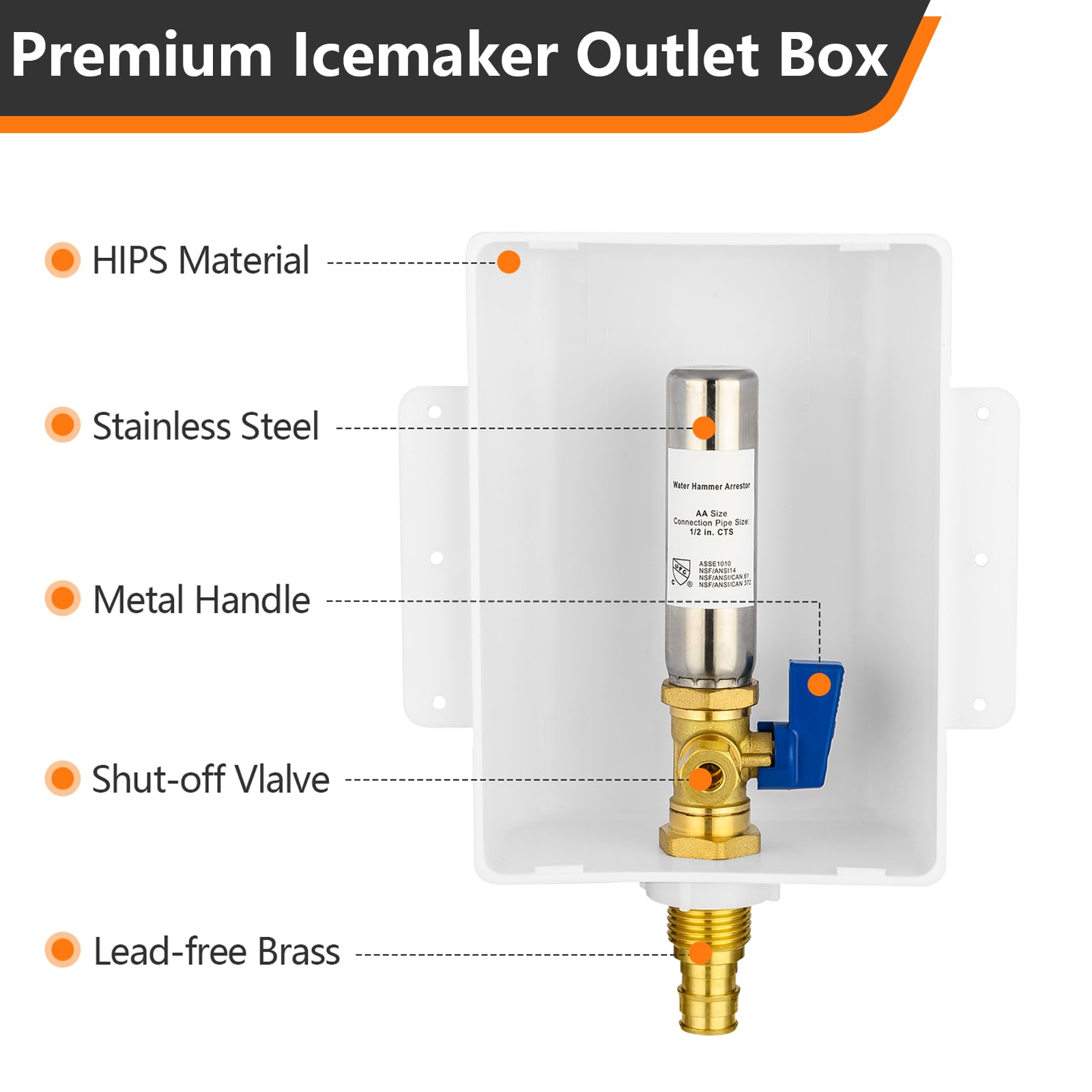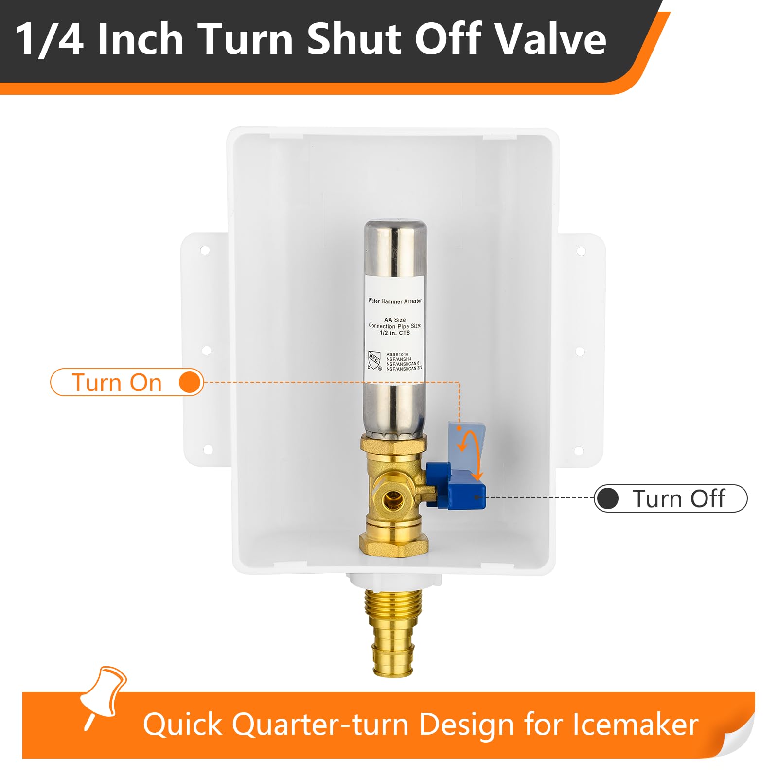 PACKAGE INCLUDE:1.pre-assembled icemaker outlet box,equipped with a stainless steel water hammer arrestor. 2.protective box cover
