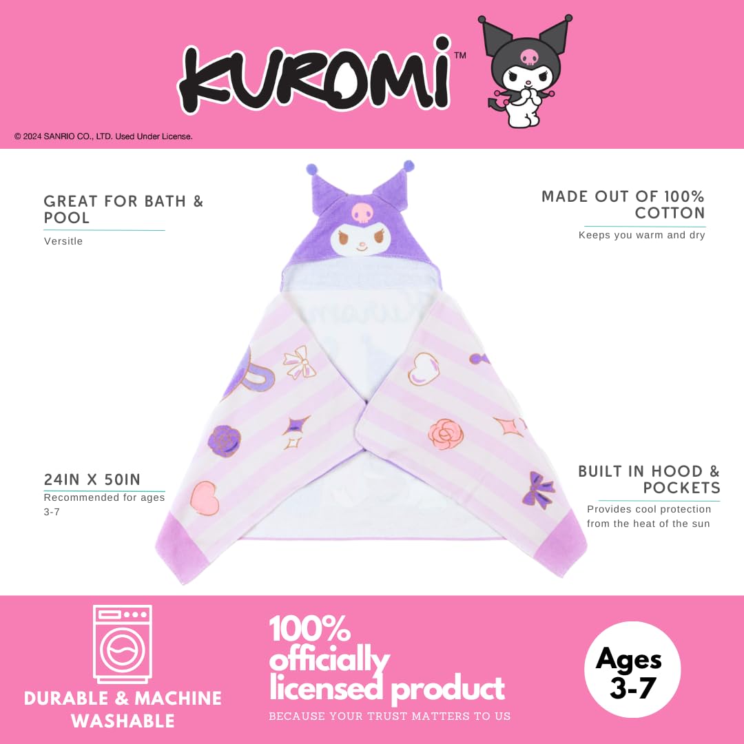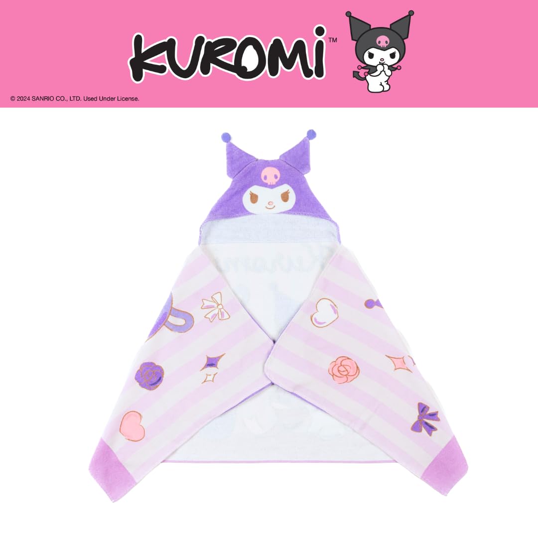 PURCHASE INCLUDES: A Kuromi hooded towel bath wrap measuring 24" (L) X 50" (W). It's large enough for growing toddlers and kids ranging from 3 to 7 years of age.