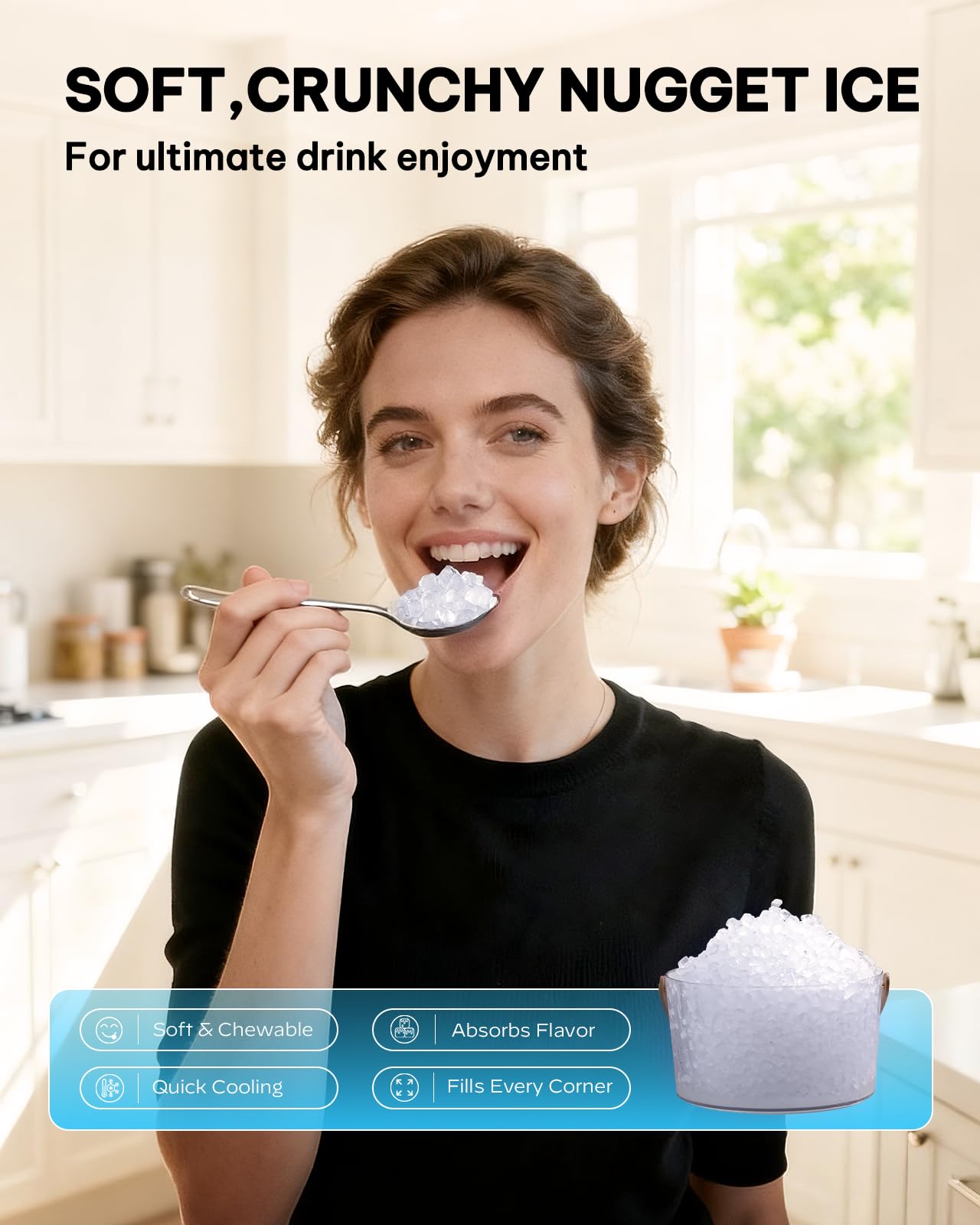 Soft Chewable Nugget Ice: Crafted by Silonn nugget ice makers, Chewable nugget ice offers a softer texture and greater surface area, enabling faster cooling of beverages. Enjoy a fully refreshing drinking experience. Ideal for preparing iced tea, coffee, cocktails, or for chilling beer and preserving food freshness.