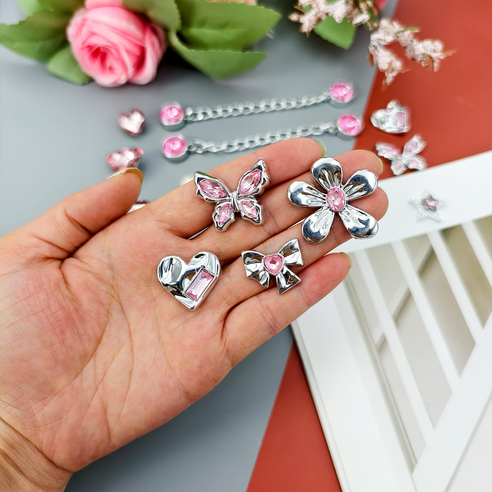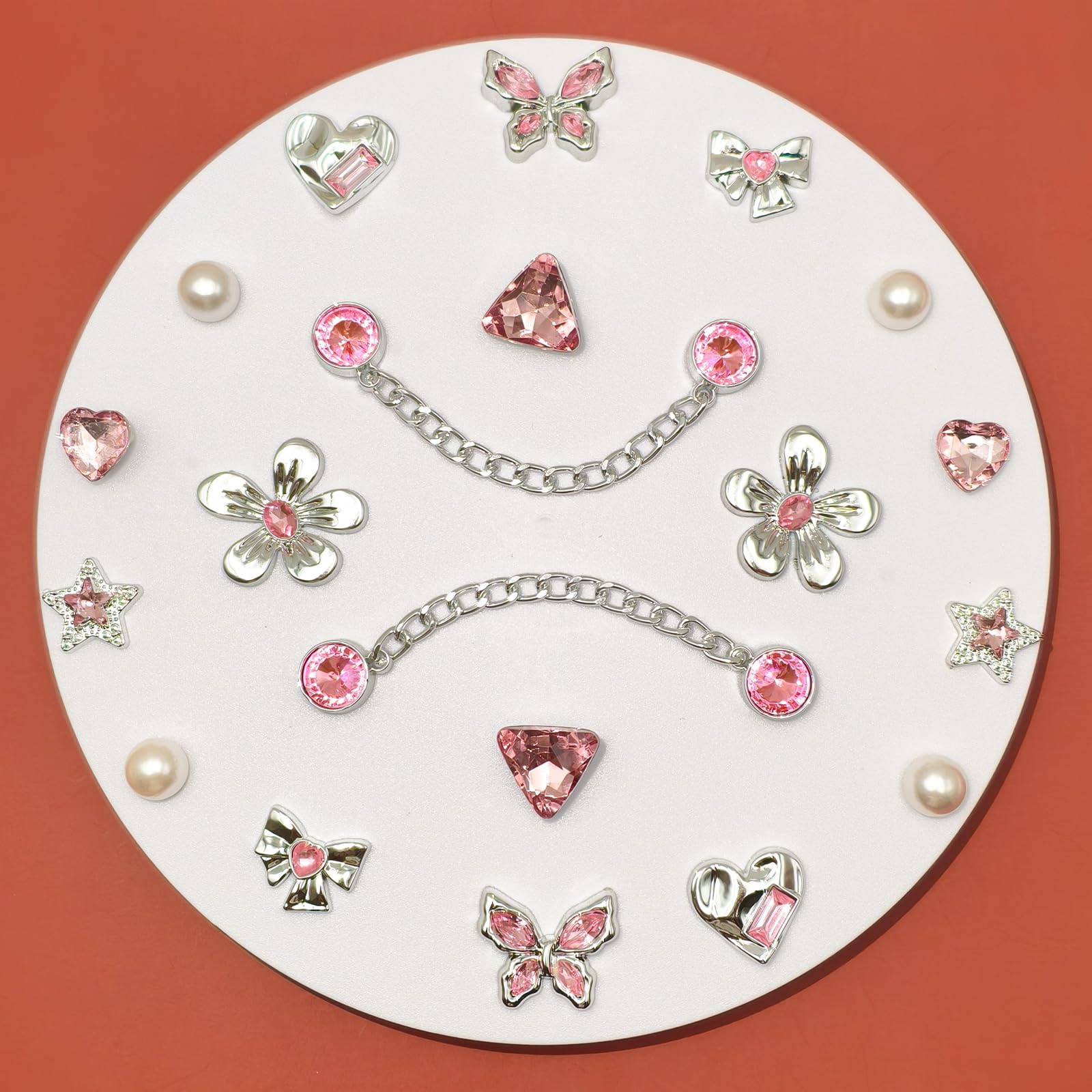 Package List- You will get a pair of cute shoe chains and 18pcs bling shoe charms with rhinestones, gems, pearl accessories;