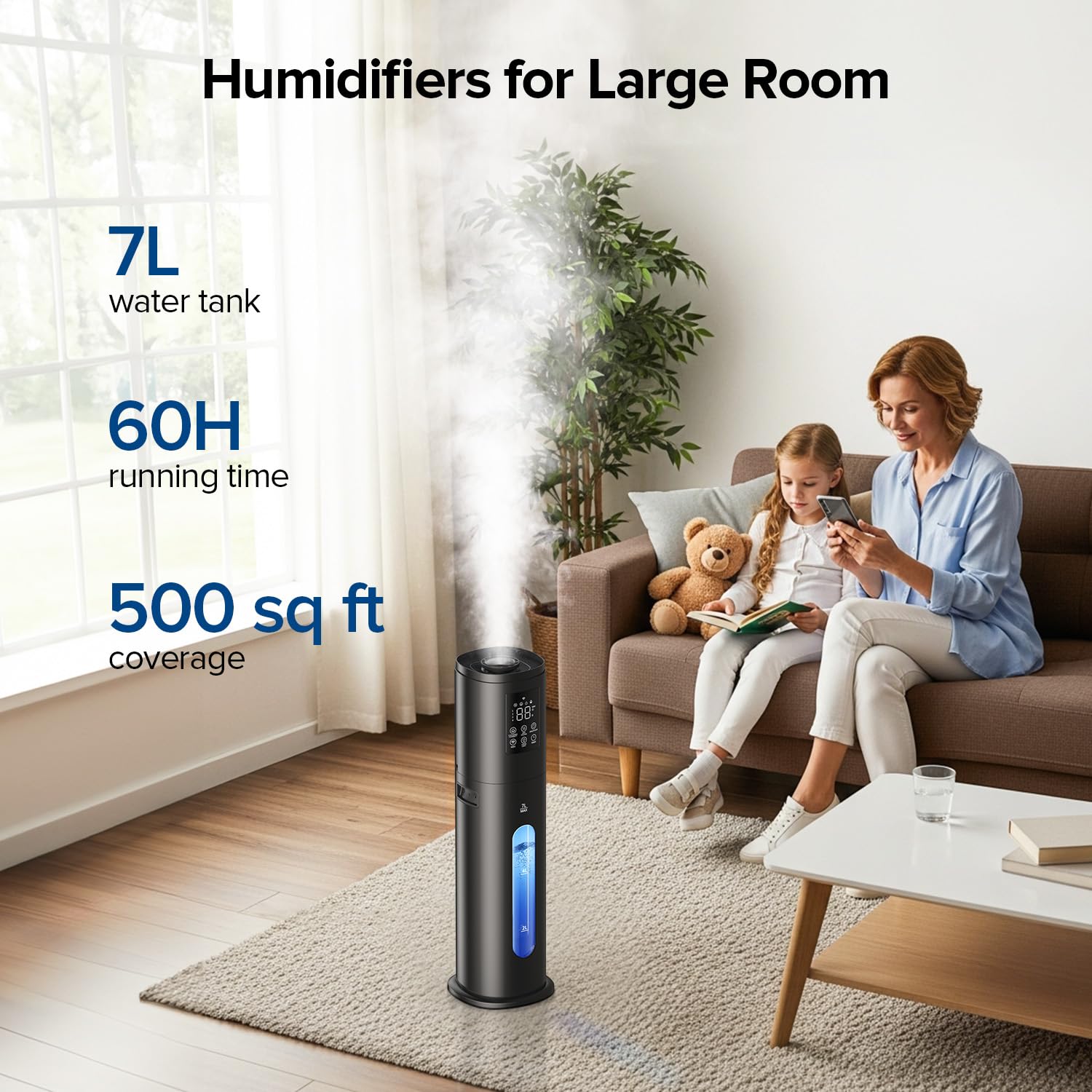 【Humidifier Large Room & Top Filling Design】: The cool mist humidifiers for bedroom with 7L removable large capacity , top-filling anti-leakage design improves the leakage problem and easy to refill,continuously up to 60 hours on a single refill needn't filling water frequently.350mL/h high moisture output is designed to humidify the air for cover up to 500 sq.ft ,better relieve air and skin dryness. Best whole house humidifiers for home, dorm and living room.