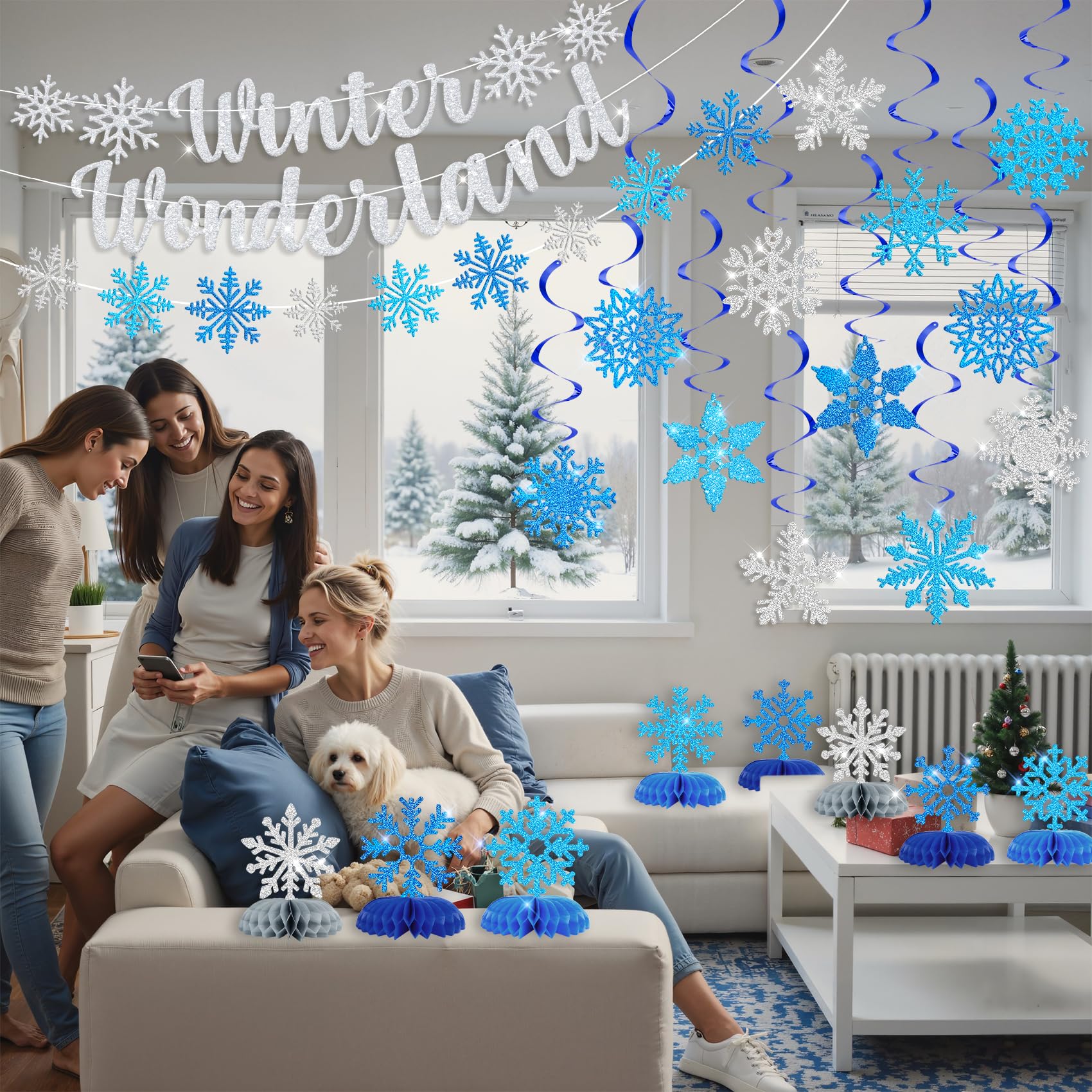 Winter Wonderland Decorations: Snowflakes decorations hanging includes "Winter Wonderland" banner, a snowflake banner, 12pcs hanging snowflake spiral in three colors, 12pcs hanging swirls, 5pcs honeycomb snowflakes and 5pcs bases
