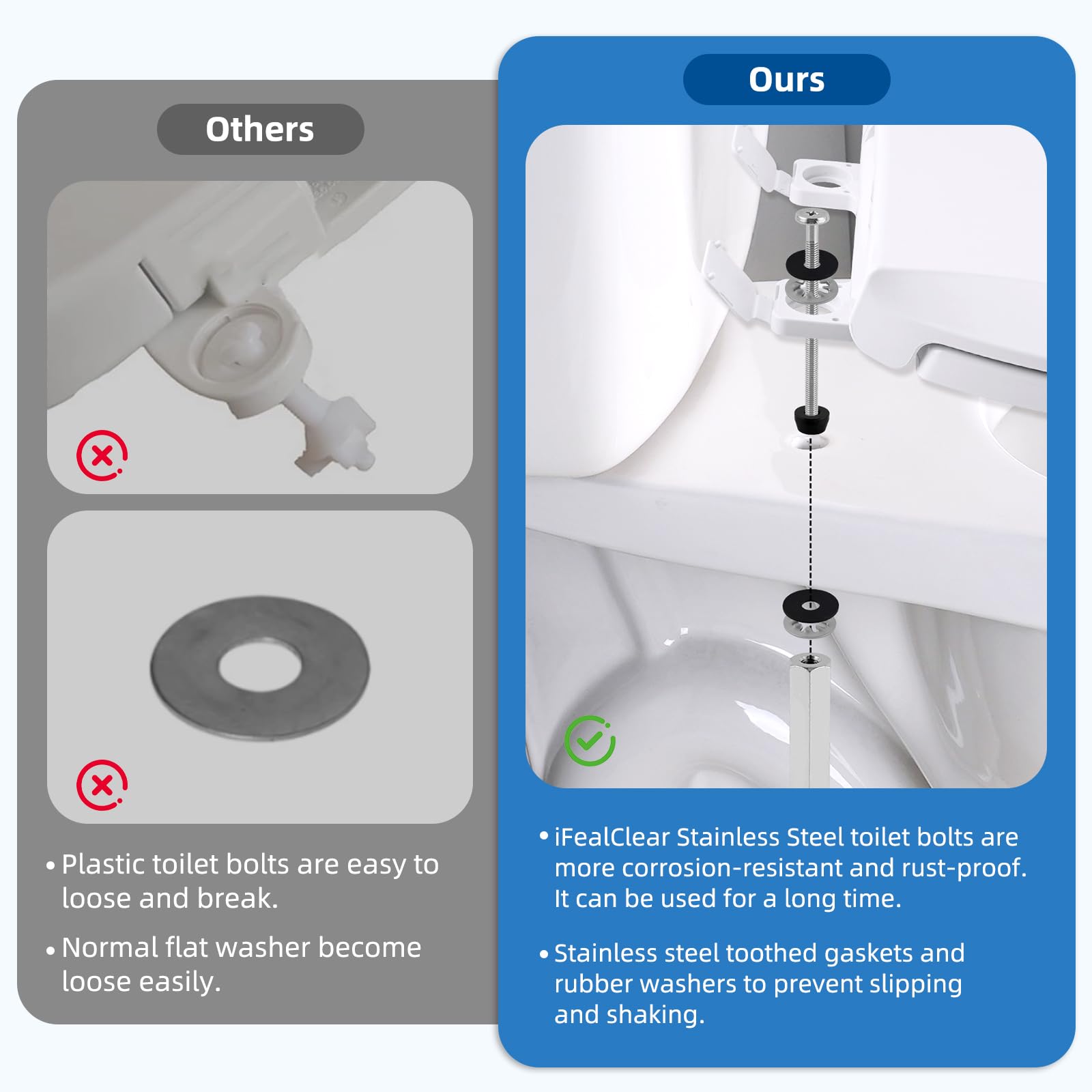 Stainless Steel Toilet Screws Downlock Nuts: Designed to prevent sliding and shifting, the long stainless steel lock nuts enhance stability and comfort. Unlike plastic toilet seat screws, which can break or loosen easily, iFealClear's bolts will remain securely fastened