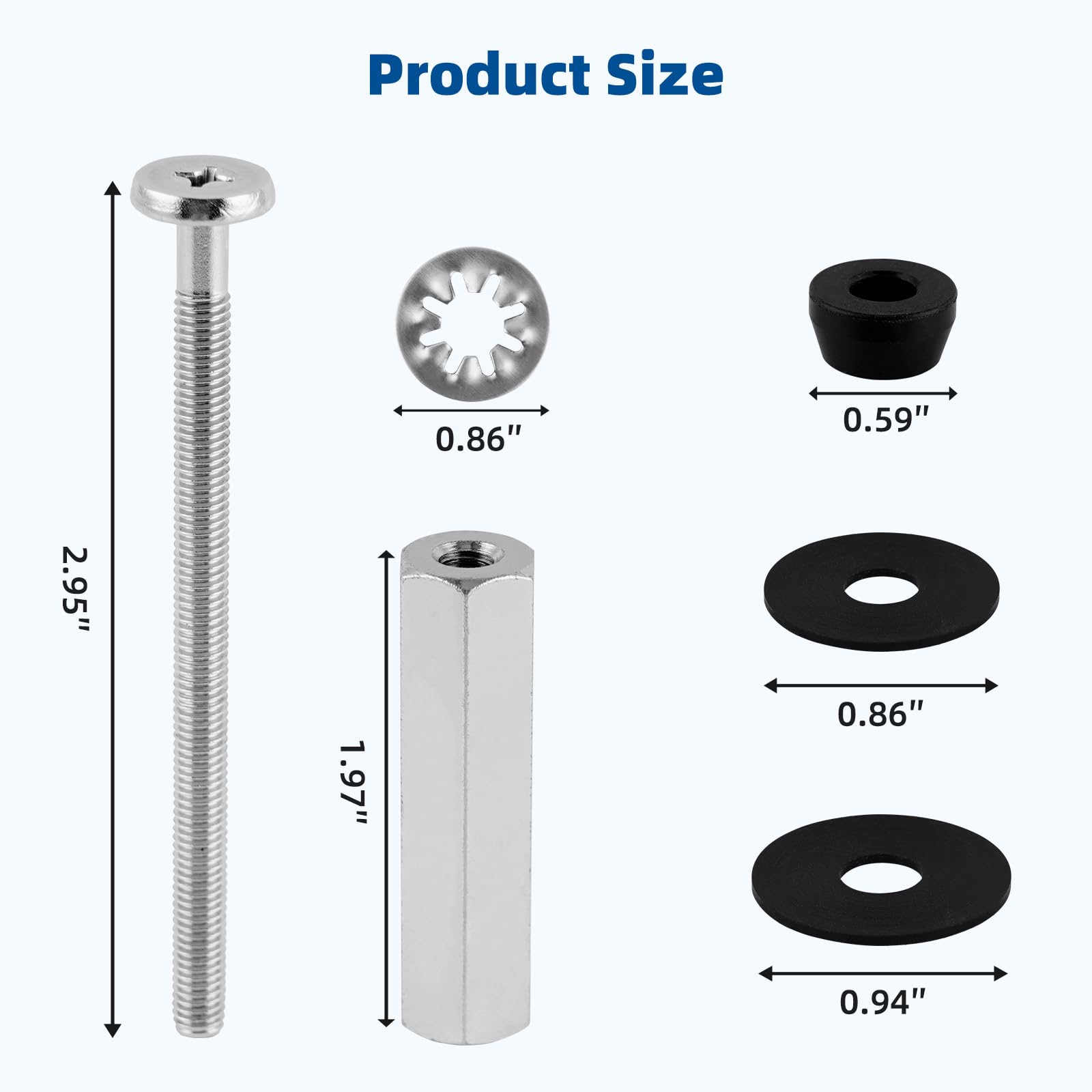Package Includes: Two pcs 3-inch stainless steel toilet seat bolts replacement kits; two pcs 2-inch lock nuts; four pcs stainless steel anti-slip washers; six pcs black rubber washers