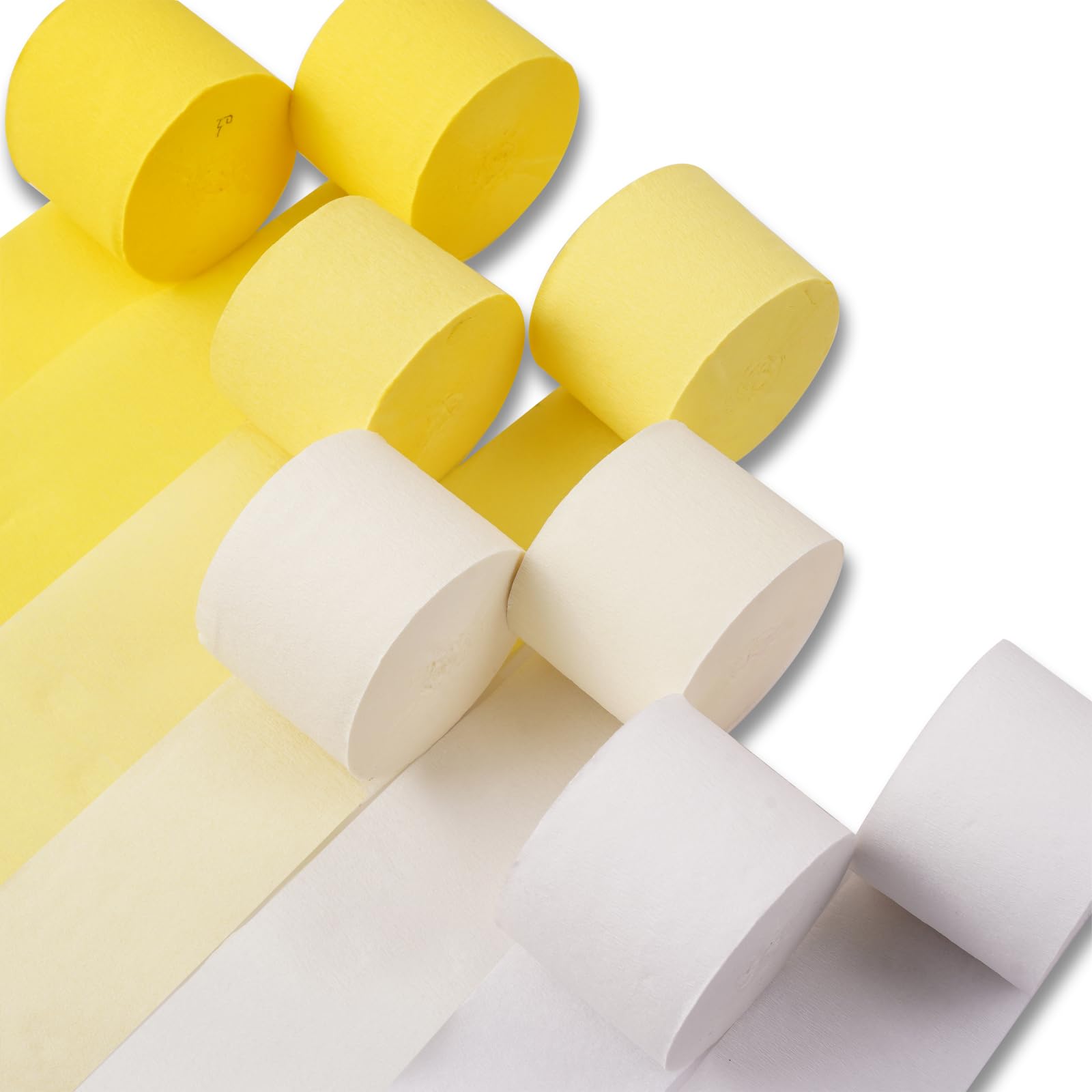 Package Included:You will receive 8 precisely rolled party crepe paper in yellow and white colors, each roll is 1.8 inch x 82 ft, these crepe paper streamer rolls are enough for your baby shower decorations, wedding and engagement decoration needs