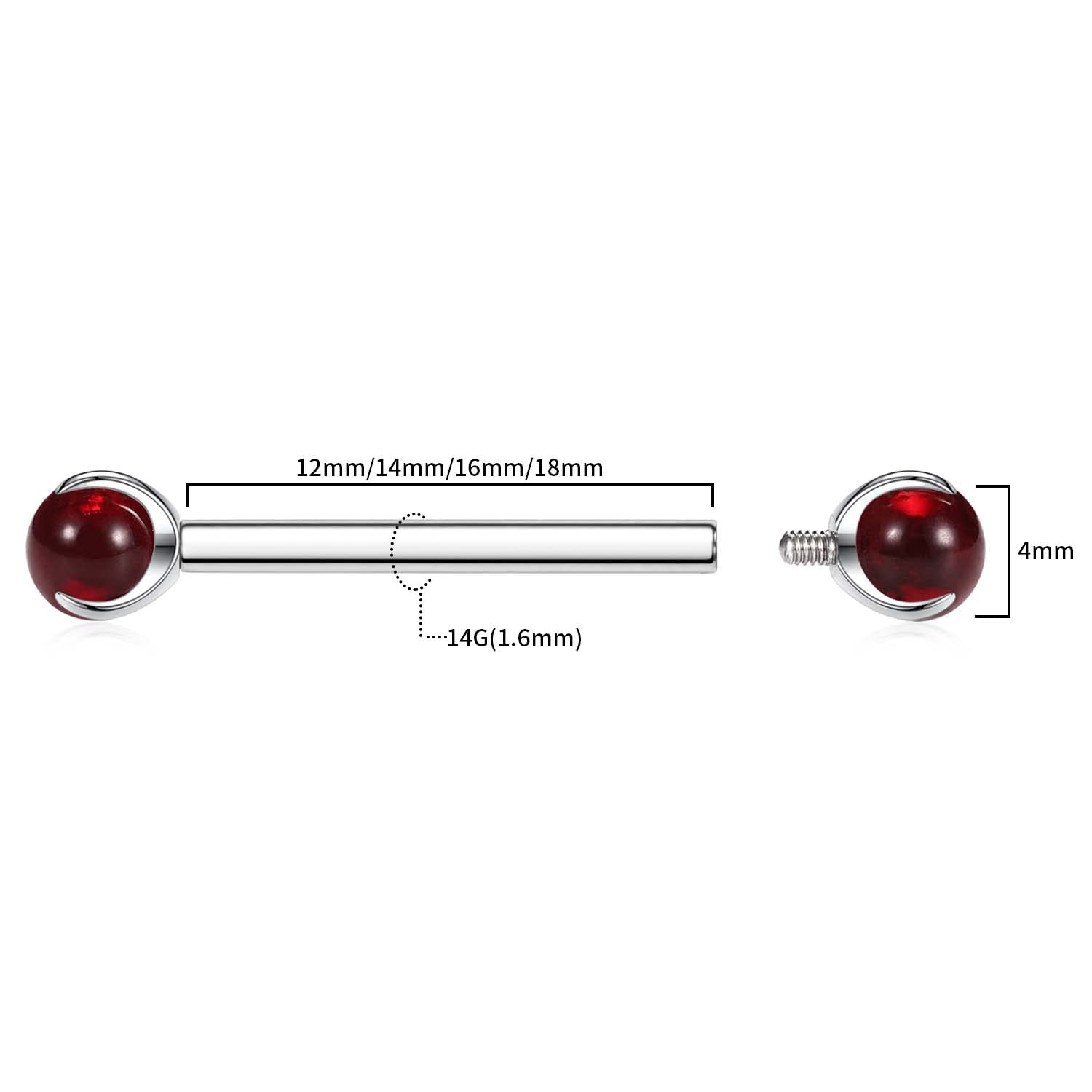 Size: Gauge: 14 G (1.6 mm); Nipple Barbell Length: 5/8"(16 mm); Ball Size: 4 mm, 1 pair nipple ring per order