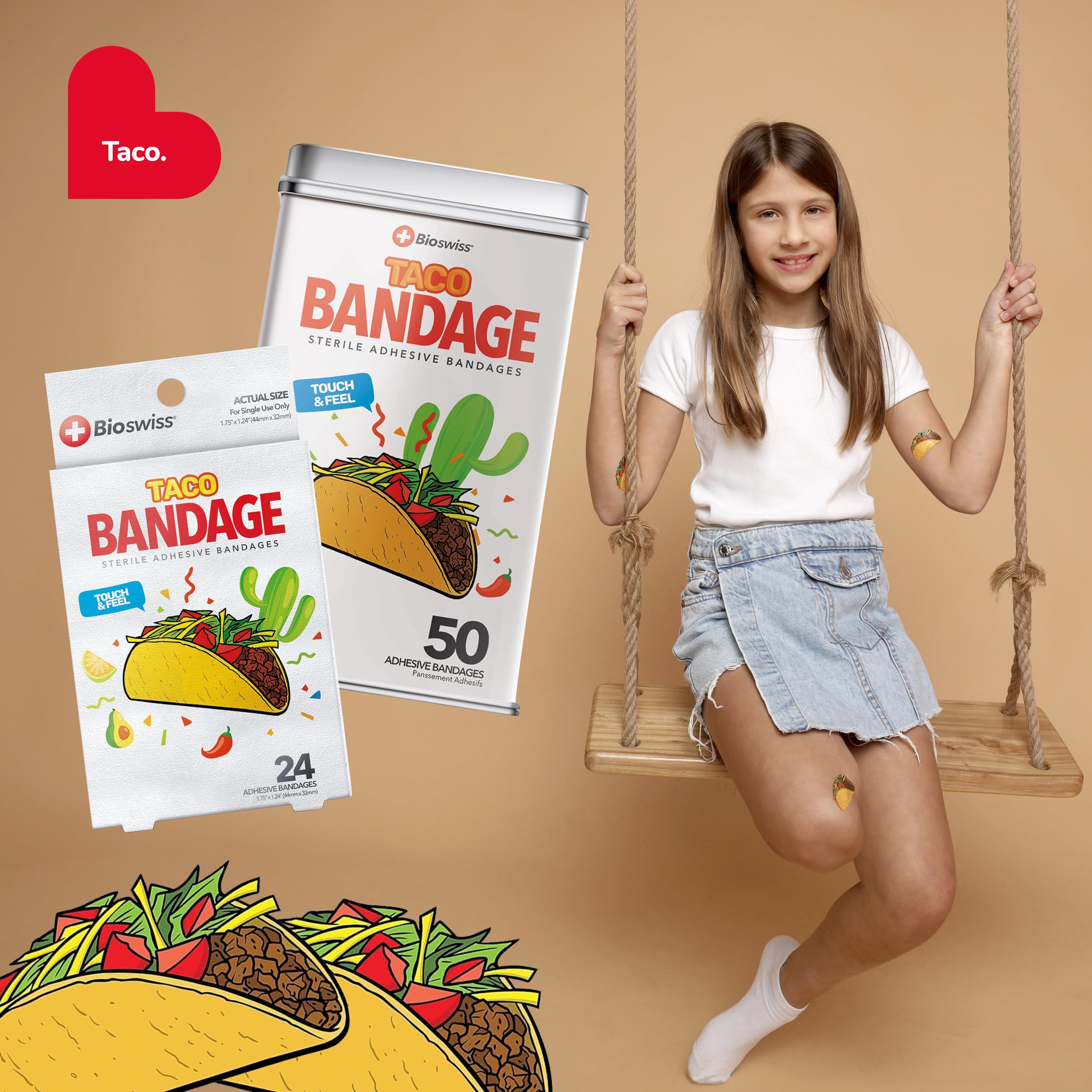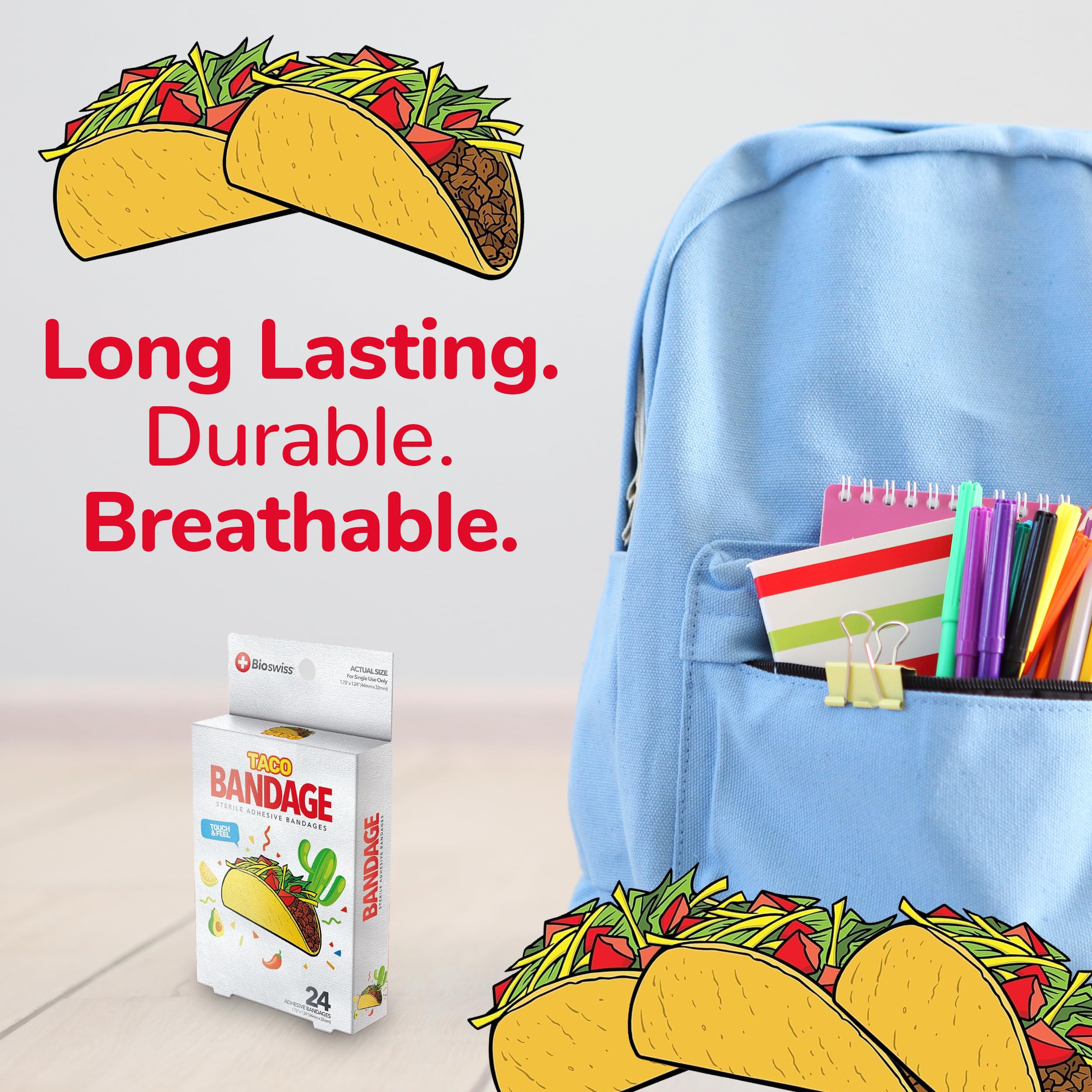 24 TACO KIDS BANDAGES: Fun taco-shaped adhesive bandages pack helps protect cuts, scrapes, and minor wounds while making healing less stressful for children