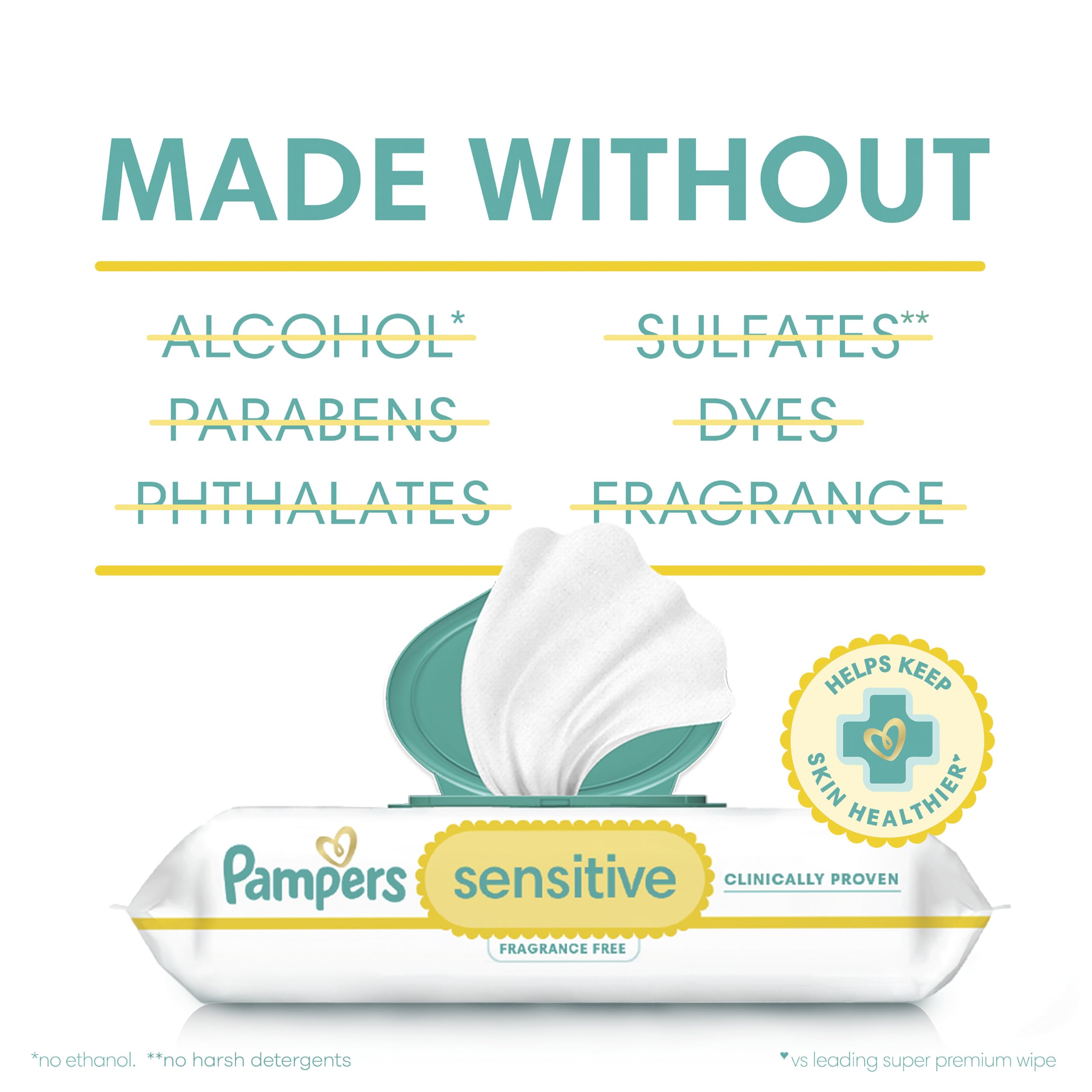 Product Description Clinically proven to protect your little one’s sensitive skin, Pampers Sensitive baby wipes are extra thick and soft for a gentle clean. They are the #1 choice of hospitals, based on hospital sales data, and they are Skin Health Alliance Dermatologist approved. Pampers Sensitive baby wipes are perfect for caring for your newborn’s sensitive skin in the kindest possible way because they are milder than a washcloth and water and their unique lotion helps maintain skin’s natural pH better vs. the leading super-premium baby wipe. Pampers Sensitive baby wipes are hypoallergenic and free of alcohol (no ethanol), fragrance, parabens, and latex (no natural rubber). Pampers Sensitive Wipes are dermatologically tested and are gentle enough for hands, bodies and faces, as well, so you can tackle nearly any baby mess without worry, so you can make sure you are caring for your newborn’s delicate skin. Plus, Pampers Sensitive baby wipes’ convenient 1-Wipe pop-top keeps wipes from drying out and are designed to dispense one wipe at a time, so you only get what you need to tackle the mess at-hand. Sensitive wipes are from Pampers, the #1 pediatrician recommended brand. For healthy baby skin, use Pampers Sensitive wipes together with Pampers Swaddlers diapers. Brand Story By Pampers