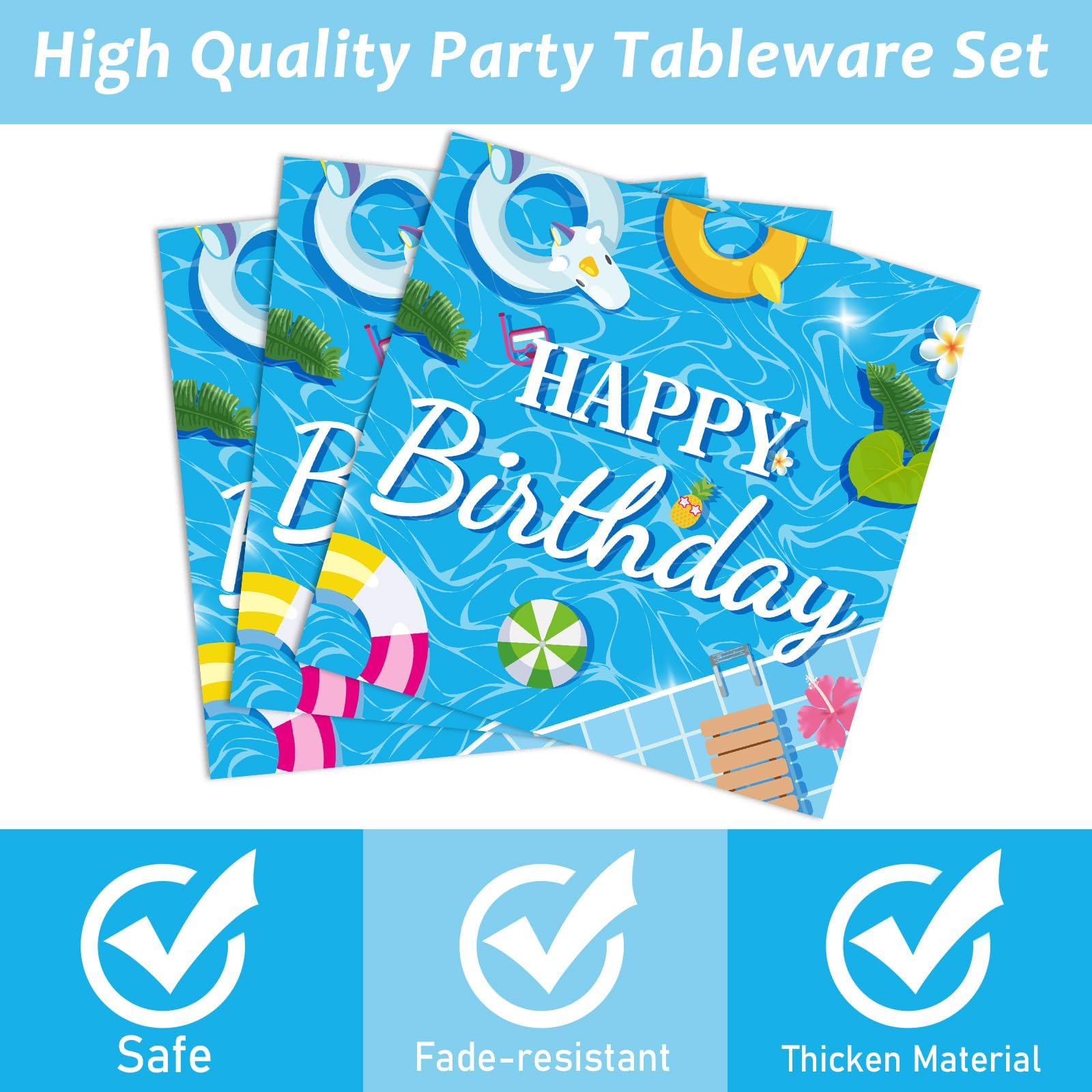 Convenient: These easy pool birthday party party kits are the perfect addition to your summer main party decorations. These paper plate and napkins are disposable after use, saving you time in cleaning up. Perfect for beach parties.