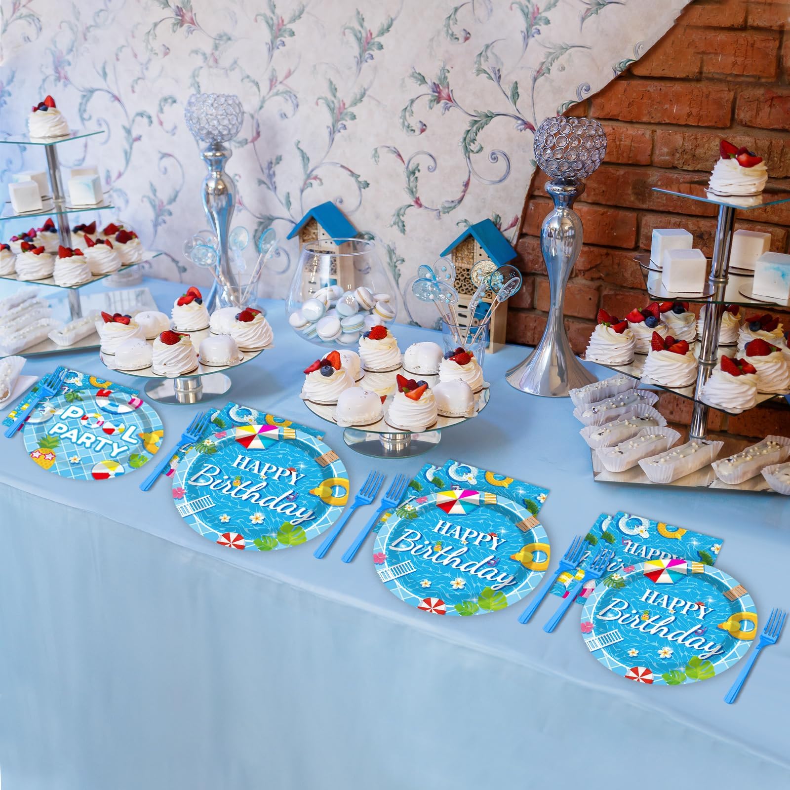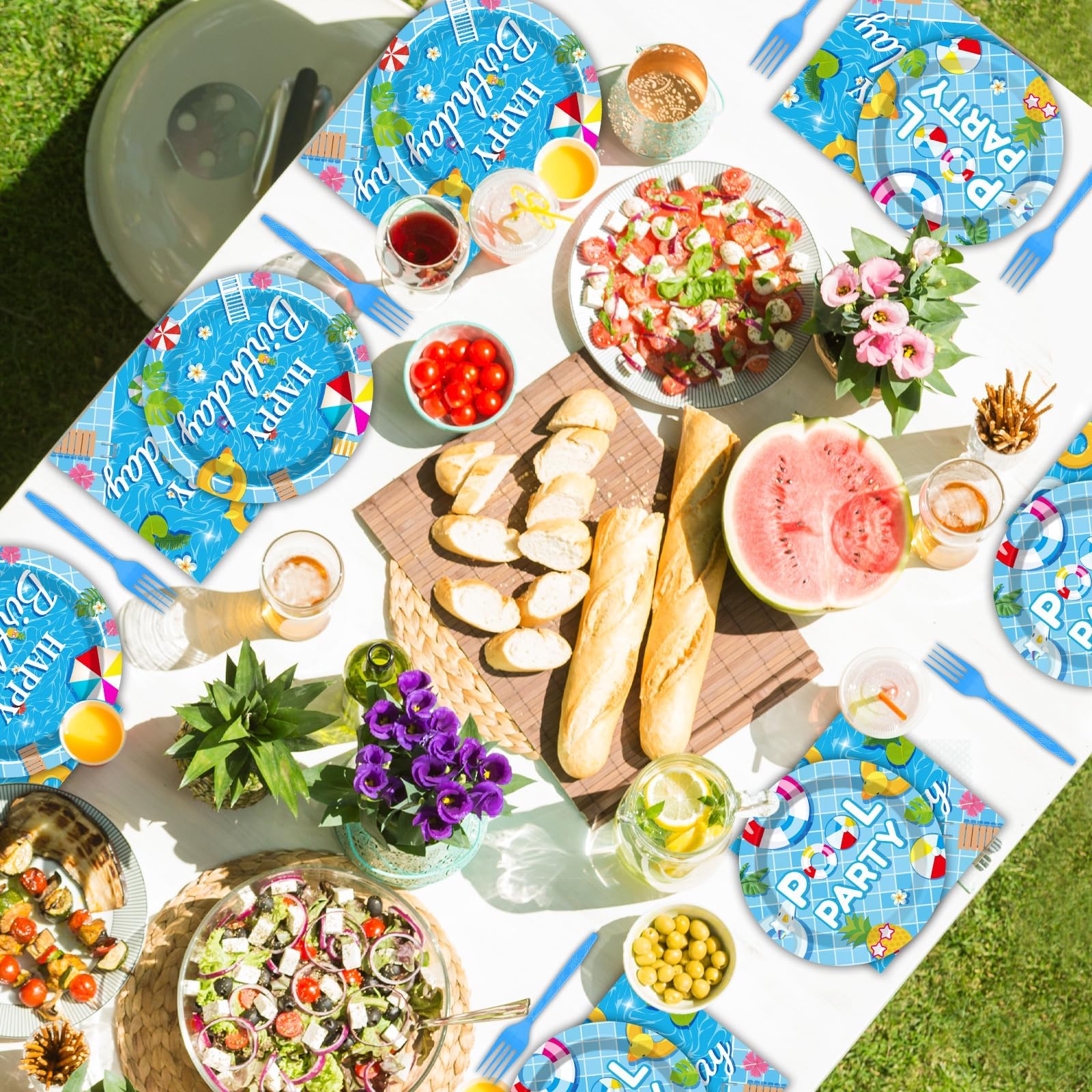 What's in the package: You'll receive 24 9" pool birthday party paper plates, 24 7" pool birthday party paper plates, 24 6.5" pool birthday party napkin replacers, and 24 plastic blue forks, each set serves 24 people guests