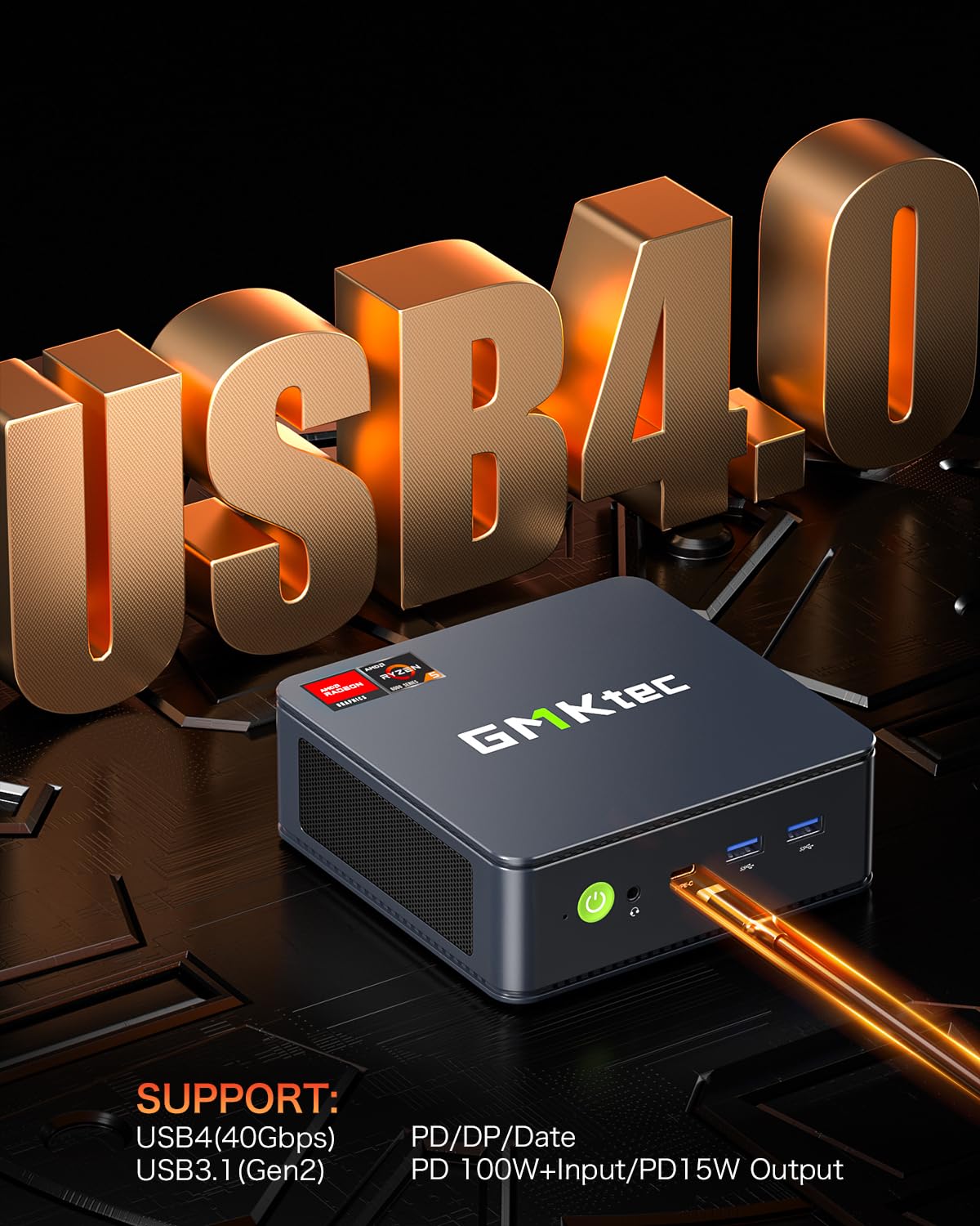 【Fast Internet WiFi 6E + BT5.2 Connection】GMKtec Mini PC Ryzen 6600H with WiFi-6E Wireless, have 2.5G/5G/6G triple band, more faster and lower latency. Bluetooth 5.2 allowing you more quickly to connect other wireless devices (headset, mouse, keyboard, etc.) Interface features 2*USB3.2 ports, 2*USB2.0 ports, 1*HDMI 2.0 port(4K@60Hz), 1*USB 4.0 port(PD/DP/DATA), 1*DP Port, 1*Audio 3.5mm (HP&MIC), 1*DC Power Port.