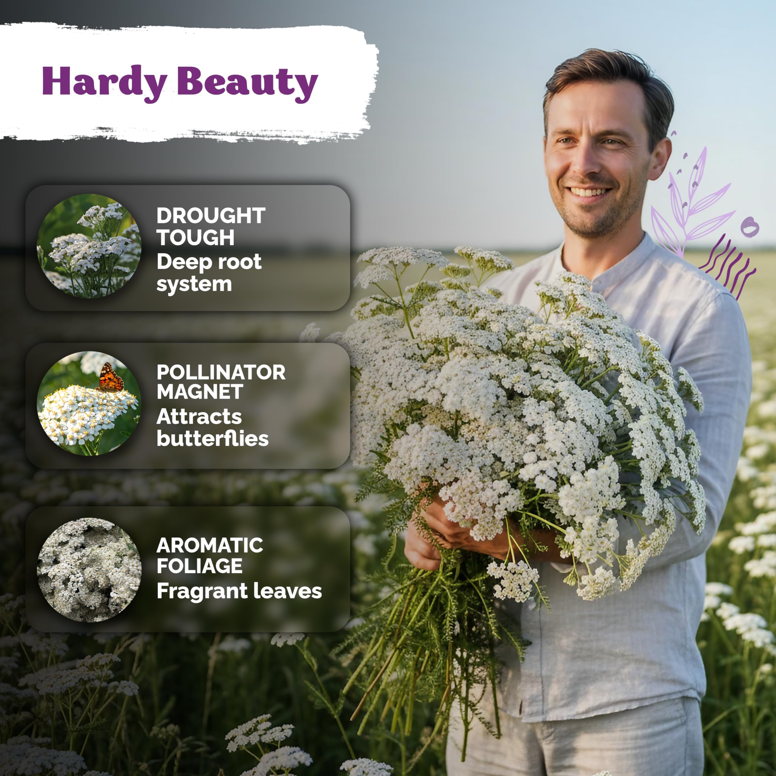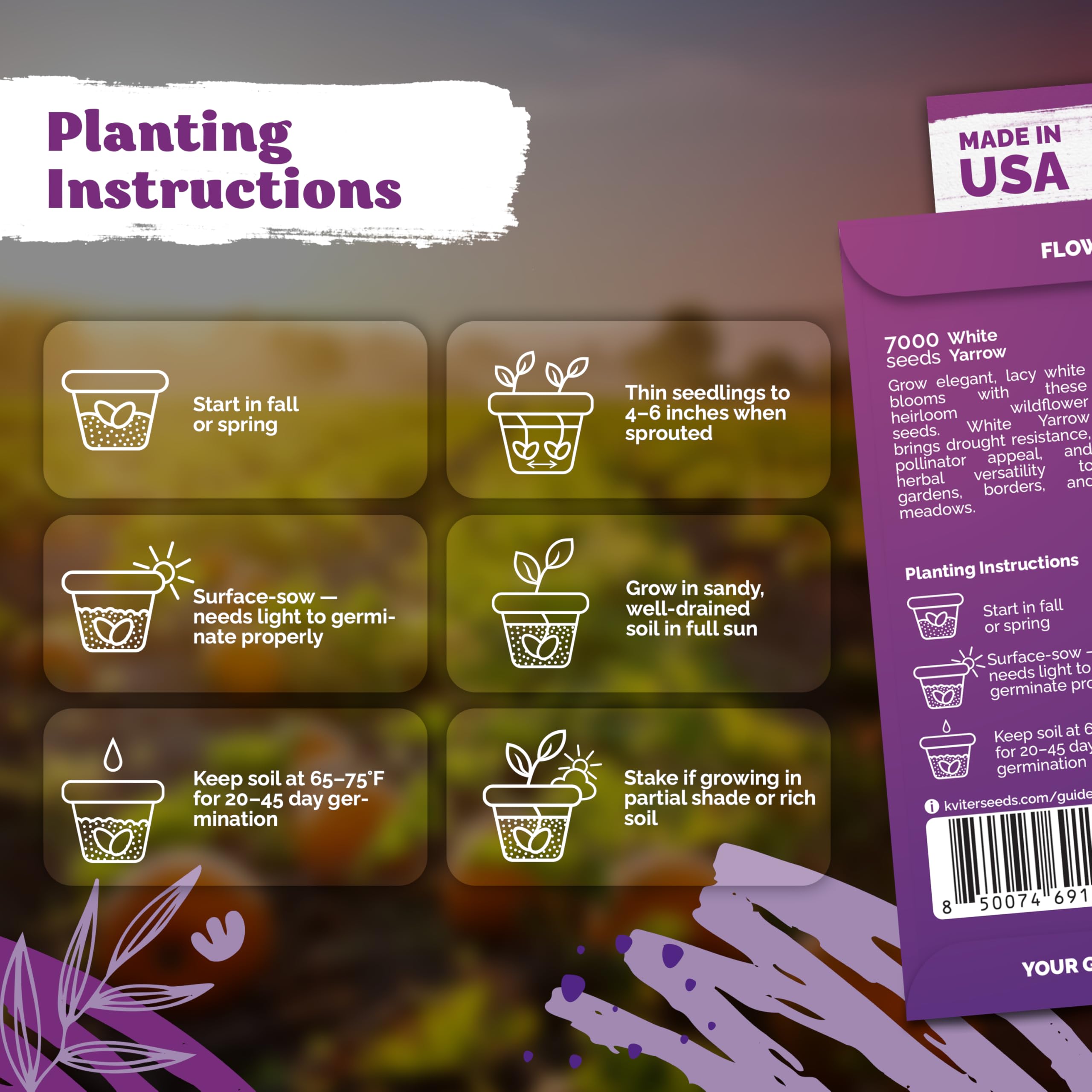 Easy to Grow: Sow achillea millefolium perennial wildflower seeds just below soil surface (needs light to germinate), space 4-6". Organic yarrow heirloom seeds sprout in 20-45 days at 65-75°F, these perennials thrive in USDA zones 1-12;