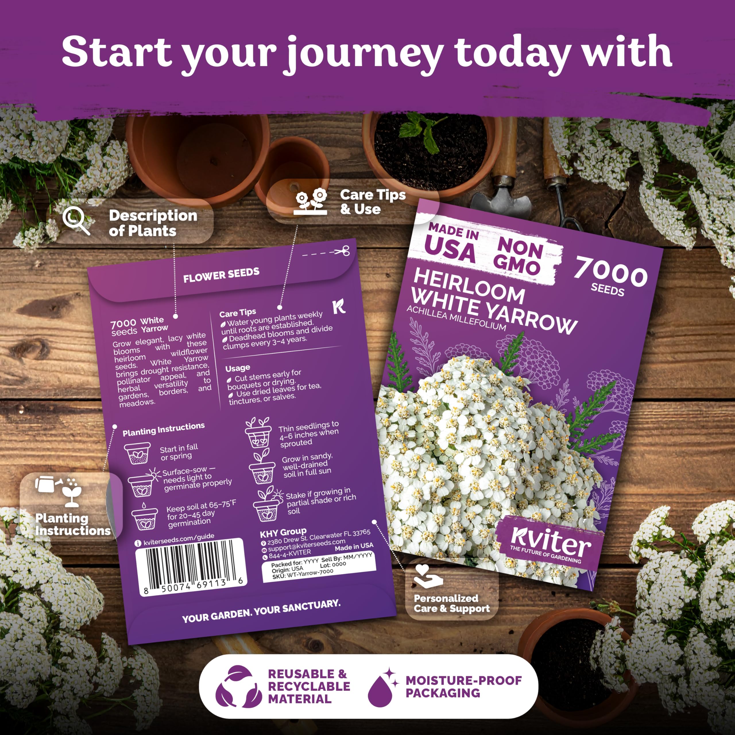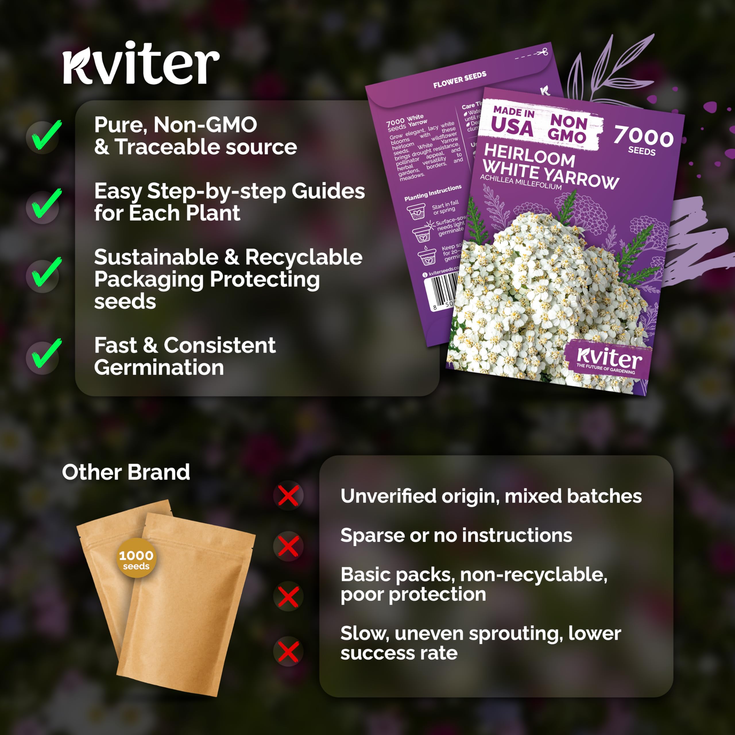 KVITER 7000 White Yarrow Seeds for Planting (Achillea Millefolium) — Perennial Flower Seeds to Plant Outside, Heirloom & Organic — Native Wildflower Seed for Herb Garden, Beds, Containers & Meadows