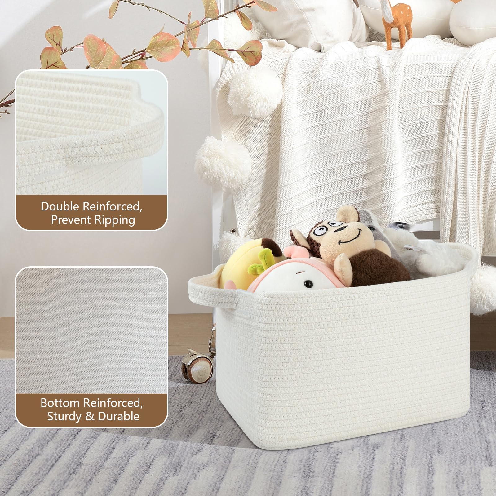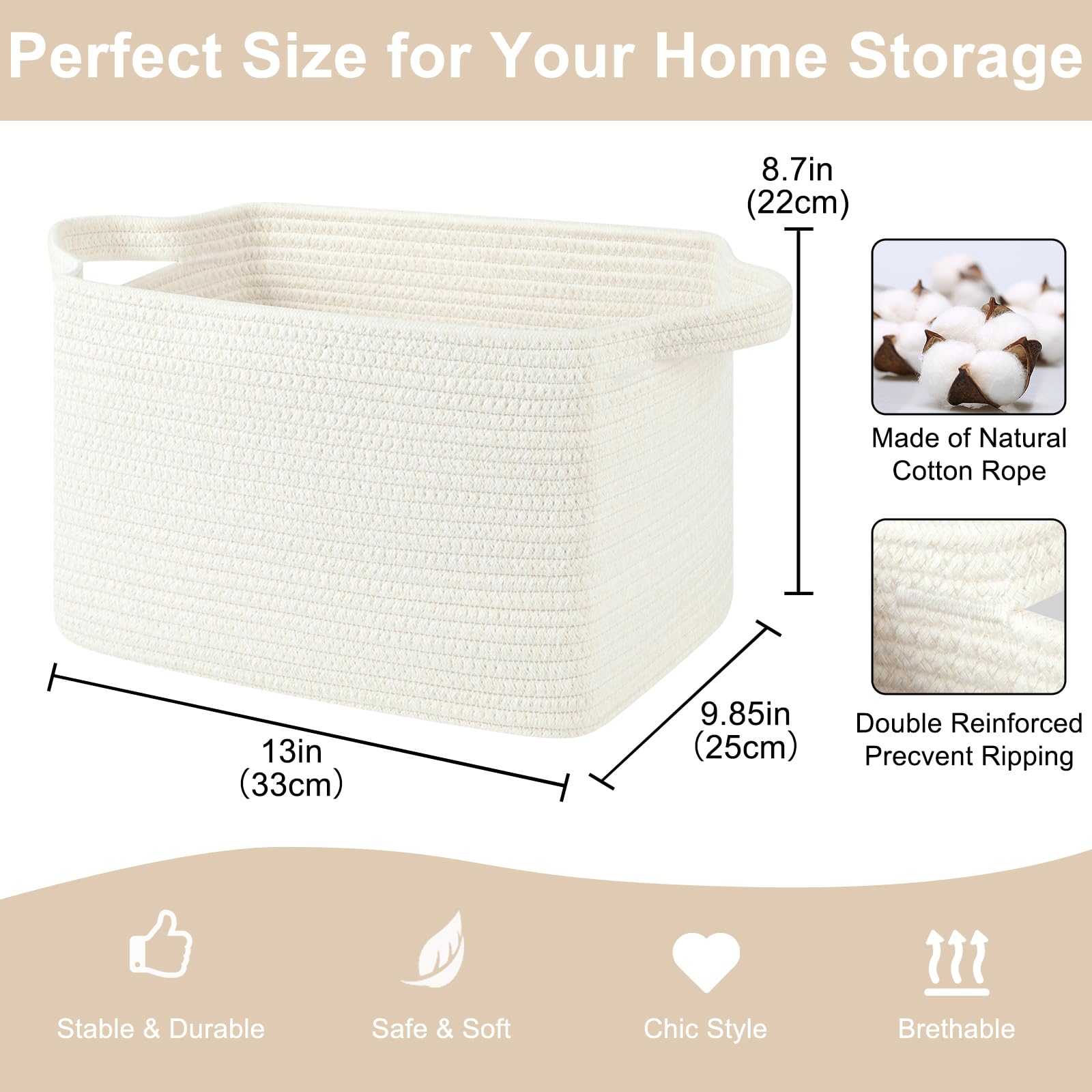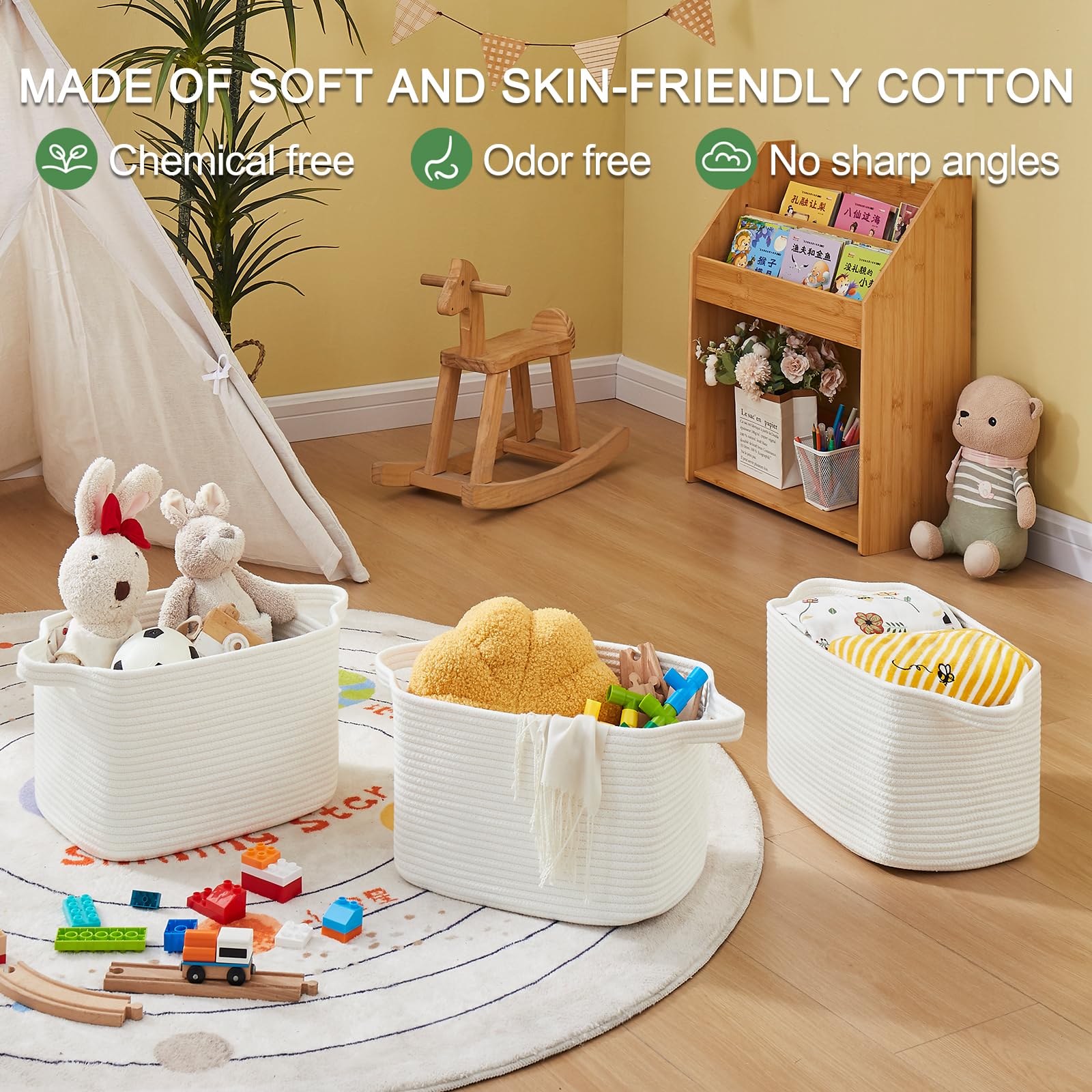 Soft and Durable: Our shelf baskets are meticulously handcrafted from high-quality natural cotton rope that's ultra-soft and durable. No odor or sharp corners, making it safe for babies, and won't scratch your furniture and floor. Ideal for nurseries and playrooms