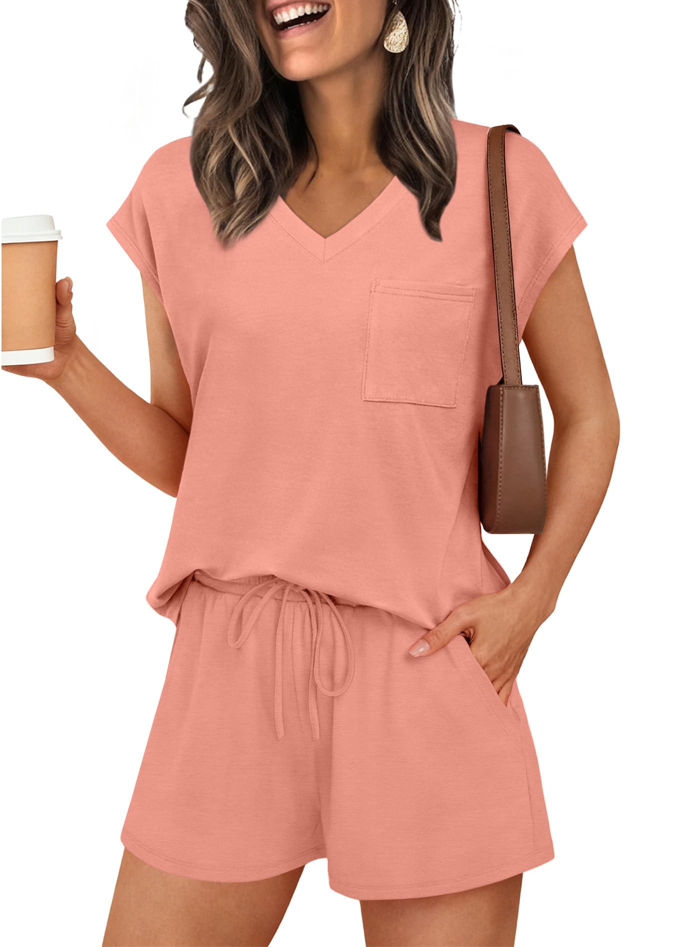 Design: Side-pocket shorts with relaxed fit & adjustable drawstring offer comfort and convenience; the trendy V-neck cap-sleeve top also works as a chic summer piece