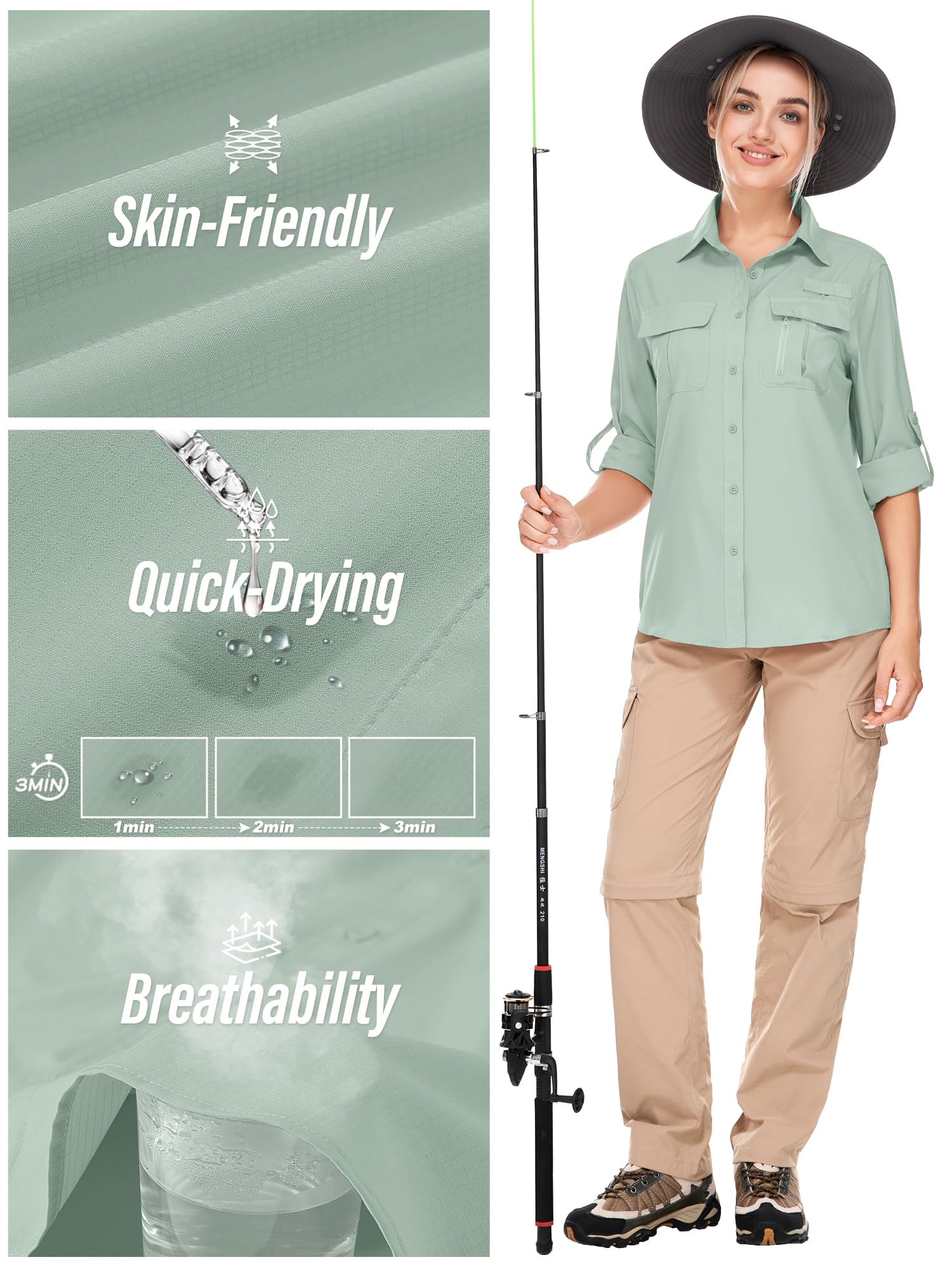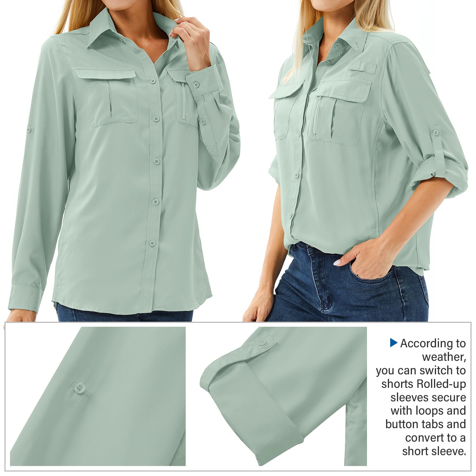 Long sleeve Hiking shirts:Womenβs lightweight safari shirts features a mesh-lined vented back for breathability and comfort. Roll-up sleeves to convert long sleeves to short sleeves for hot days.