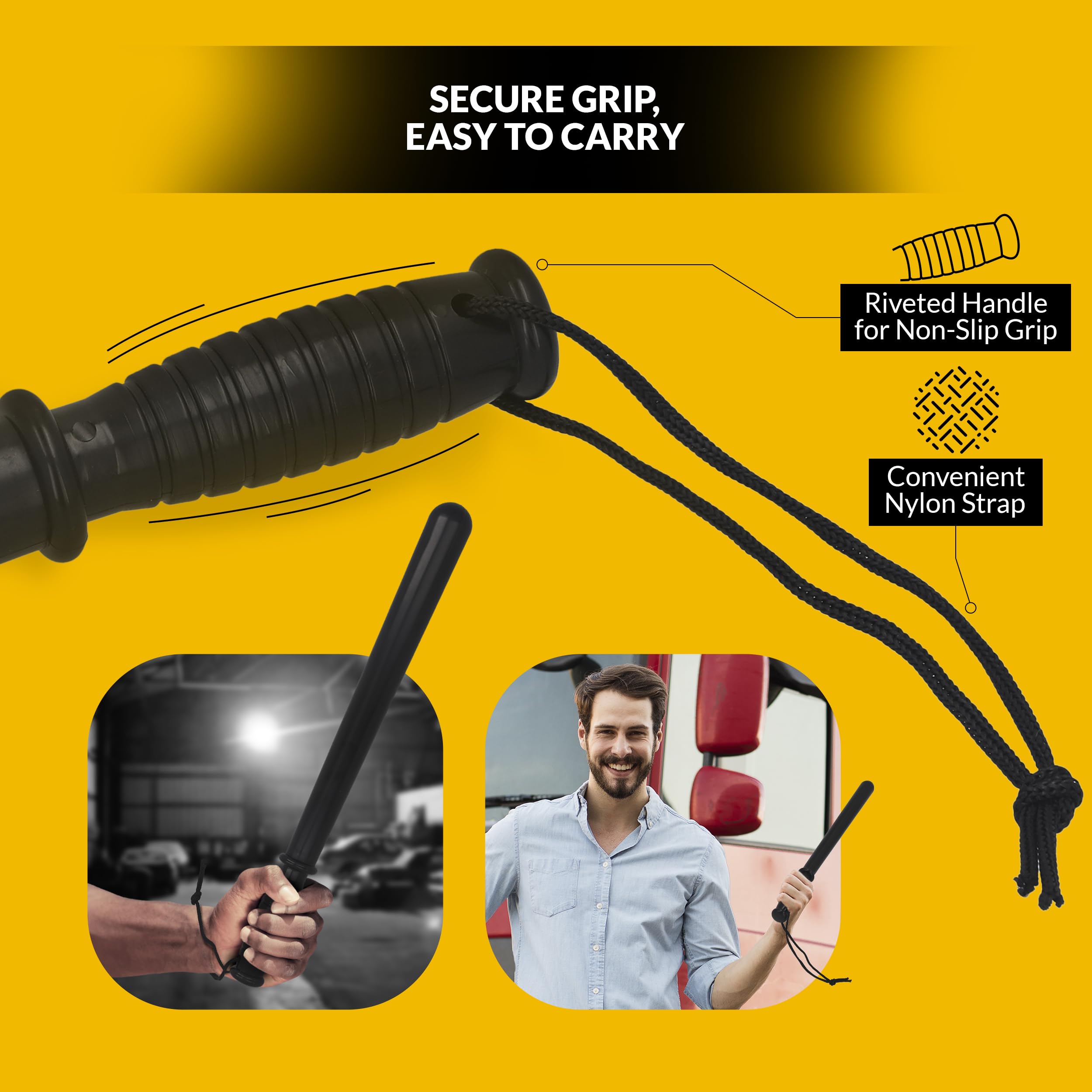 Secure Grip & Easy Carry – Ribbed handle self defense club offers a solid grip, even when wearing gloves. Nylon wrist strap adds extra security and convenience, making it easy to keep your tire thumper by your side.