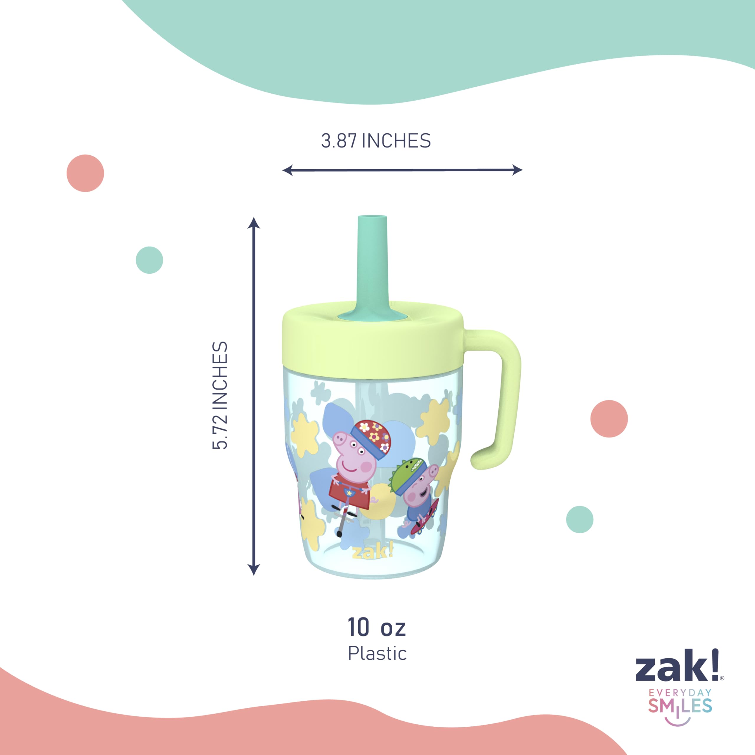 These leak-proof kids' tumblers from Zak Designs make hydration fun for Peppa Pig fans! Durable Materials: These tumblers are made from lightweight plastic, and the comfortable straws are made from silicone. Everything is dishwasher safe, and the lid can be disassembled for easy cleaning. Leak-Proof Straw: The straws have built-in valves that allow liquid to flow when drinking and prevent spills when the tumblers are tipped over. You don't have to worry about spills or stains around fabrics or electronics, and drinks stay easily accessible. Hydrate Anywhere: The tumblers won't splash or leak and fit in car cup holders, making them ideal to take on the go. They also have handles that make it easy for small hands to carry around. Specifications: Set of two tumblers with 10 oz capacity. Made of durable plastic and silicone. Dishwasher safe, do not microwave. Length: 2.94-inch, Width: 3.87-inch, Height: 5.72-inch. Character: Peppa Pig and George Pig.
