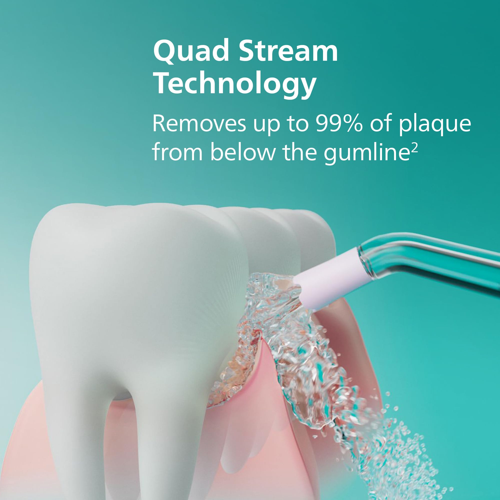 Quad Stream technology delivers four wide streams of water that penetrate deep between teeth and along the gumline, covering 9x the surface area of single stream flossers⁴