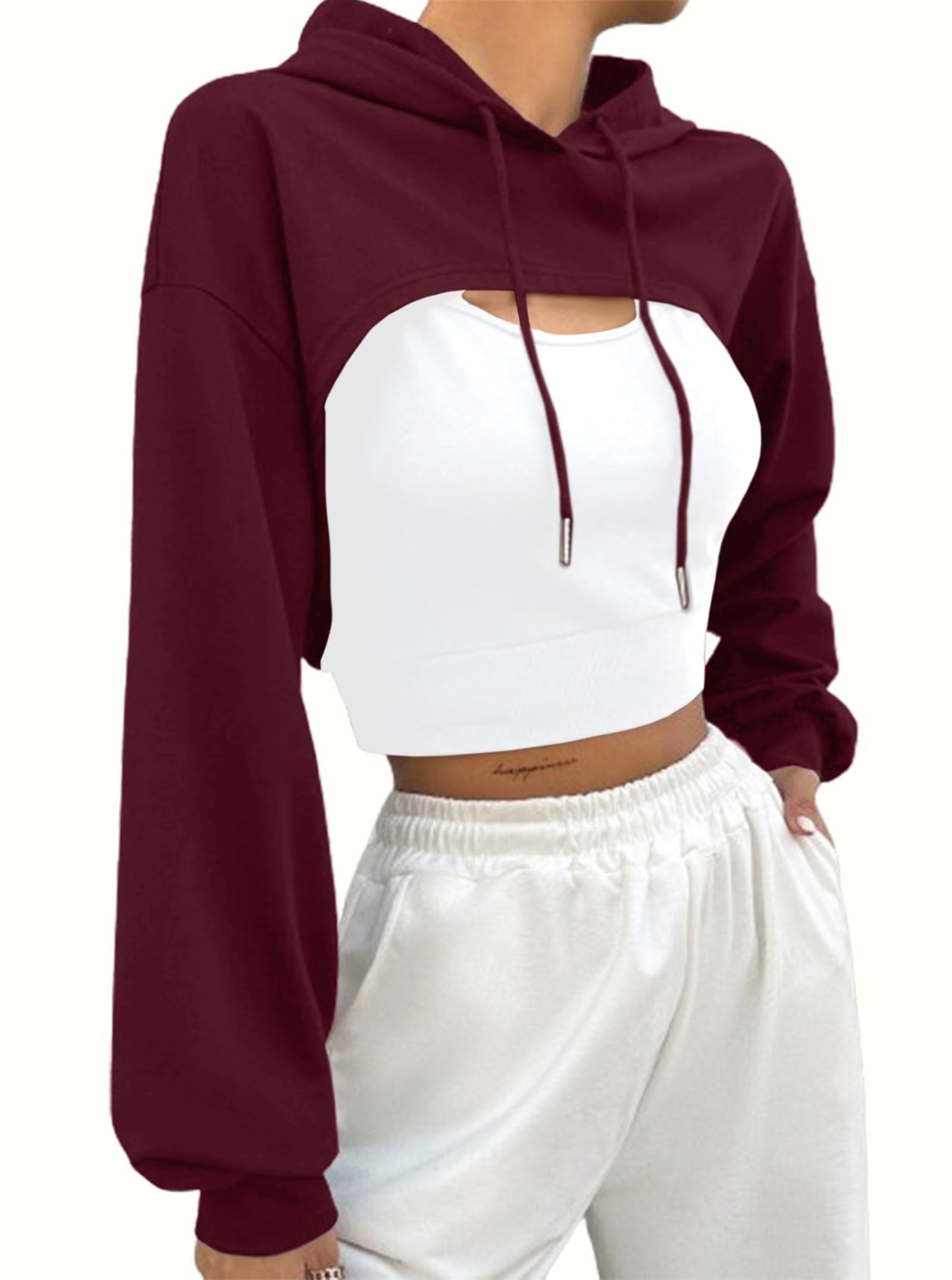 Regular fit, decent long sleve cropped workout tops goes over sports bras, tube top, tanks, lingerie, even regular T-shirts if you want to make it into a long shirt.Fashion hoodies for women, juniors, teen girls.