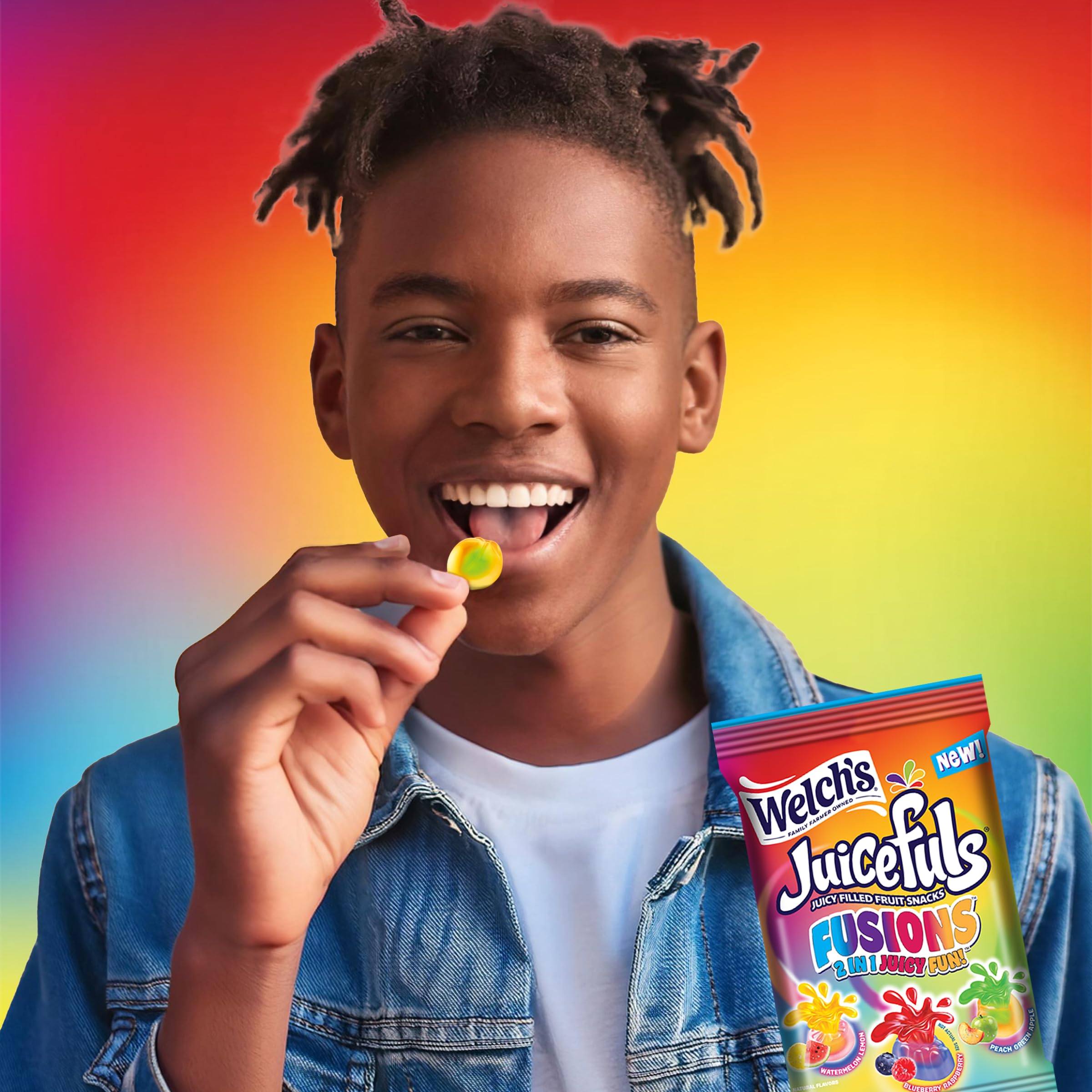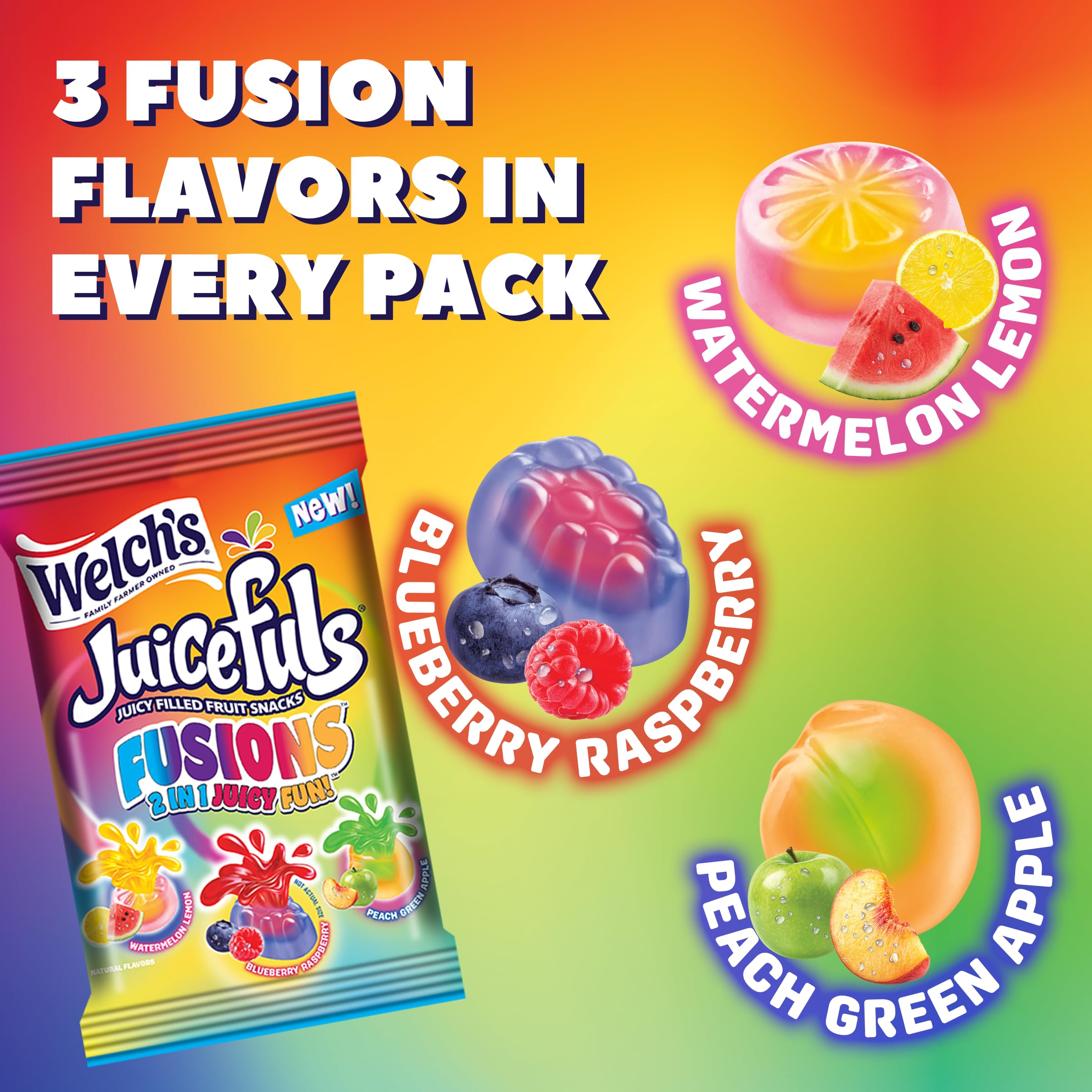 What the Fruit?! Welch's Fruit Snacks - Juicefuls Fusions are juicy, gluten free fruit snacks with a 2-in-1 flavor burstβchewy on the outside, juicy on the inside. Each of our delicious snack packs features bold combos like Watermelon Lemon, Blueberry Raspberry, and Peach Green Apple. The 12ct Snack Box is perfect for stocking up your on-the-go routine: from afternoon pick-me-ups to travel days and post-practice refuels. Made with real fruit and natural flavors, gluten free and fat free benefits, plus 20% daily value of Vitamin C, A & E, these fruit snacks bring the flavor and function.