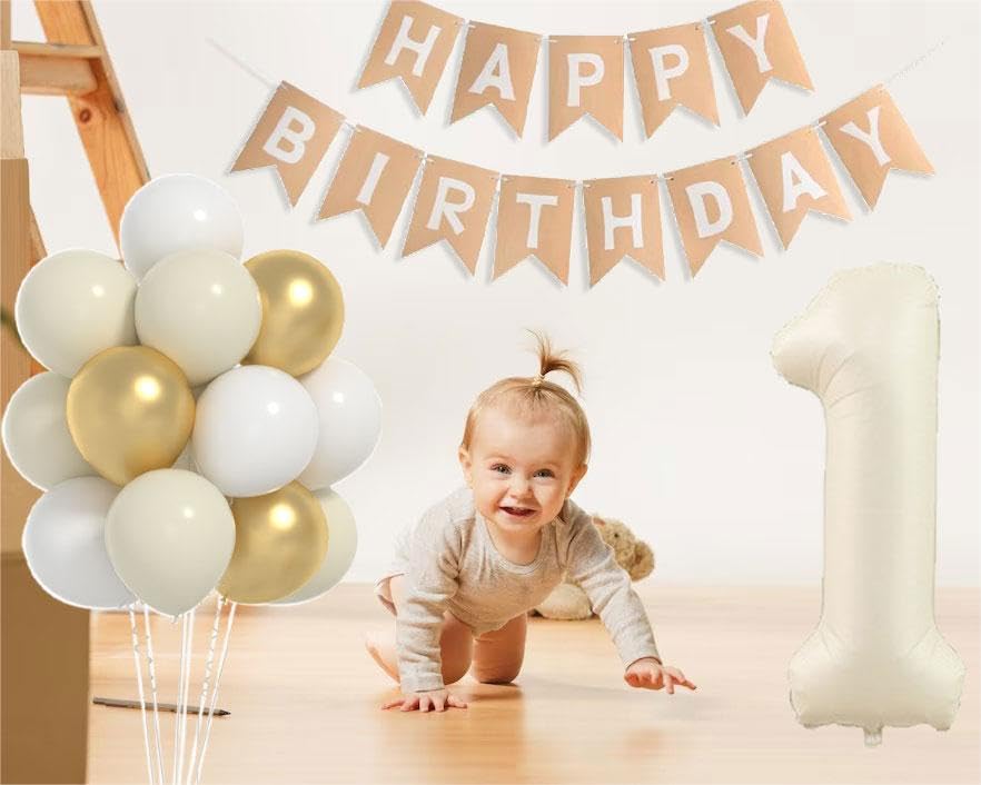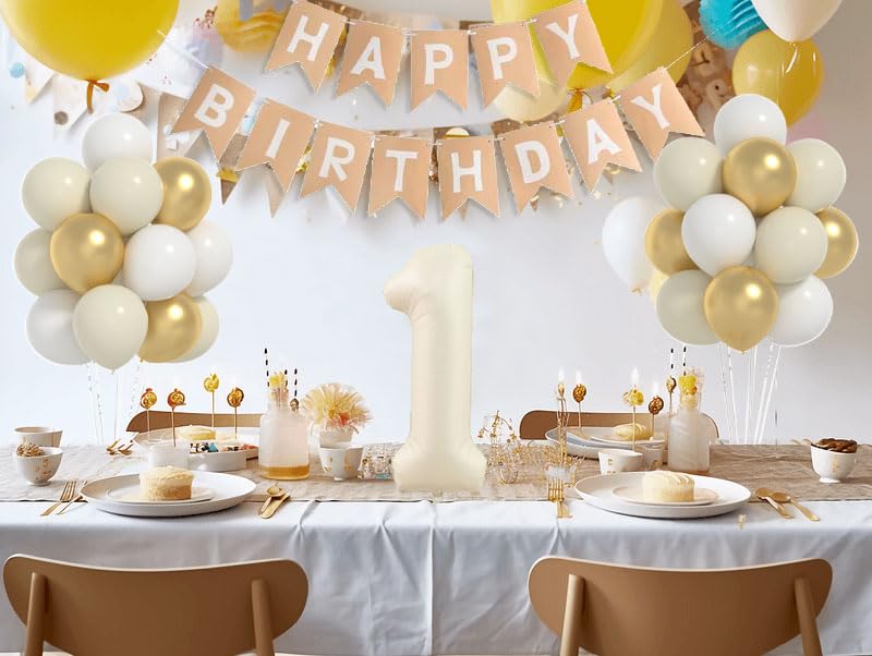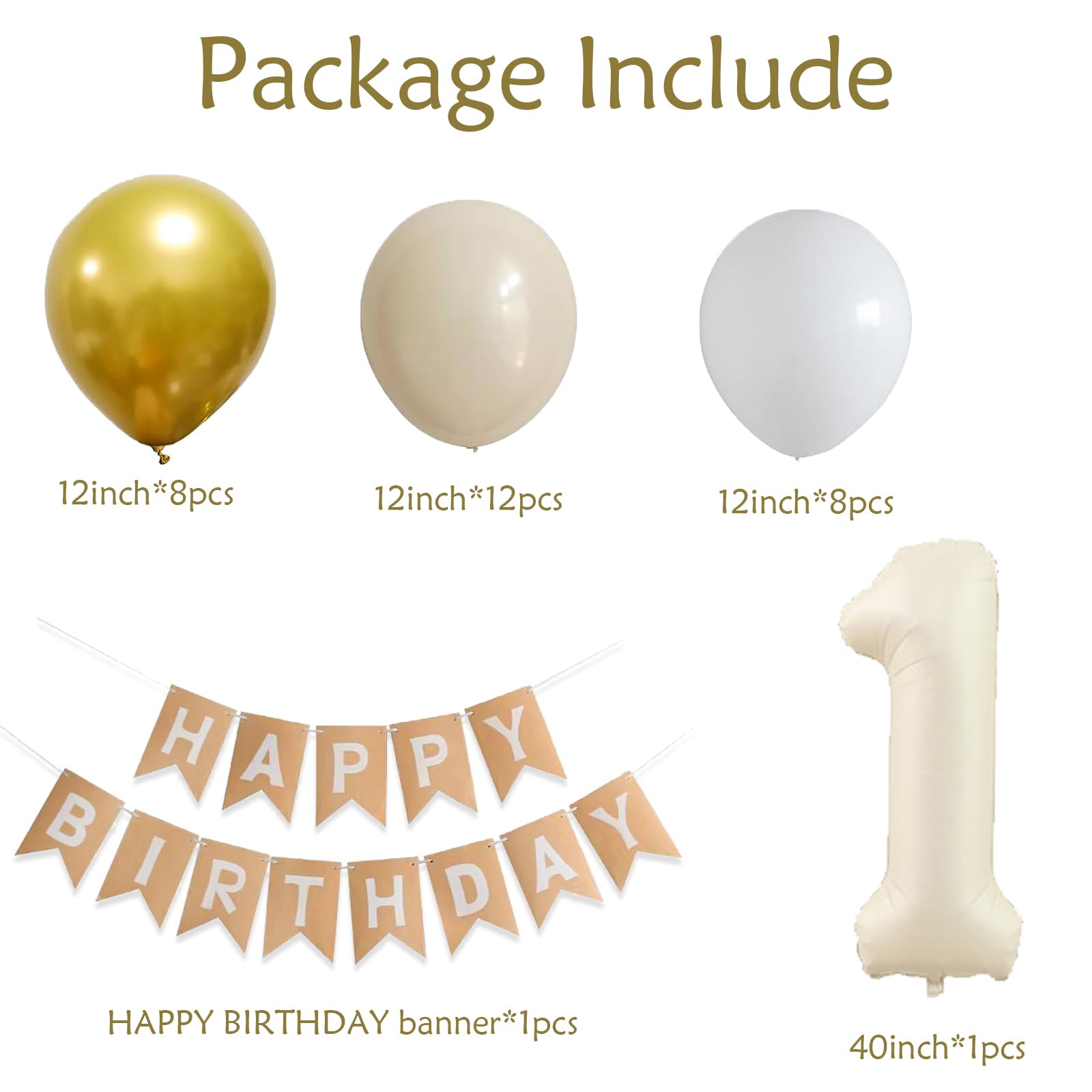 【VALUABLE PACK】28pcs One Balloon for First Birthday Kit include: 40inch cream white 1 balloon,sand white HAPPY BIRTHDAY banner,12pcs 12inch sand white balloons, 8pcs 12inch gold balloons, 8pcs 12inch white balloons.