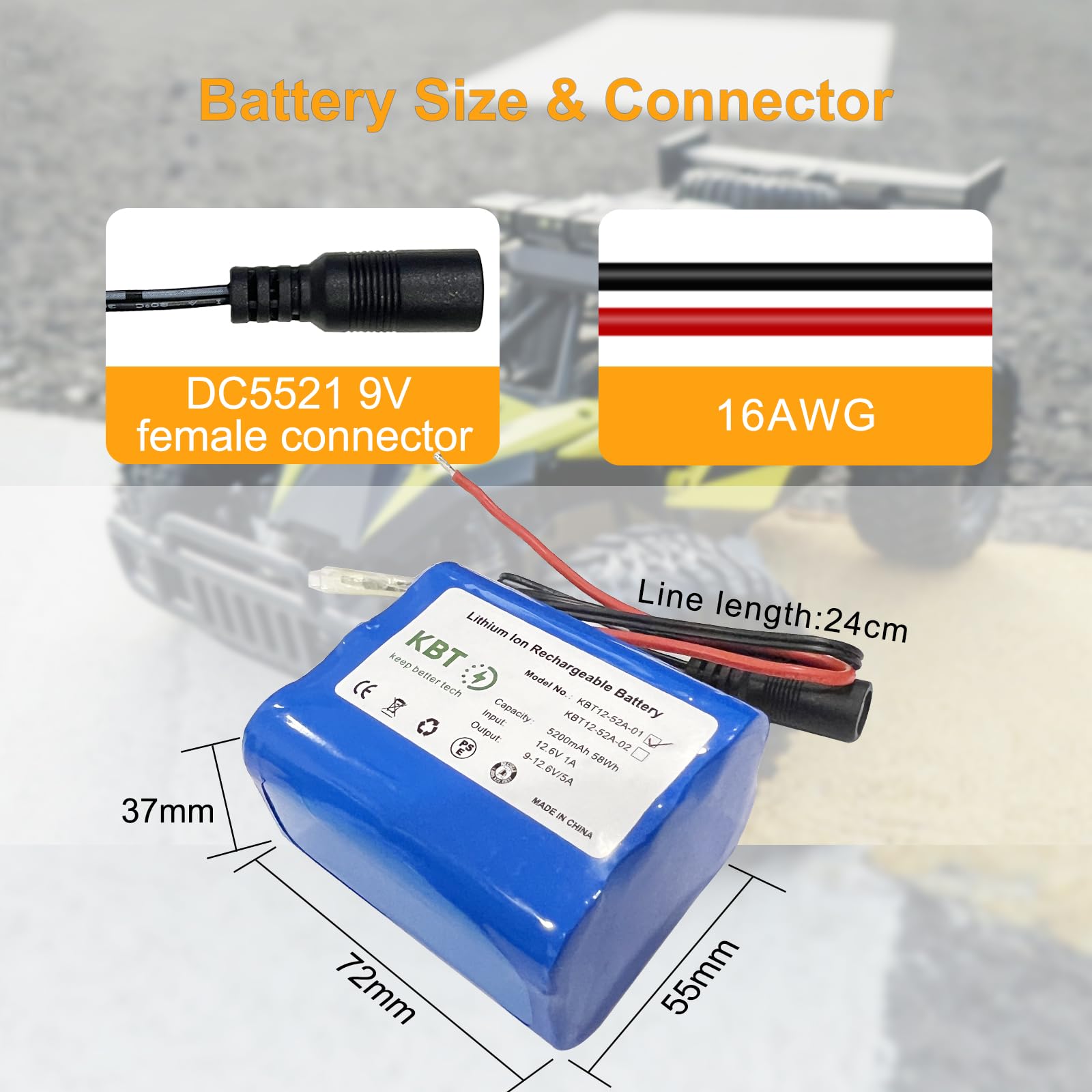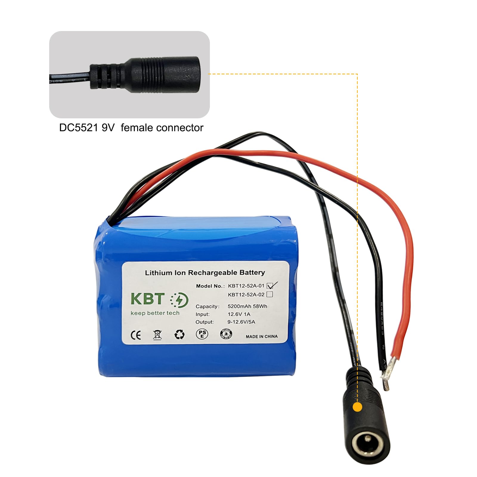 Package includes: 1*12V 5200mAh battery pack, 1*12V battery charger, 1* cable connector. Battery pack size 70*55*40mm (L*W*T), battery weight about 295g, battery cable length 18cm, 12V charger cable length 90cm.