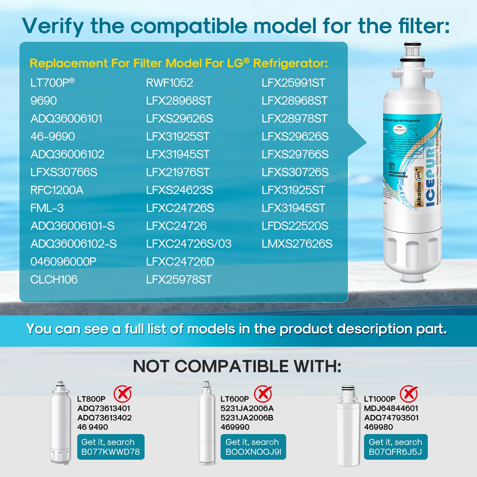 Compatible Model - Compatible with Cartridge ADQ36006101-S, ADQ36006101S, ADQ36006102-S, ADQ36006102S, OEM LT700PC, LT700PCS, KENMORECLEAR / SEARS Premium 46-9690, OnePurify RFC1200A RFC 1200A, ICEPURE RWF1200A, Water drop WD-LT700P, Pure Line PL-500 PL500, PUREPLUS PP-RWF1200A, GOLDEN ICEPURE, WATER SENTINEL WSL-3, HDX FML-3, Tier1 RWF1052, Refresh R-9690, Denali Pure WF-LT700P, K&J KJ700, Aqua Fresh WF700, PureH2o PH21410, Mist CWMF041. Air Filter: ADQ73214404, ADQ73334008, 46-9918, 469918, 9918. Confirm before purchase.