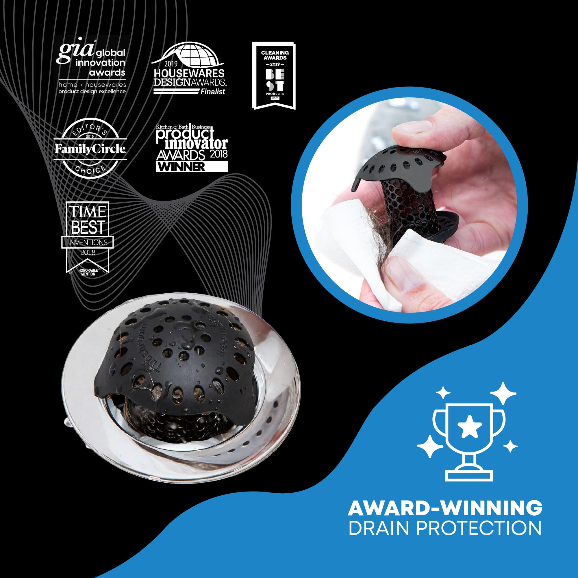 SUPERIOR DESIGN: Award-winning TubShroom Ultra fits inside standard tub drains, efficiently collecting hair around its innovative cylindrical body for easy cleanup