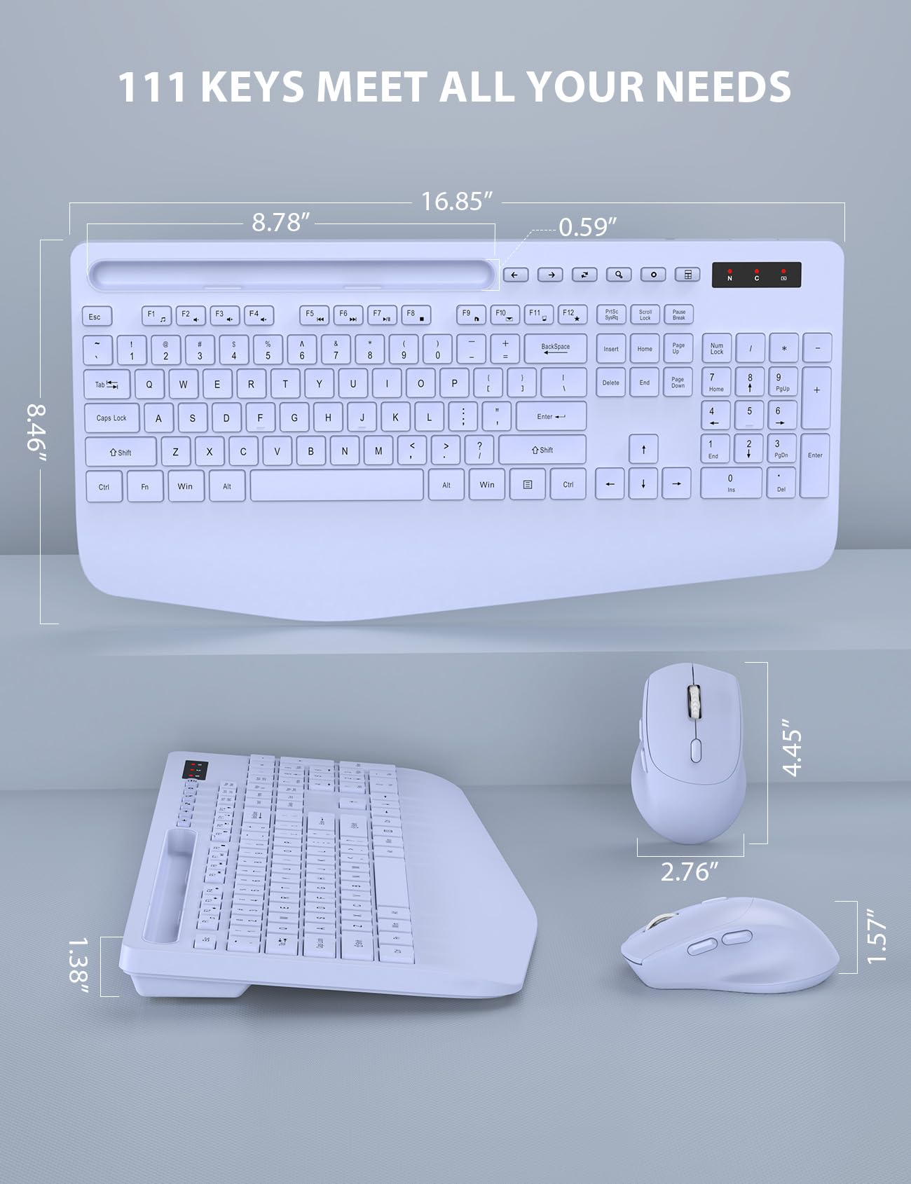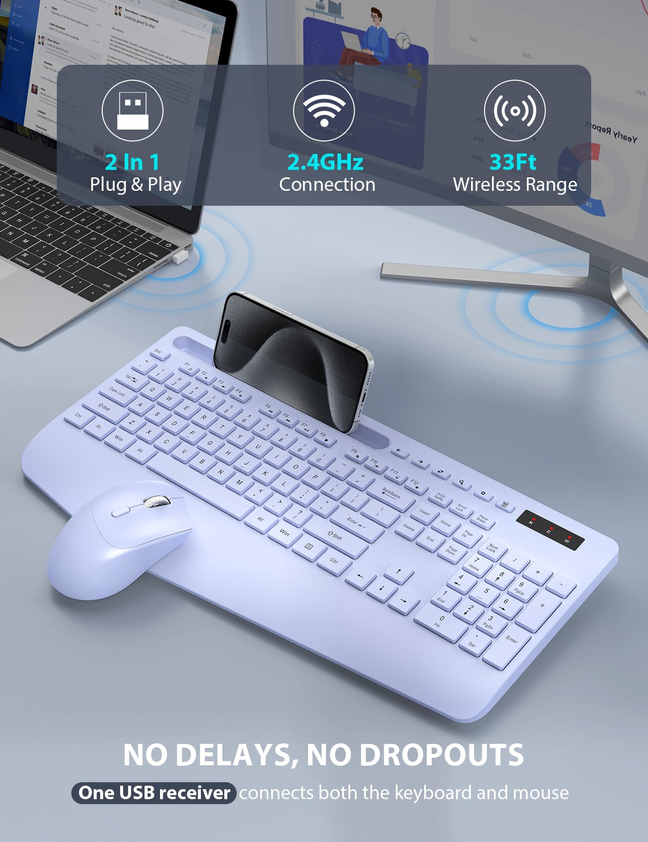 FULL-SIZE KEYBOARD WITH HOLDER - Even when working with this keyboard mouse combo, you'll never miss any messages from your phone, since the built-in cradle can prop up your phone or tablet at a perfect angle to read or watch videos.