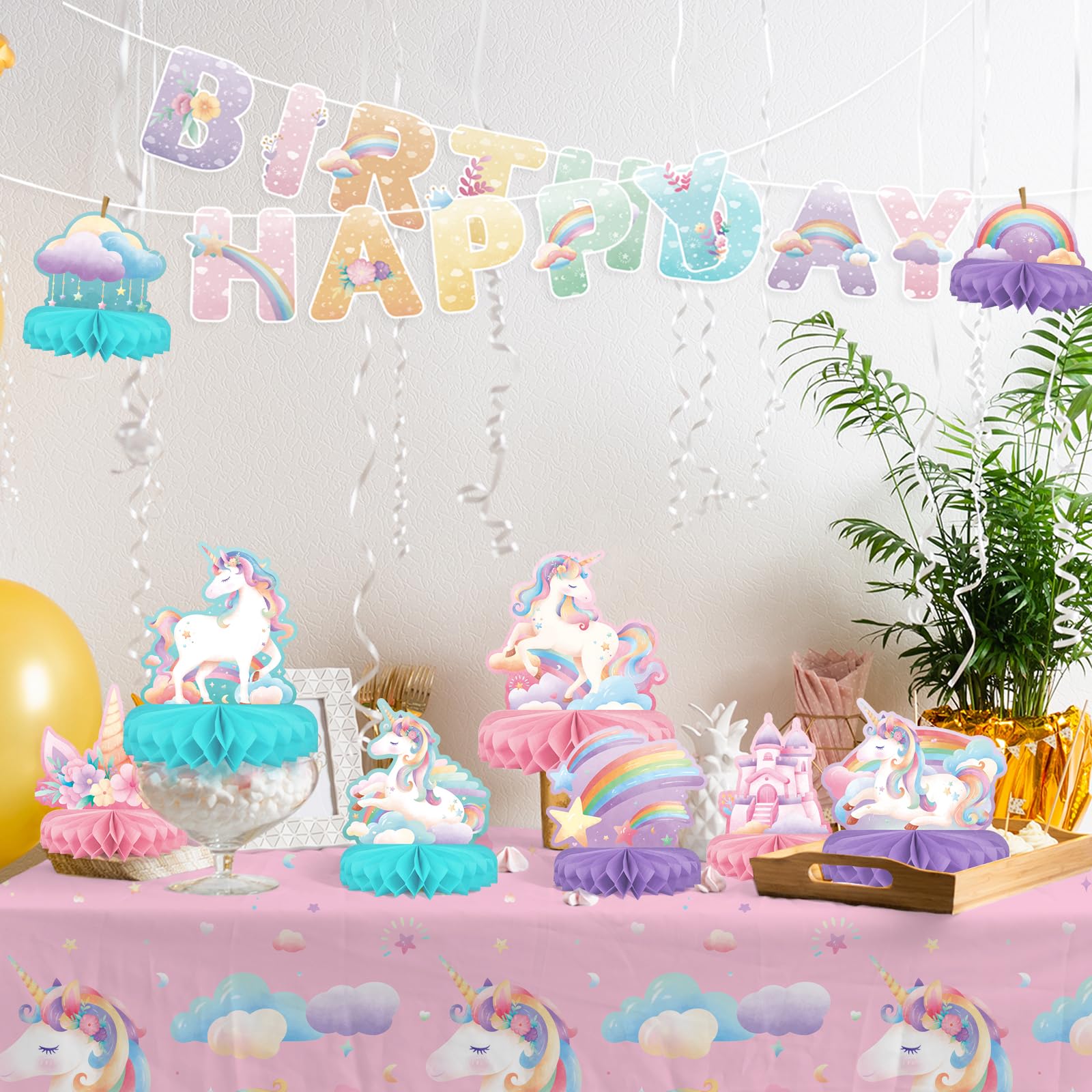 A Birthday to Remember: Complement your celebration with our unicorn birthday party supplies, designed to intertwine seamlessly with your party theme. These rainbow and unicorn table decorations, including the eye-catching honeycomb centerpiece, pledge to envelop your event in the heartwarming ethos of unicorn magic. Dive into a setting that makes every birthday not just a party, but a memorable adventure in a rainbow-unicorn wonderland.