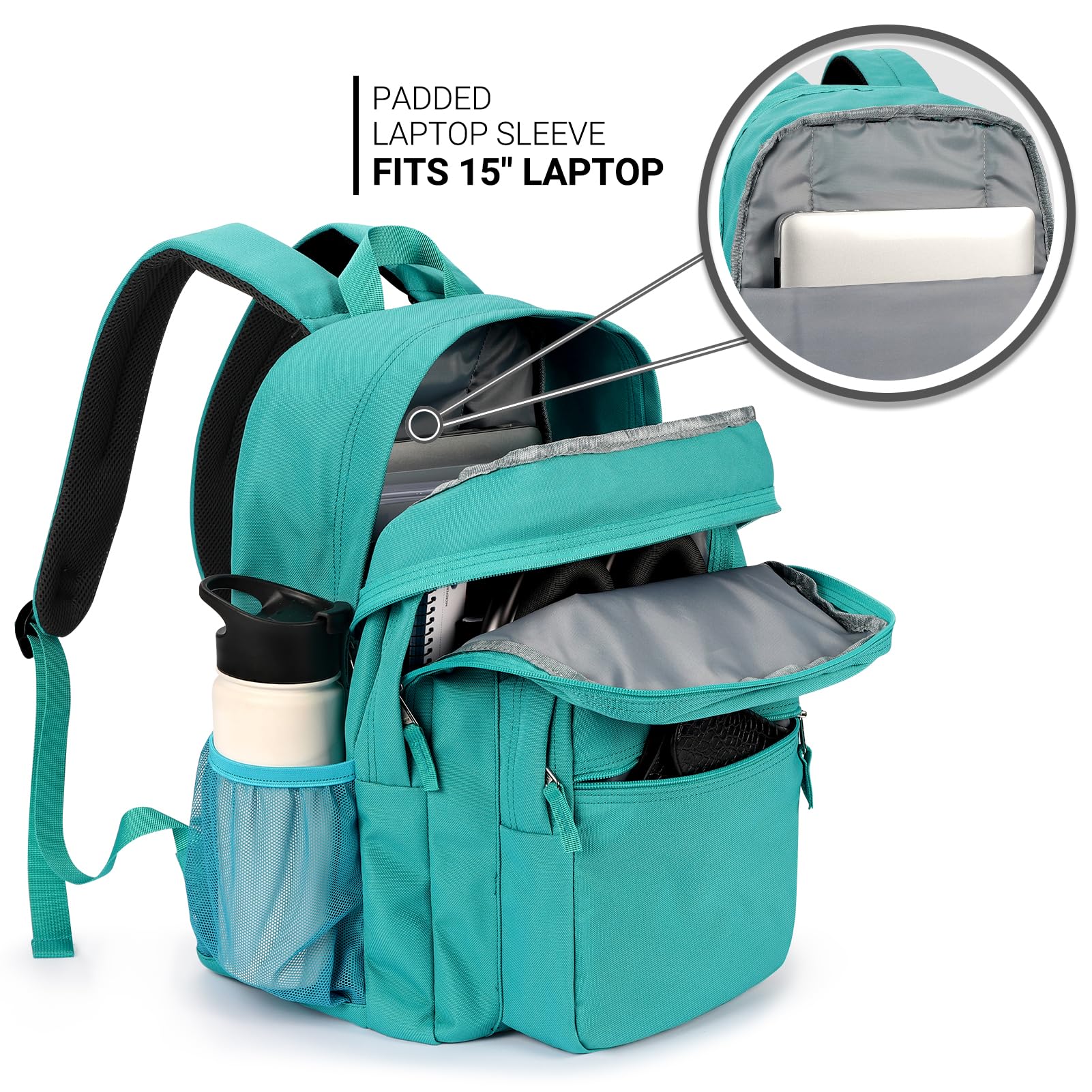 Convenient Storage Backpack: Our unisex laptop backpack features two main compartments, including a dedicated laptop sleeve for up to 15.6" devices. It also boasts a discrete front stash pocket, a utility pocket with an integrated organizer, and an additional external zippered pouch for quick access. Plus, two side pockets accommodate various water bottle sizes.