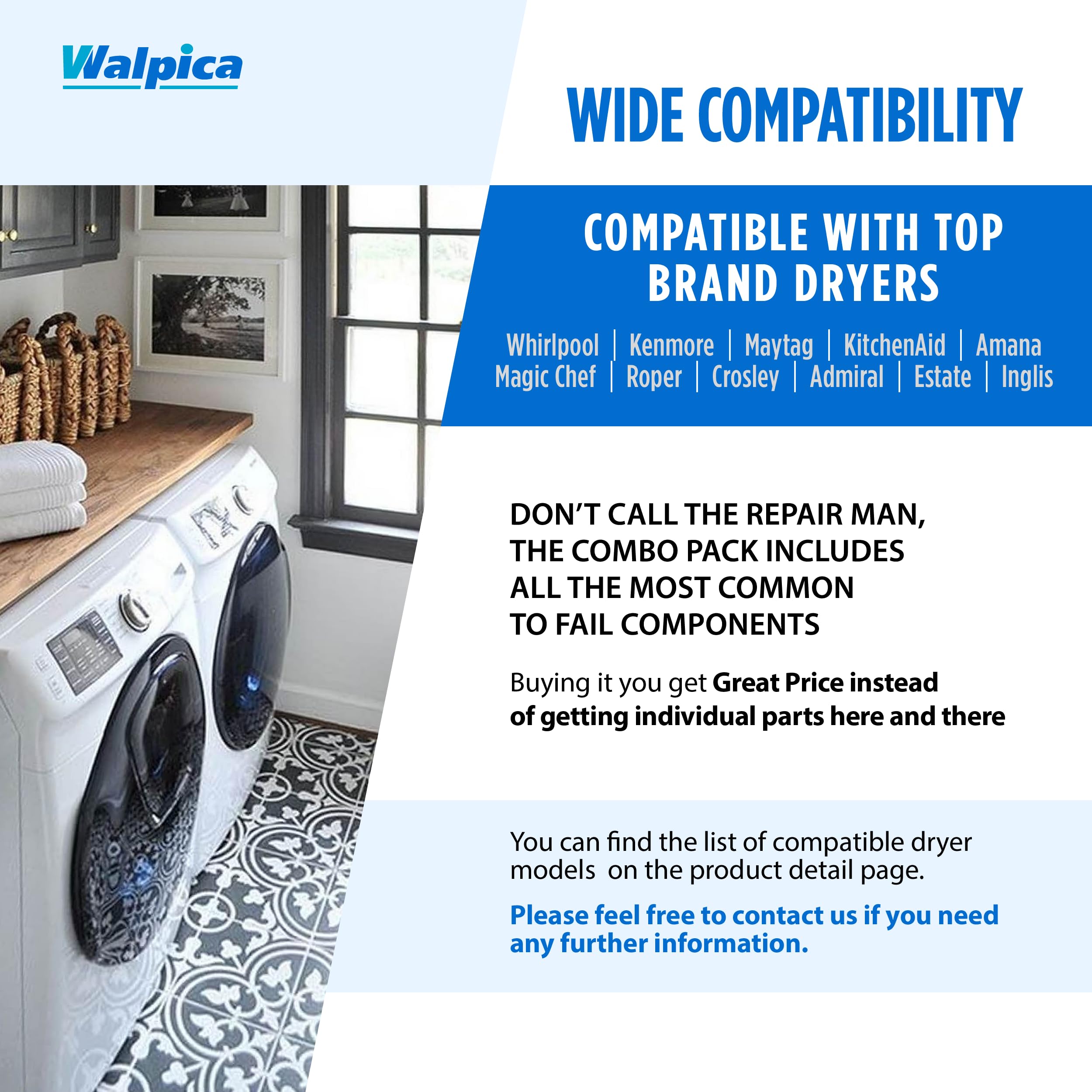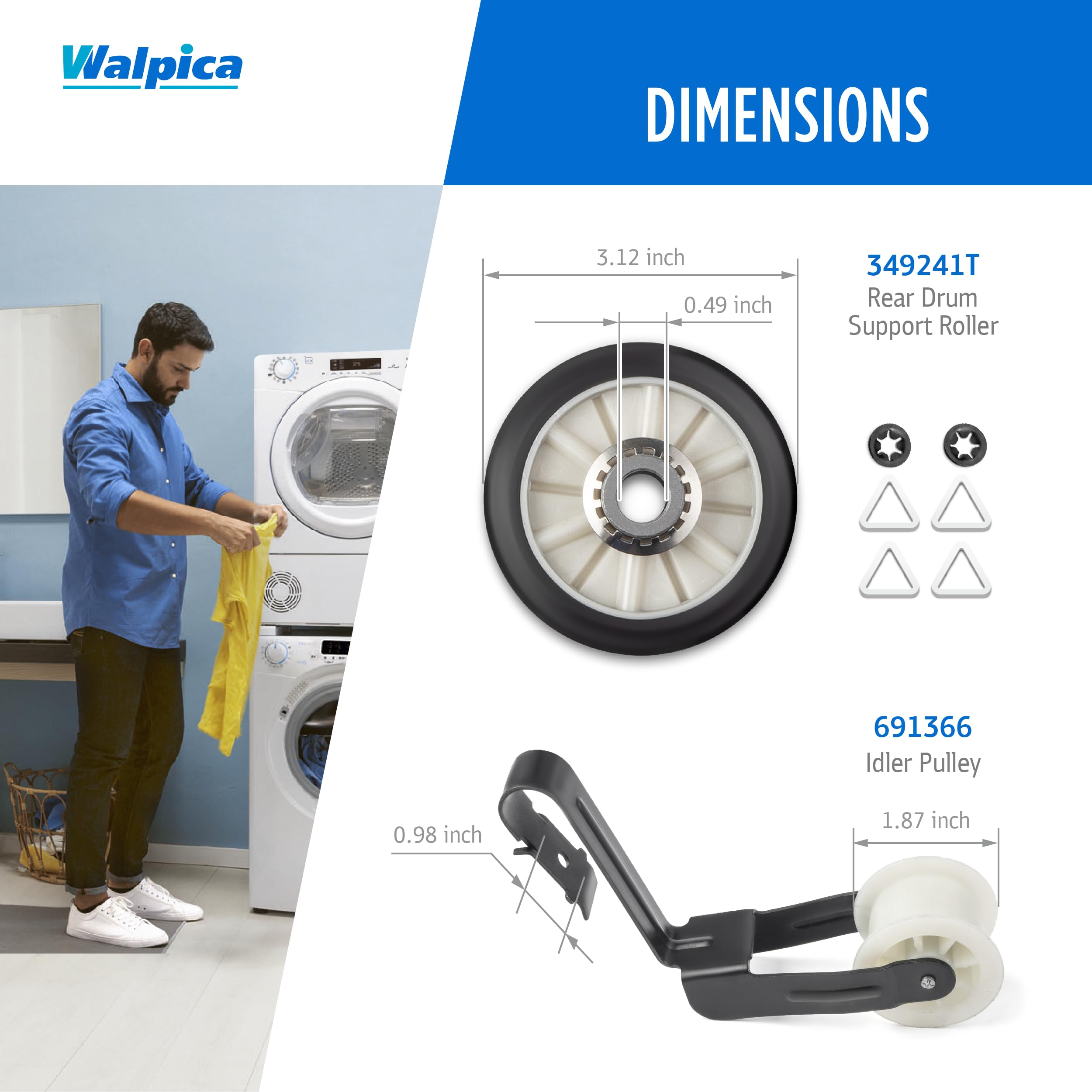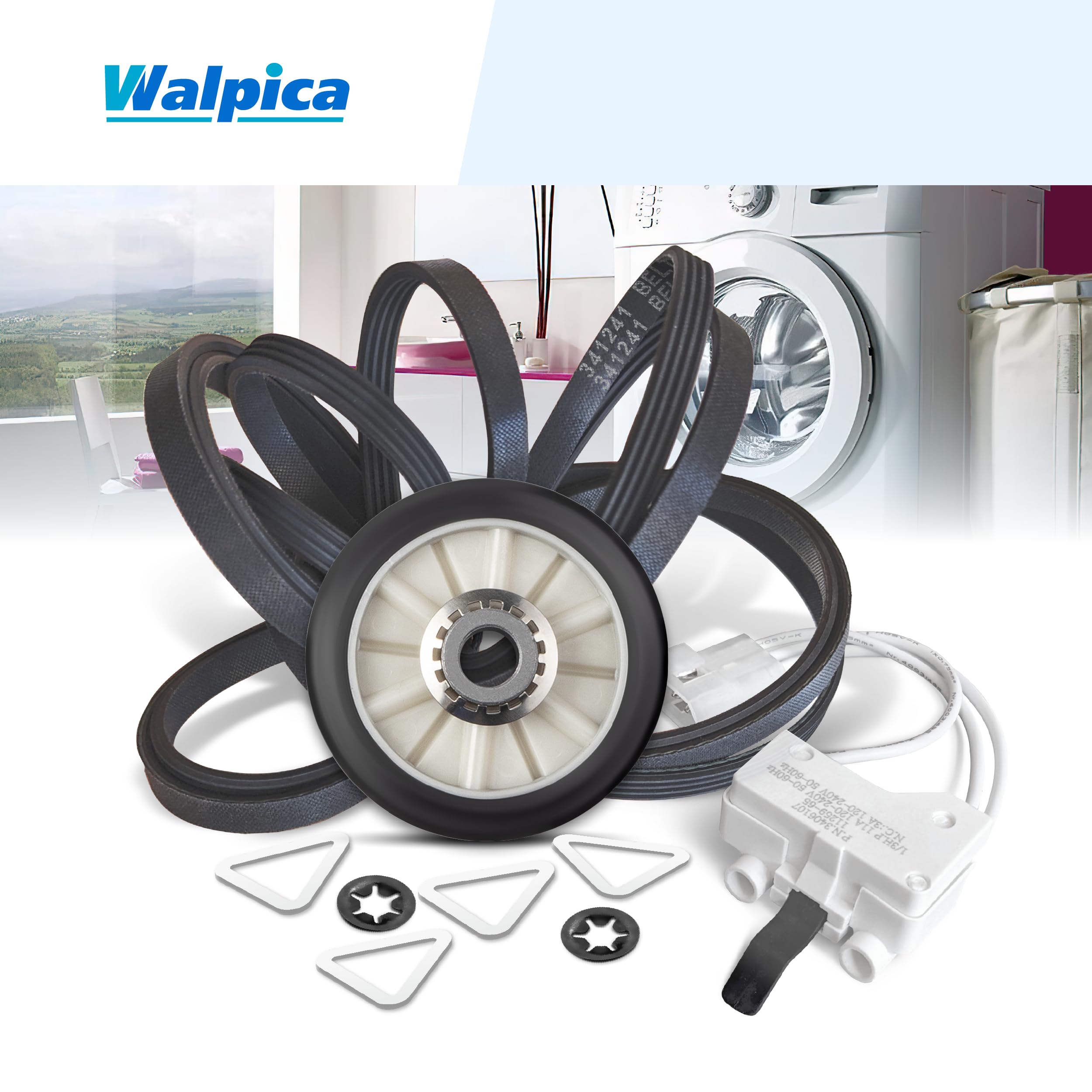 Includes: -- Dryer Repair Kit 4392065 + Dryer Door Switch 3406107 -- as follows: -- 2 Pcs Dryer Drum Roller 349241T + Dryer Drive Belt 341241 + Dryer Idler Pulley WP691366 + Dryer Door Switch 3406107 -- Dryer Repair Maintenance Kit Replacement Parts (most 29 inch large capacity models)